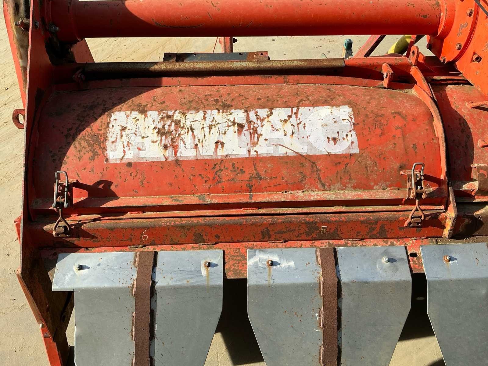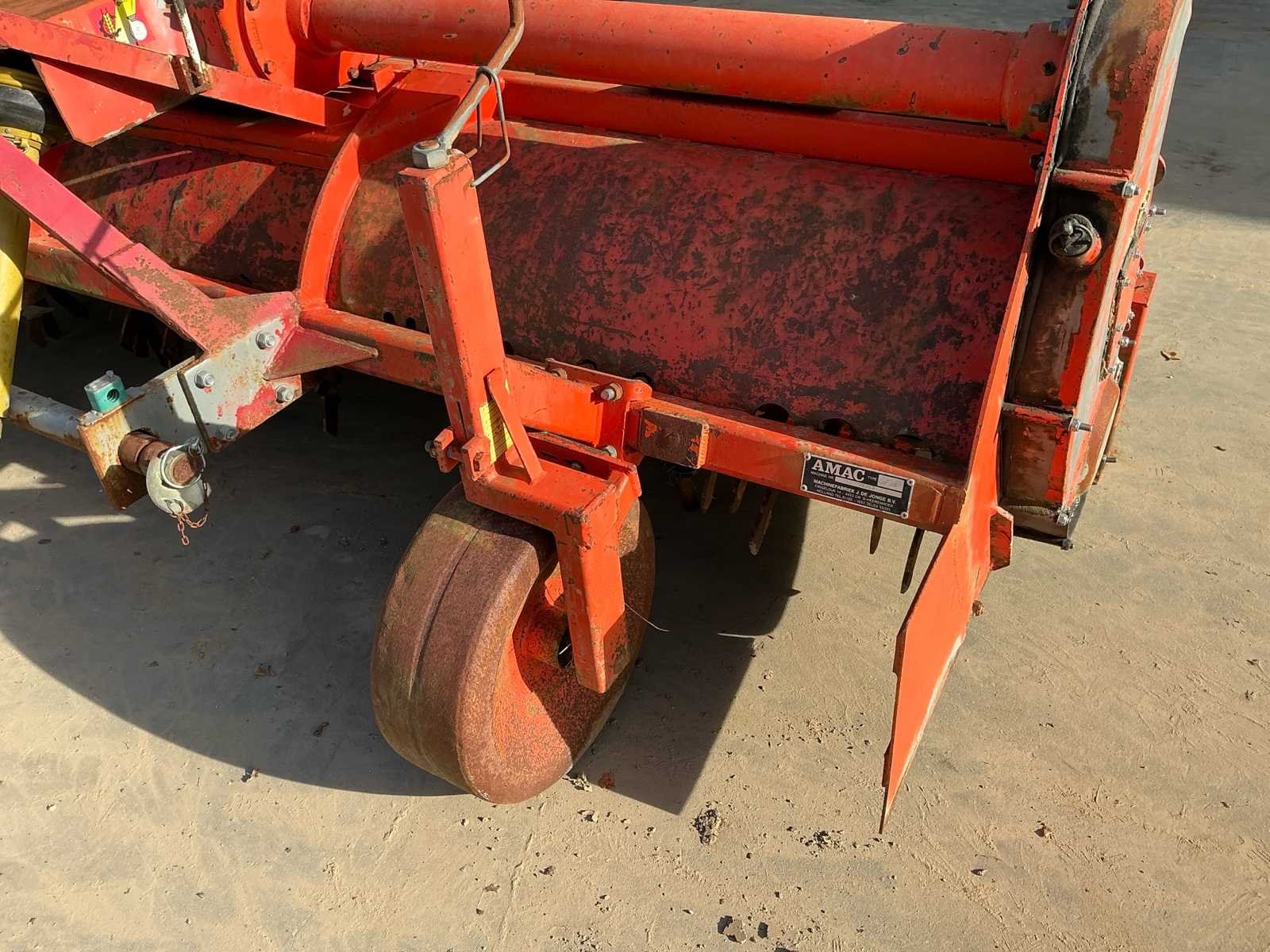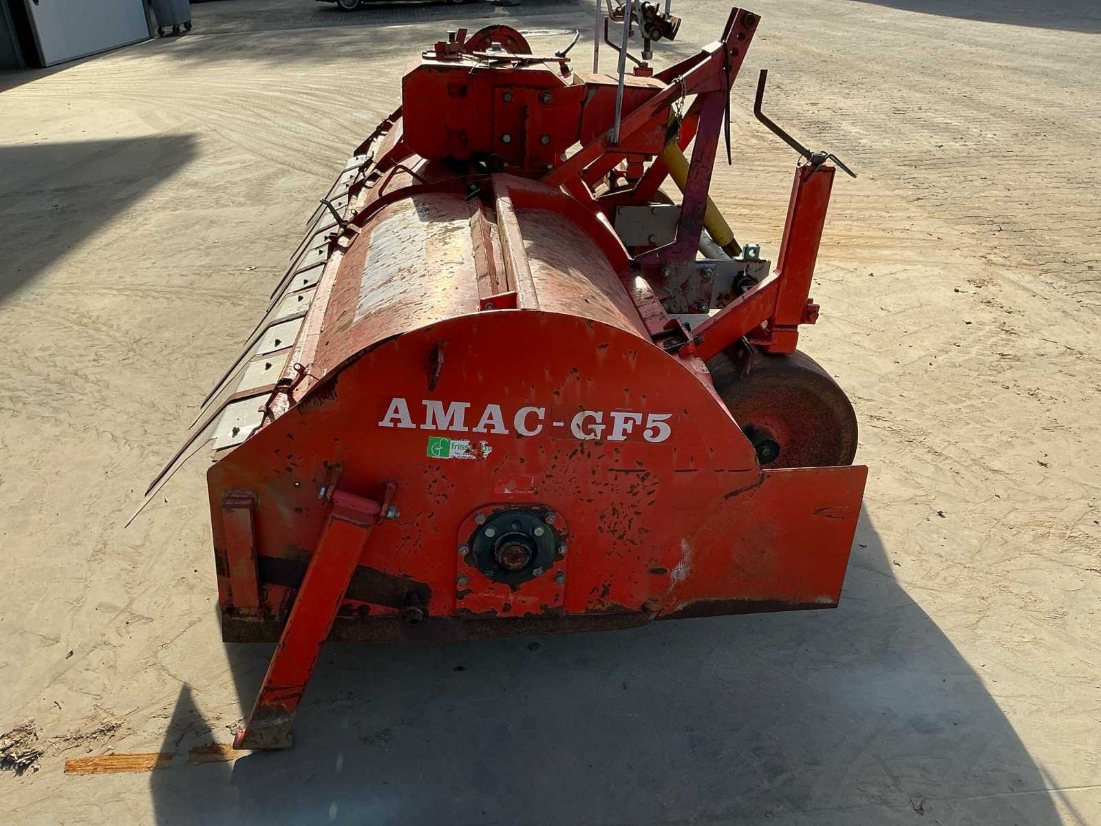 Voorzien van: aftakas, 3 punts ophanging, steunpoten, Röchling aandrijving, Amac GF5 rijenfrees met aanbouwspeedkappen, 1000 toeren aandrijfkast met schakelmogelijkheden/ versnellingen, dubbele traploos verstelbare dieptewielen, freeshaken, gebruikt voor witlofruggen., kappen uitgevoerd ruggen 500mm. Merk: Amac Type: GF-5 Serienummer: 70263 Werkbreedte: 3000mm Totale afmeting L: 1900mm Totale afmeting Breedte: 3400mm Totale afmeting Hoogte: 1400mm