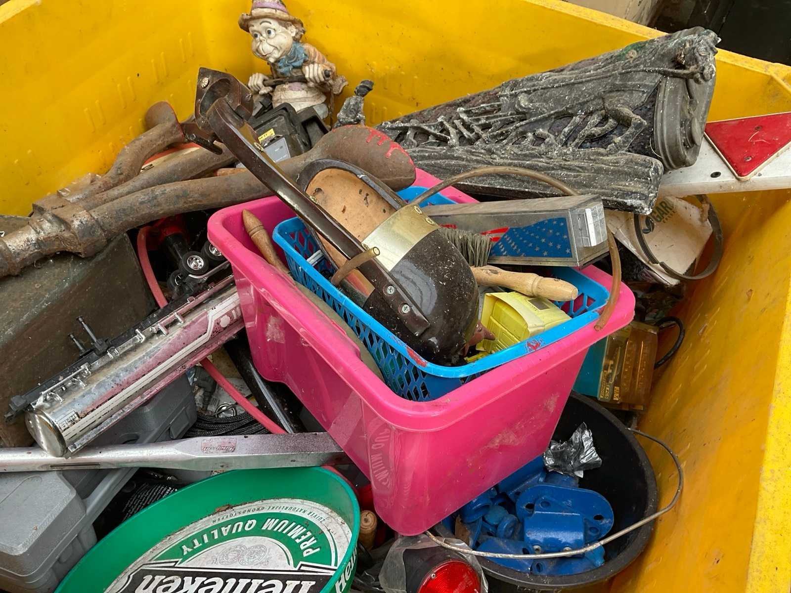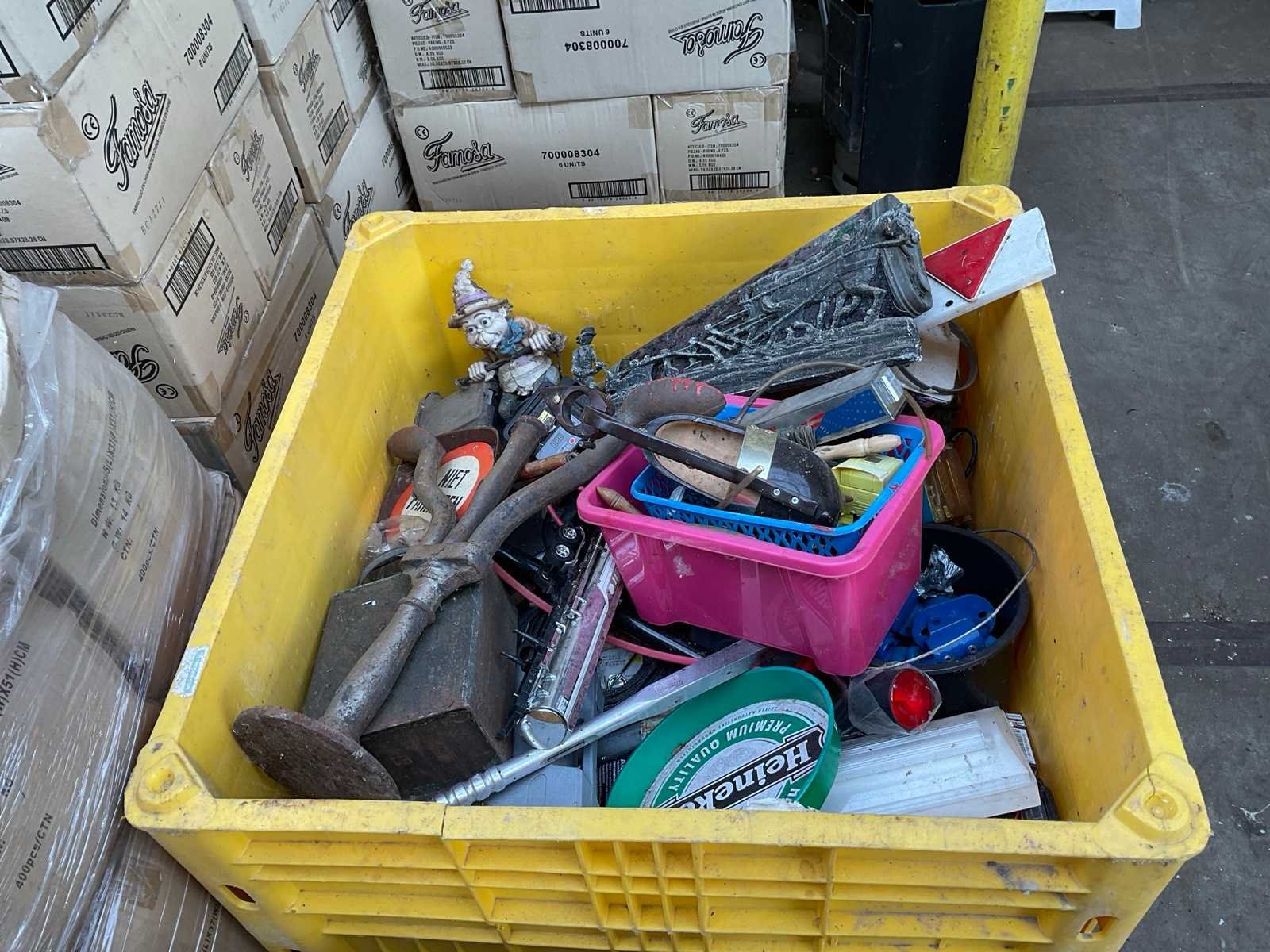1 kist met divers materiaal: Snap- on momentsleutel, fietspomp, multimeter, decoratiemateriaal, Etc.