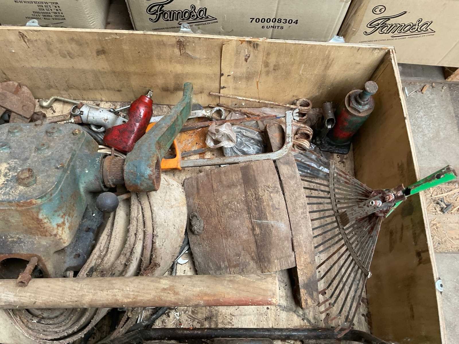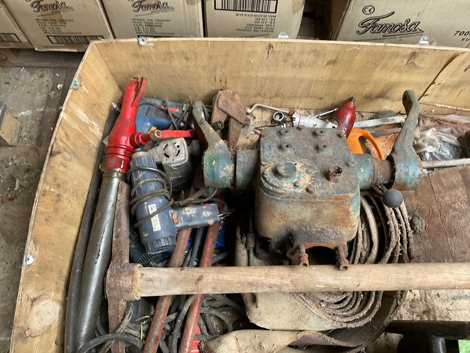 1 kist met divers materiaal: handgereedschap, vatpomp, pikhouweel, etc.
