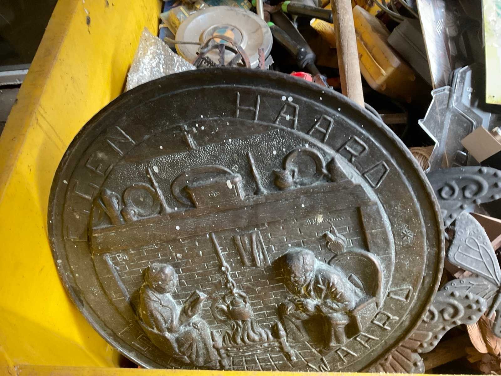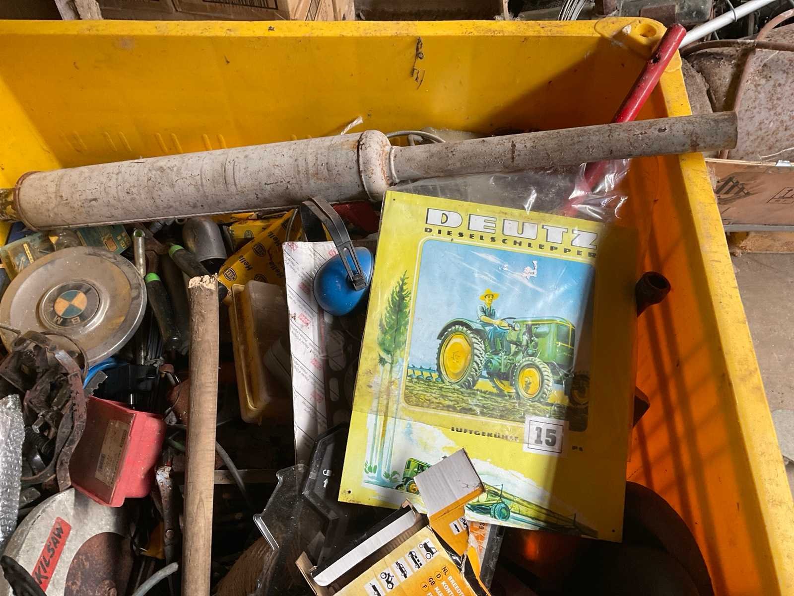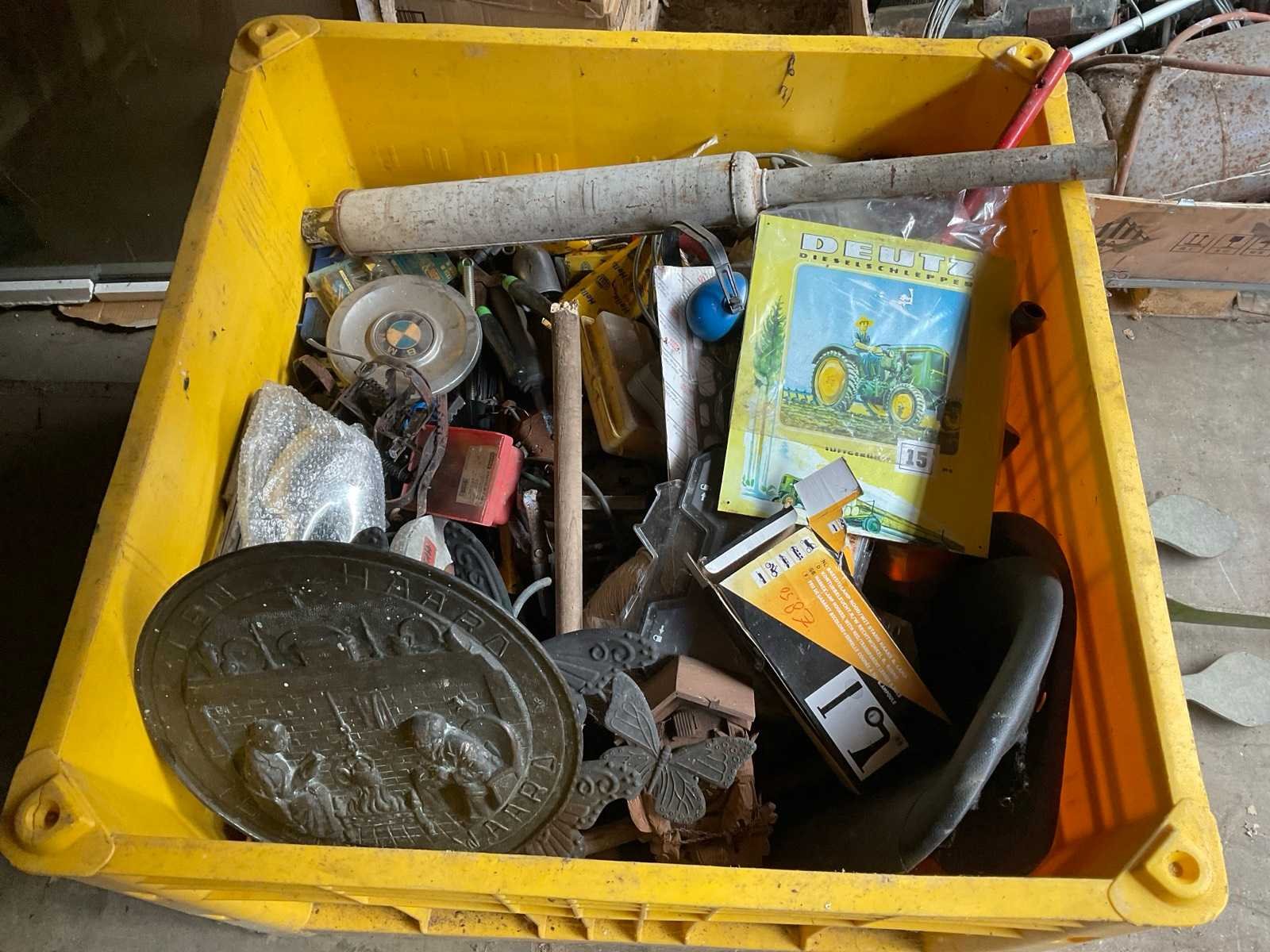 1 kist met divers materiaal: handgereedschap, decoatiemateriaal, onderdelen, etc.