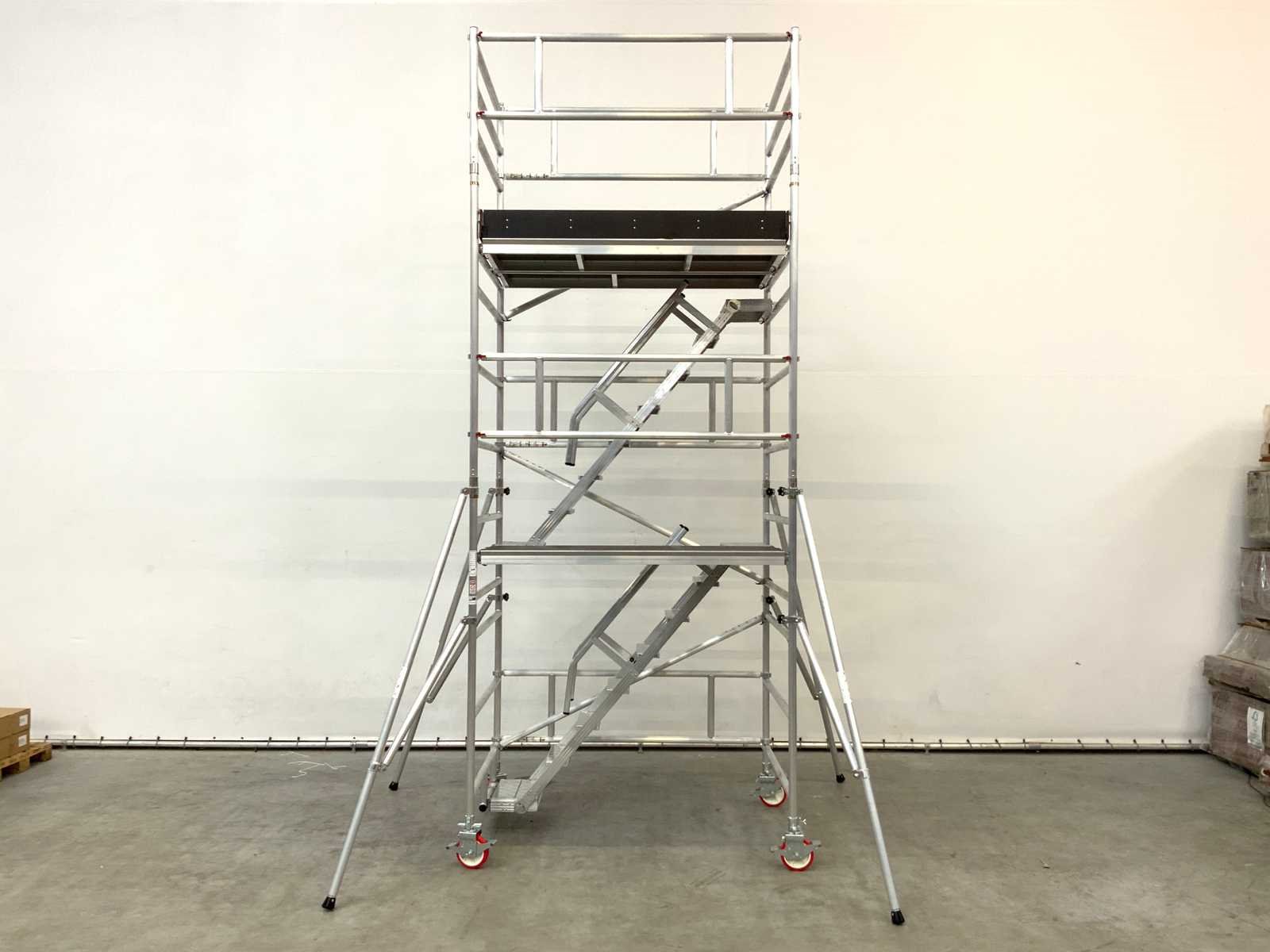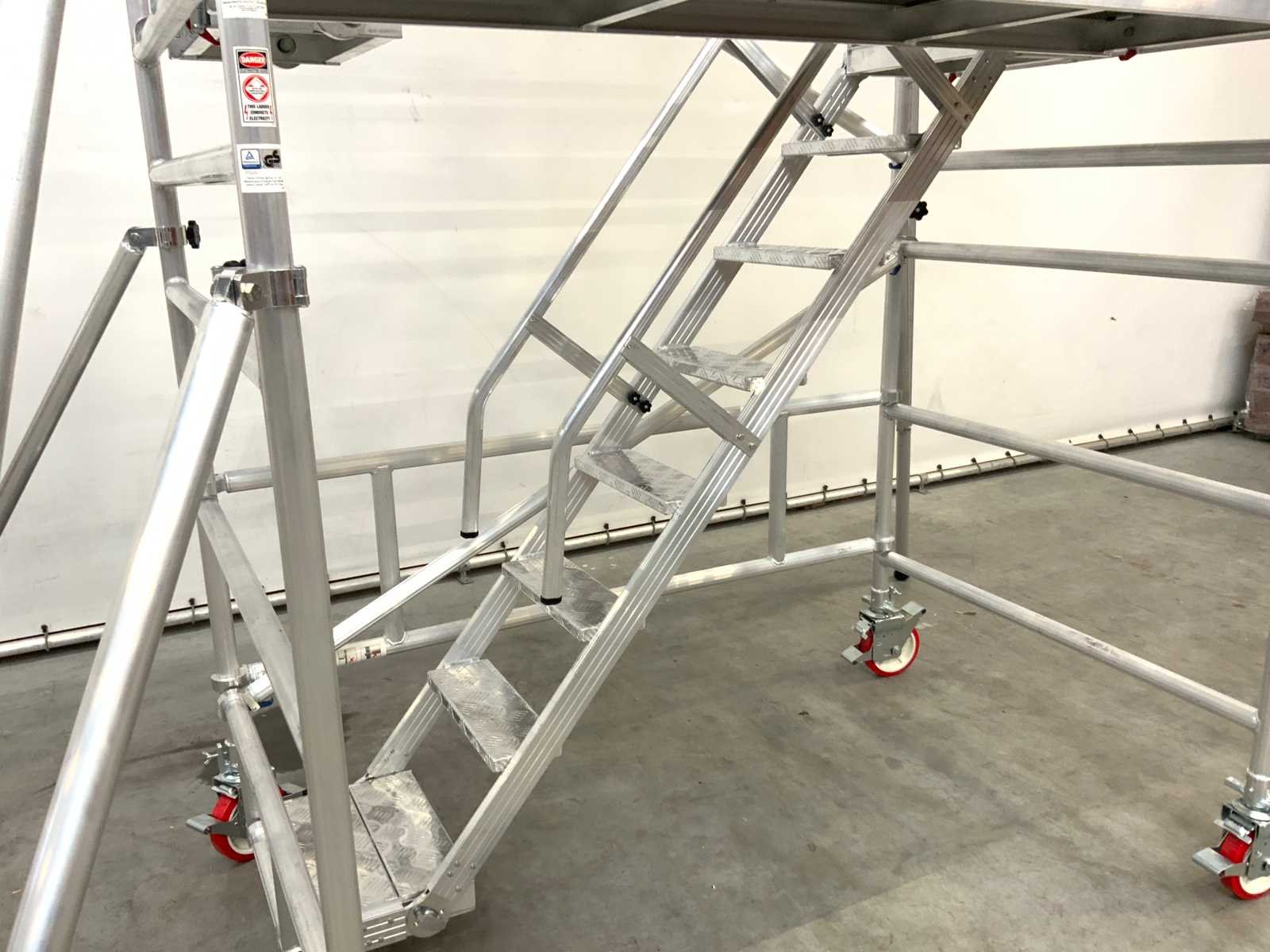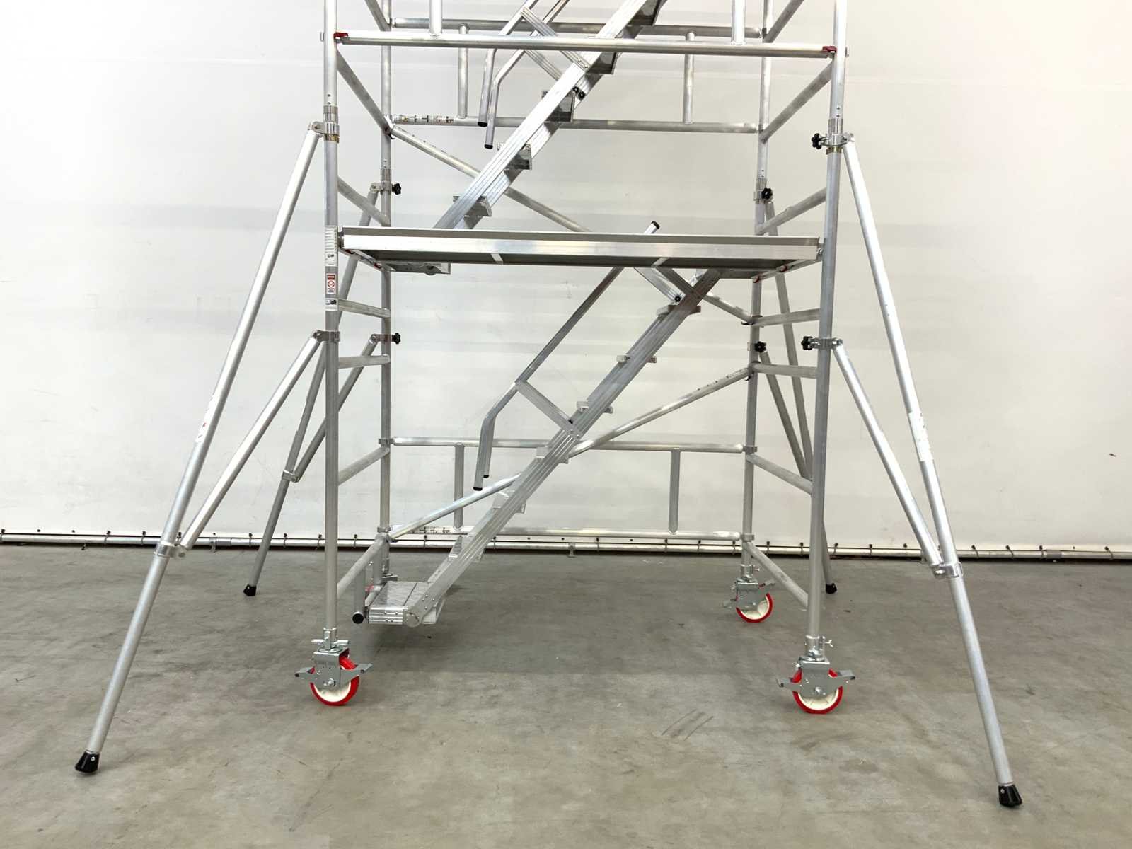 4 opbouwdelen van 1350x2150mm; 2 opbouwdelen 700mm; zwenkwielen met rem; easy click systeem; 2 trappen met leuning; 2 platformen met 1 Luik; veiligheid stickers; platform breedte zonder trap 600mm; 1ste platform hoogte 1985mm; 2de platform hoogte 3950mm; werkhoogte 6m; wordt uitgeleverd zonder stapelbok; 5970 Merk: RTE Bouwjaar: 2024 Afmeting l: 2080mm Afmeting b: 1350mm Afmeting h: 5200mm Aantal platforms: 2 Aantal platforms met luik: 1 Aantal diagonaalschoren: 3 Diagonale schoor lengte: 2250mm Aantal horizontaalschoren: 5 Horizontaal schoor lengte: 2080mm Kantplankenset: true Aantal wielen: 3 Aantal stabilisatoren: 4 Aantal leuningen: 5