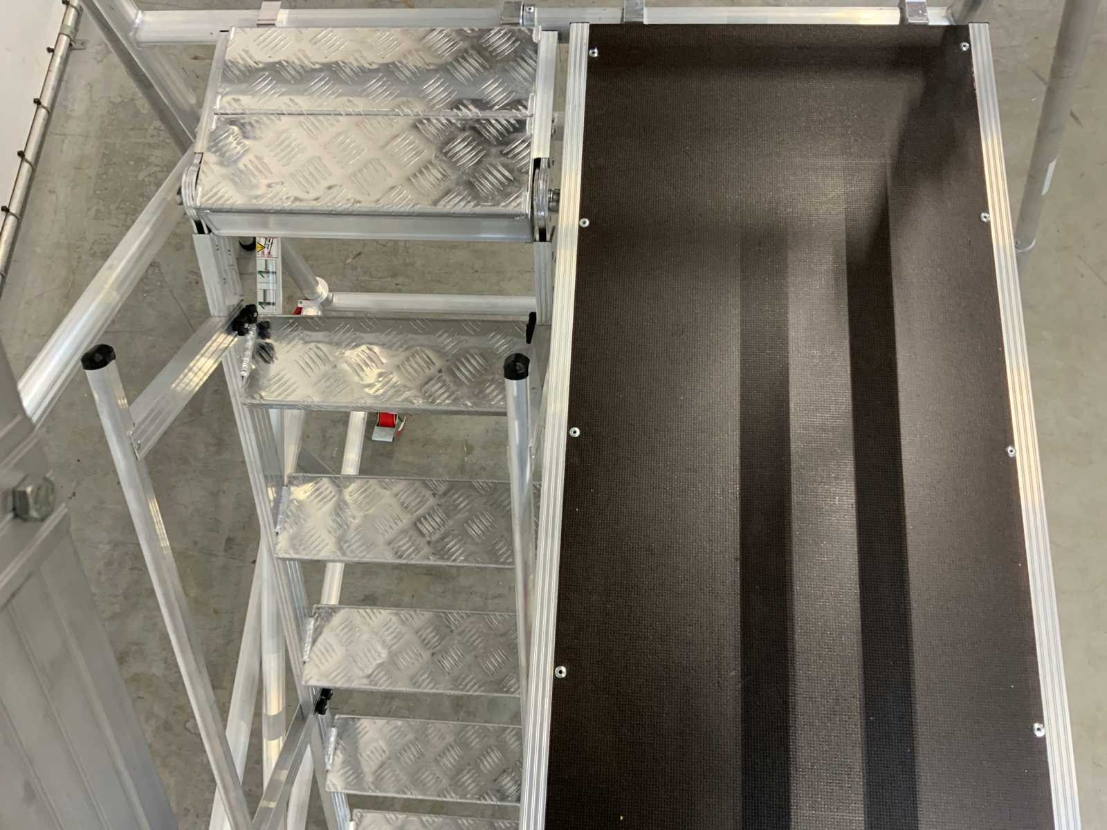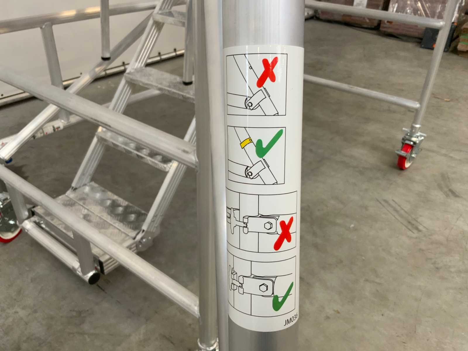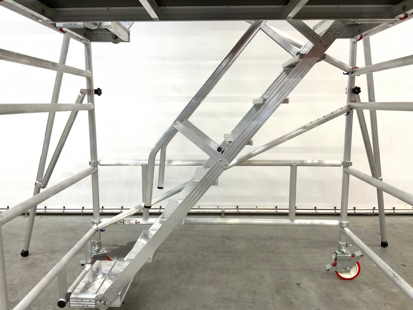 4 opbouwdelen van 1350x2150mm; 2 opbouwdelen 700mm; zwenkwielen met rem; easy click systeem; 2 trappen met leuning; 2 platformen met 1 Luik; veiligheid stickers; platform breedte zonder trap 600mm; 1ste platform hoogte 1985mm; 2de platform hoogte 3950mm; werkhoogte 6m; wordt uitgeleverd zonder stapelbok; 5970 Merk: RTE Bouwjaar: 2024 Afmeting l: 2080mm Afmeting b: 1350mm Afmeting h: 5200mm Aantal platforms: 2 Aantal platforms met luik: 1 Aantal diagonaalschoren: 3 Diagonale schoor lengte: 2250mm Aantal horizontaalschoren: 5 Horizontaal schoor lengte: 2080mm Kantplankenset: true Aantal wielen: 3 Aantal stabilisatoren: 4 Aantal leuningen: 5