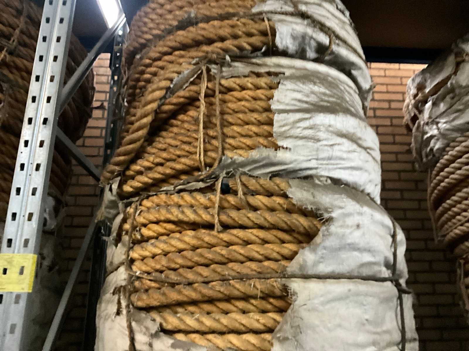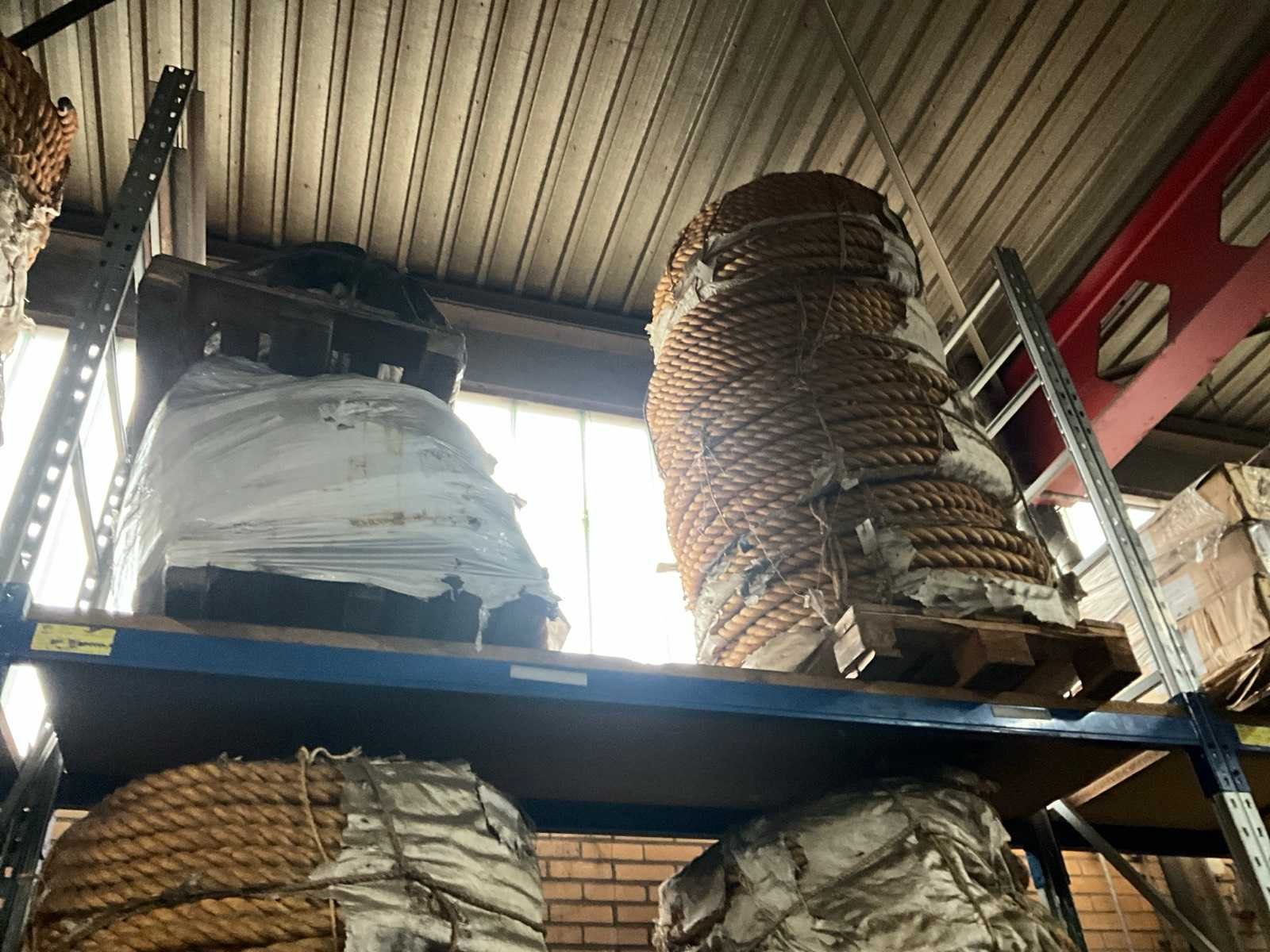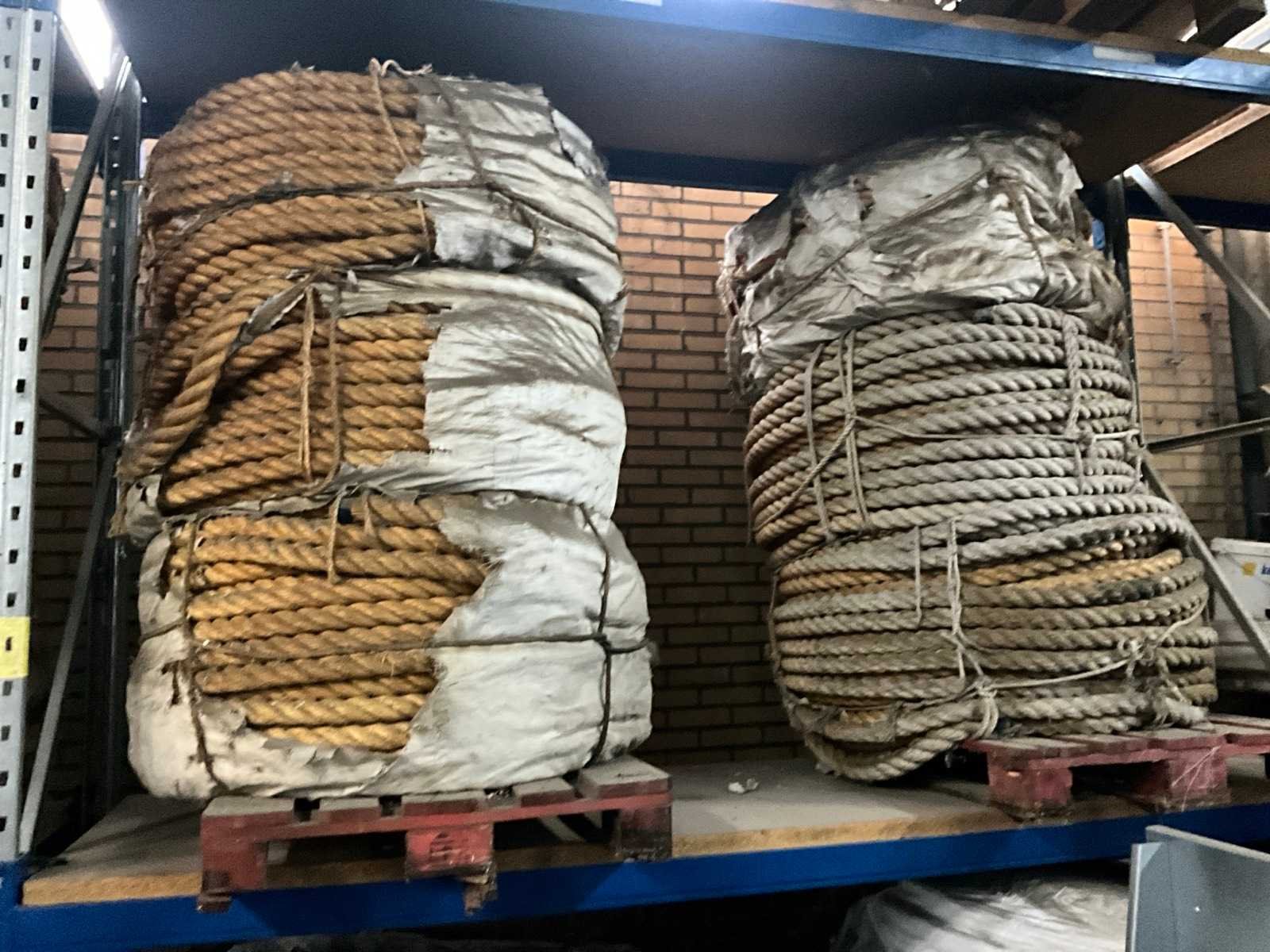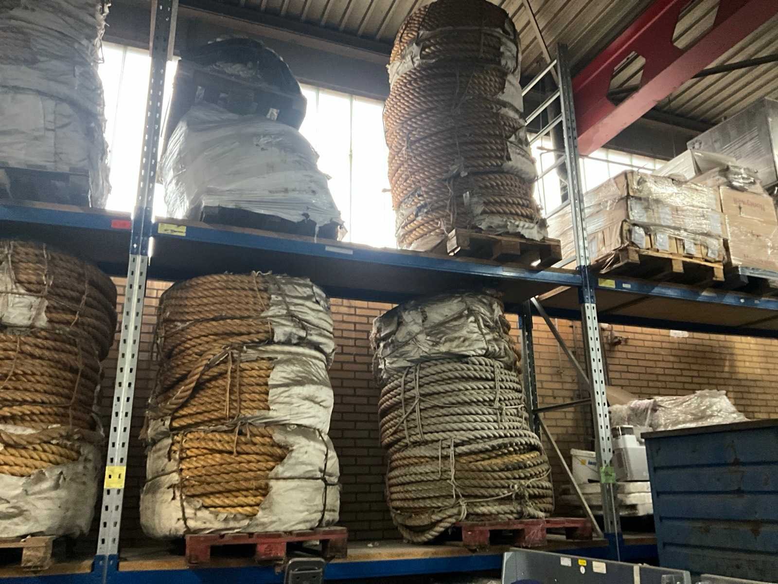 Bestaande uit circa 5x pallet met diverse diameters en lengtes scheepstouw, waaronder 3x pallet touw Ø circa 50 mm.