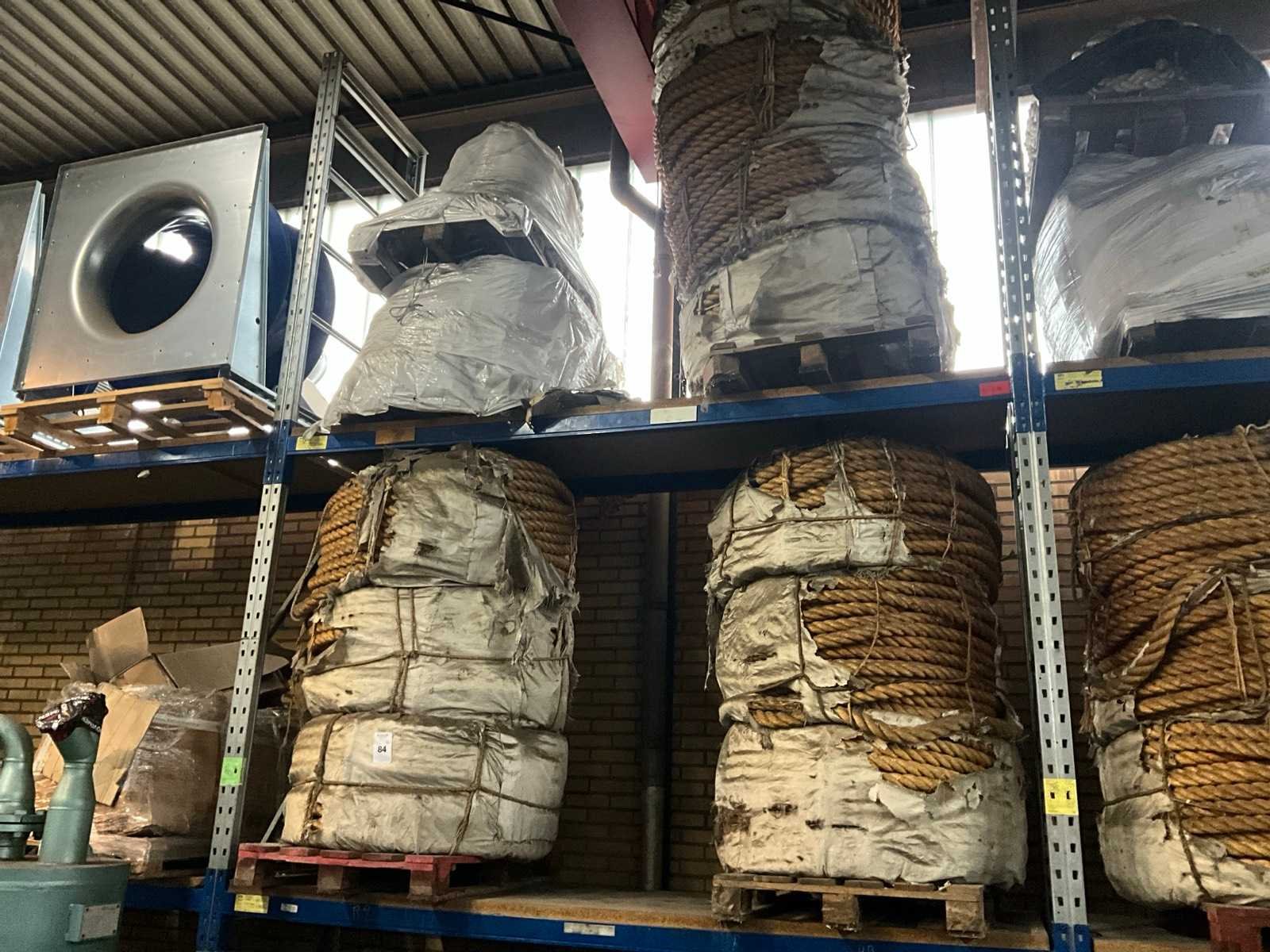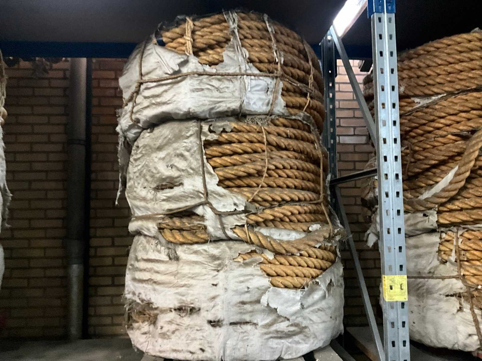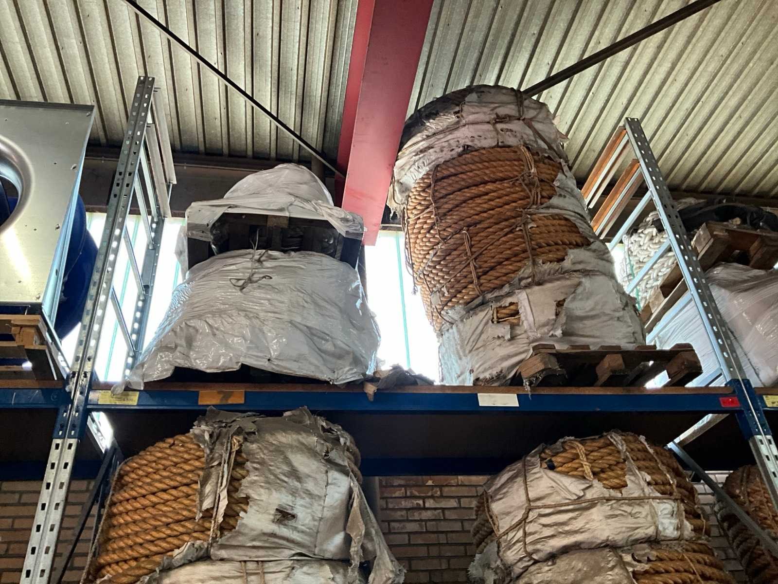 Bestaande uit circa 5x pallet met diverse diameters en lengtes scheepstouw, waaronder 3x pallet touw Ø circa 50 mm.