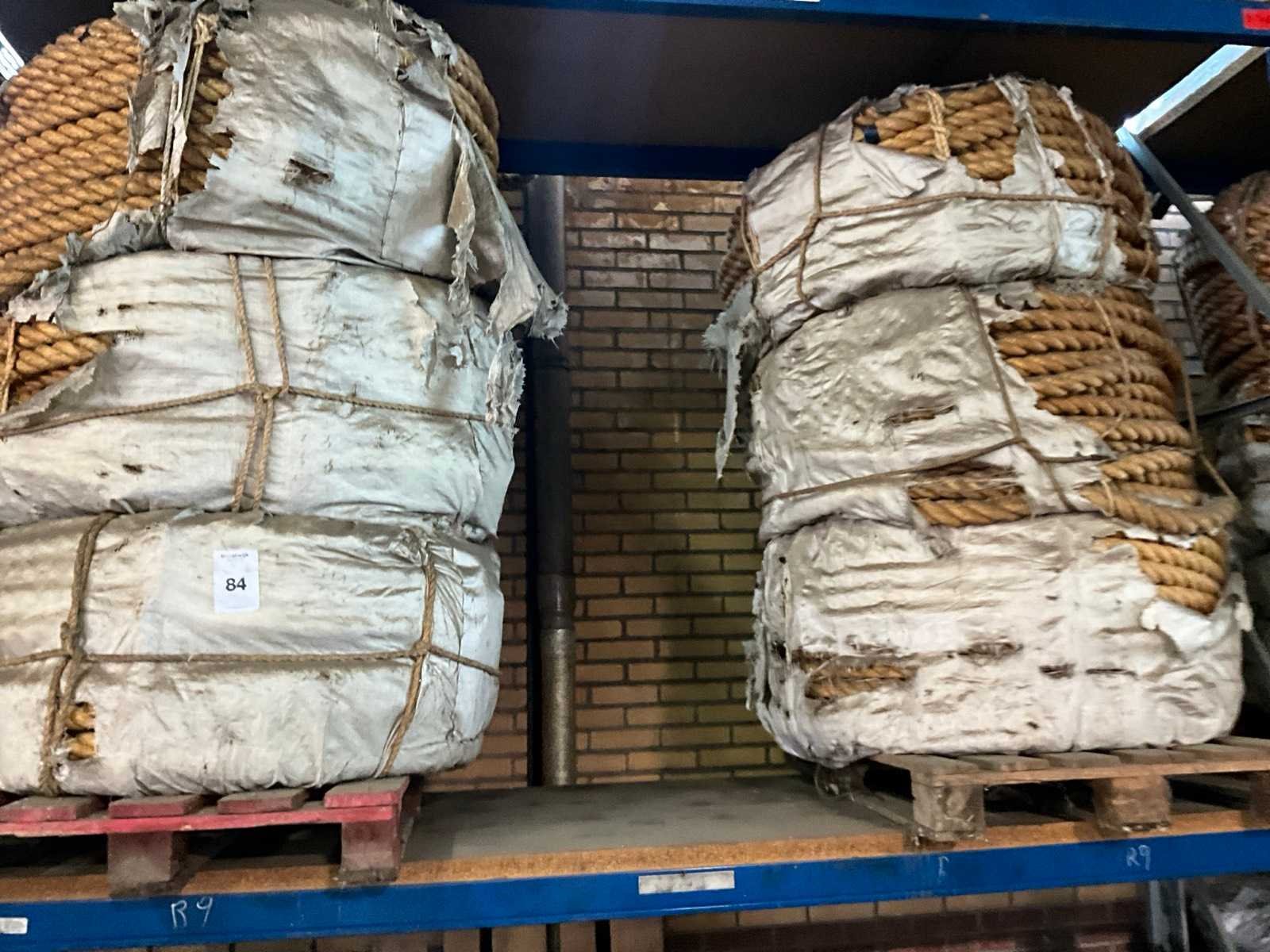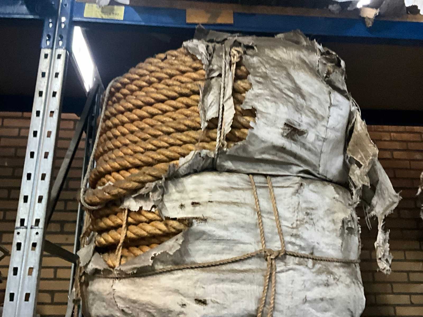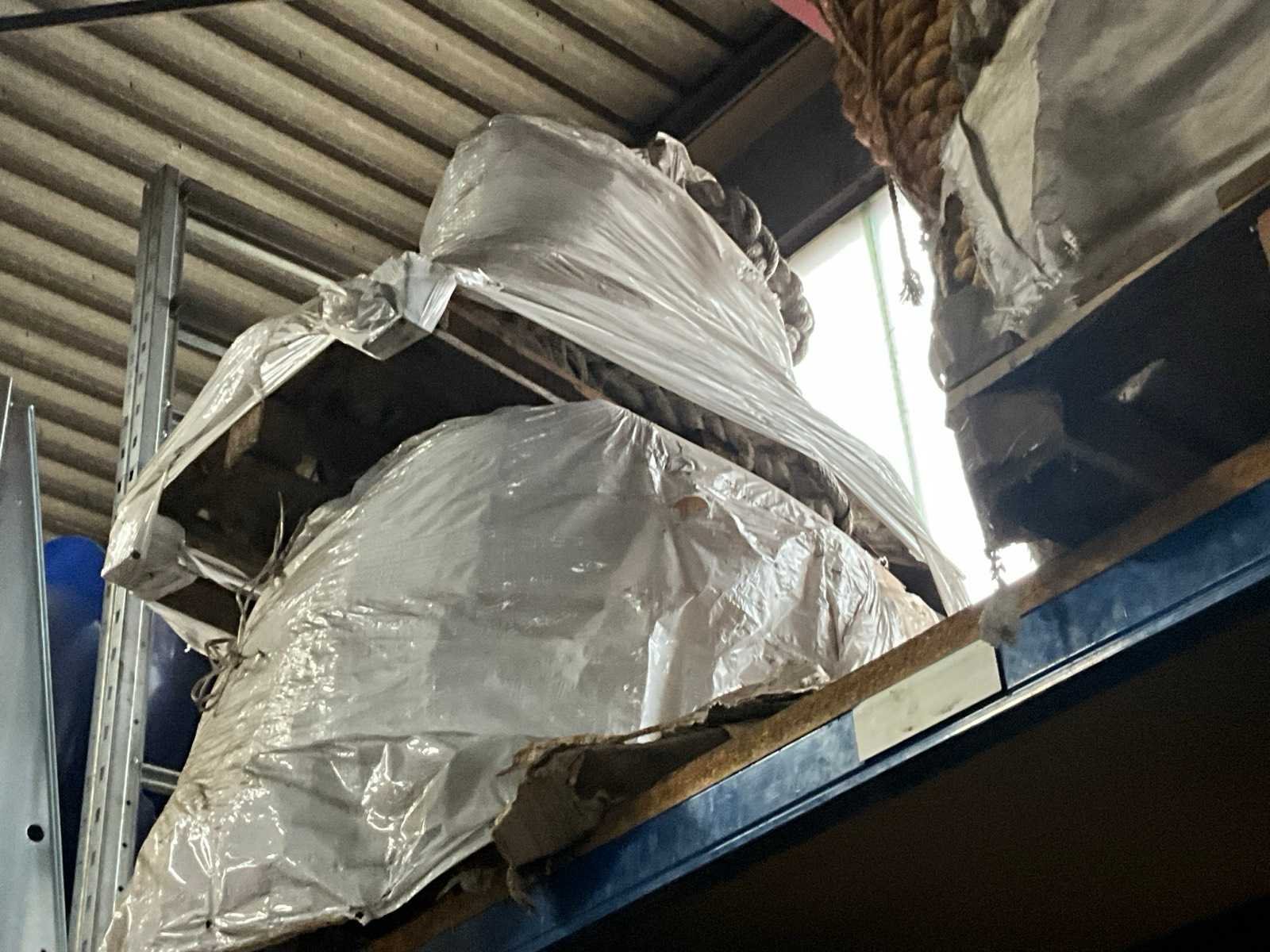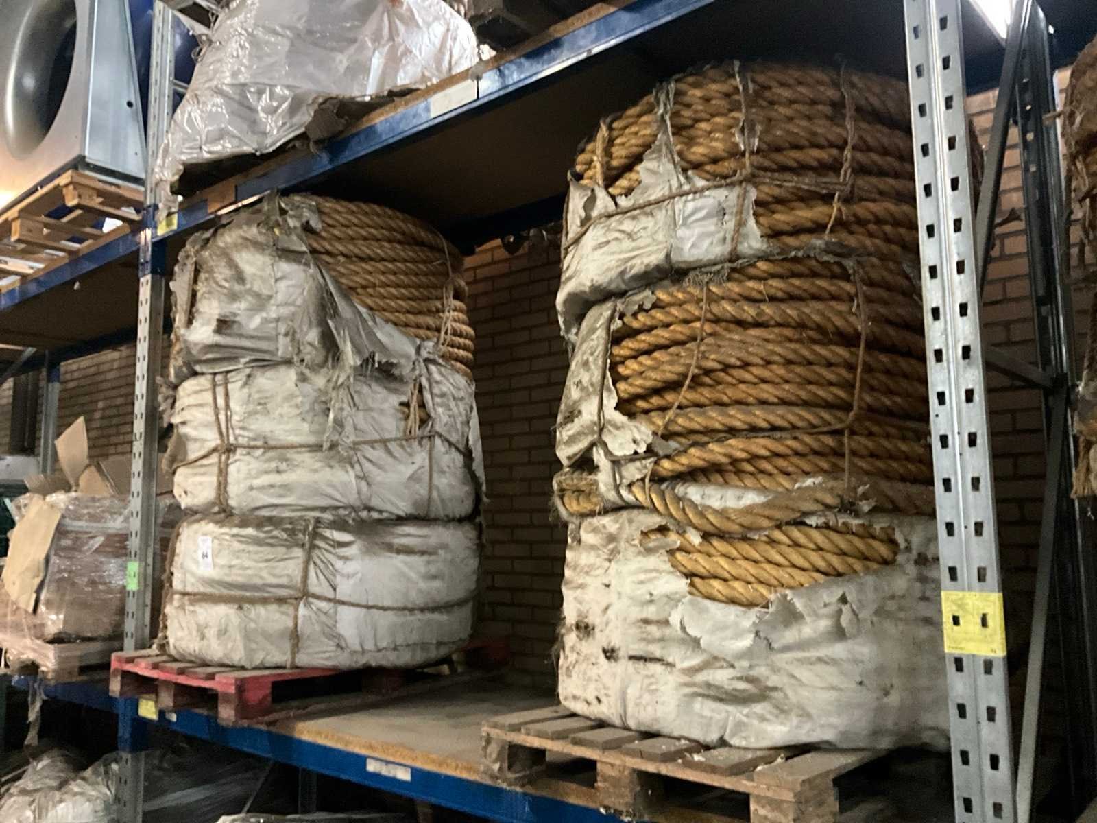 Bestaande uit circa 5x pallet met diverse diameters en lengtes scheepstouw, waaronder 3x pallet touw Ø circa 50 mm.