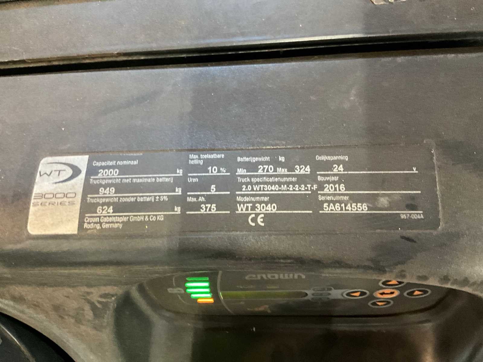 Merk: Crown Type: WT 3040 Bouwjaar: 2016 Hefvermogen: 2000kg Lepellengte: 1150mm Afgelezen urenstand: 5897 Eigen gewicht: 949kg Totale afmeting L: 2000mm Totale afmeting Breedte: 750mm Totale afmeting Hoogte: 1450mm Meerij stapelaar: true