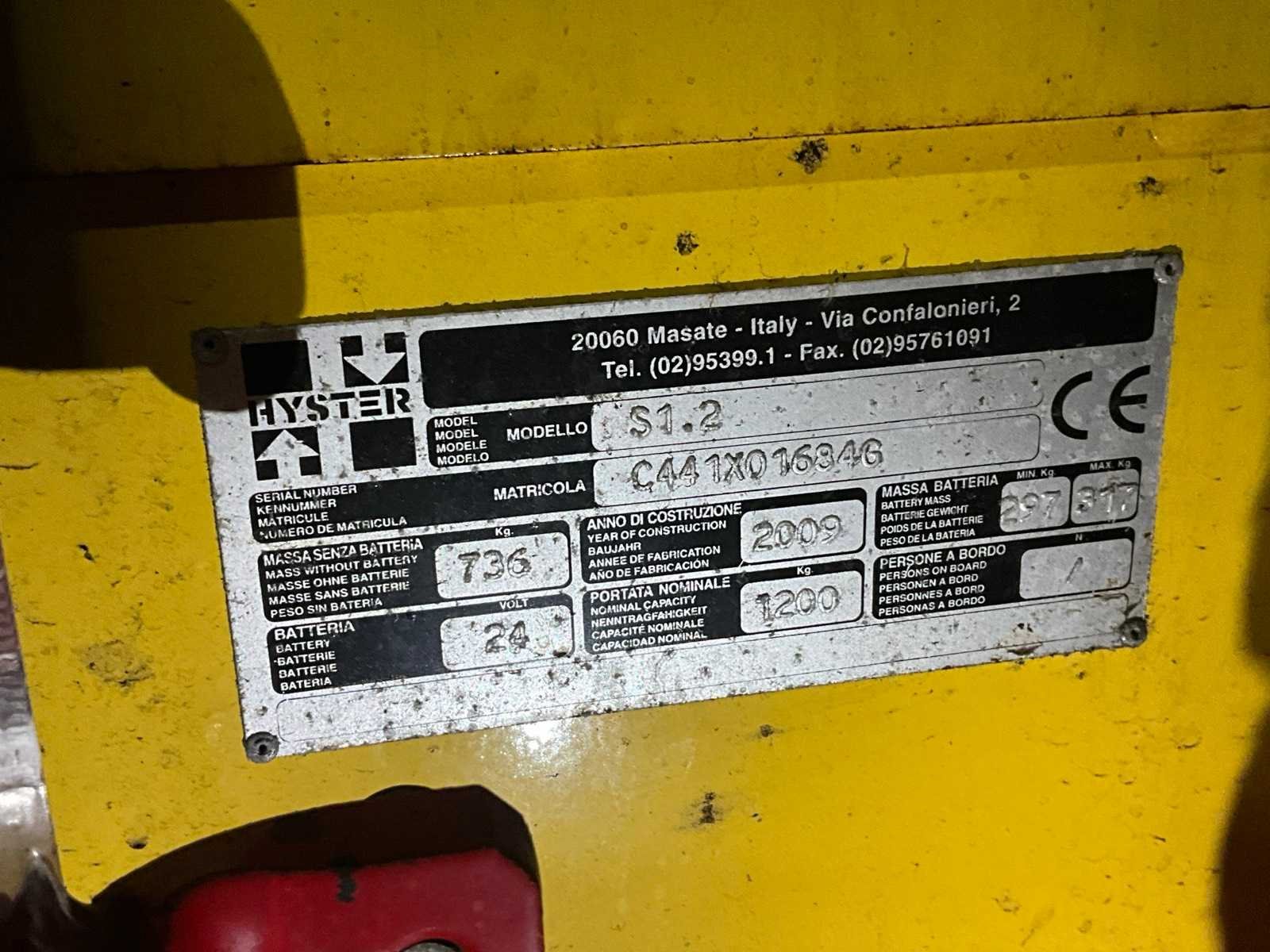Merk: Hyster Type: S1.2 Hefvermogen: 1200kg Hefhoogte: 2800mm Lepellengte: 1150mm Totale afmeting L: 1950mm Totale afmeting Breedte: 800mm Totale afmeting Hoogte: 1880mm