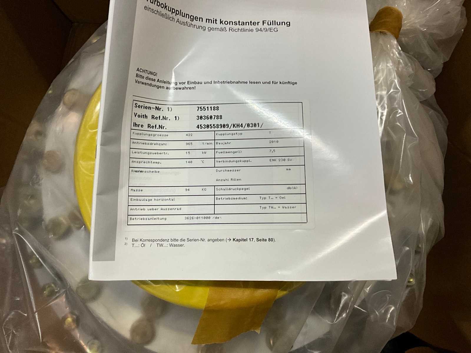Vermogen: 15 kW, nominaal toerental: 1400 t/min. Merk: Voith Turbo Bouwjaar: 2010 Eigen gewicht: 94kg Totale afmeting L: 470mm Totale afmeting Breedte: 470mm Totale afmeting Hoogte: 400mm