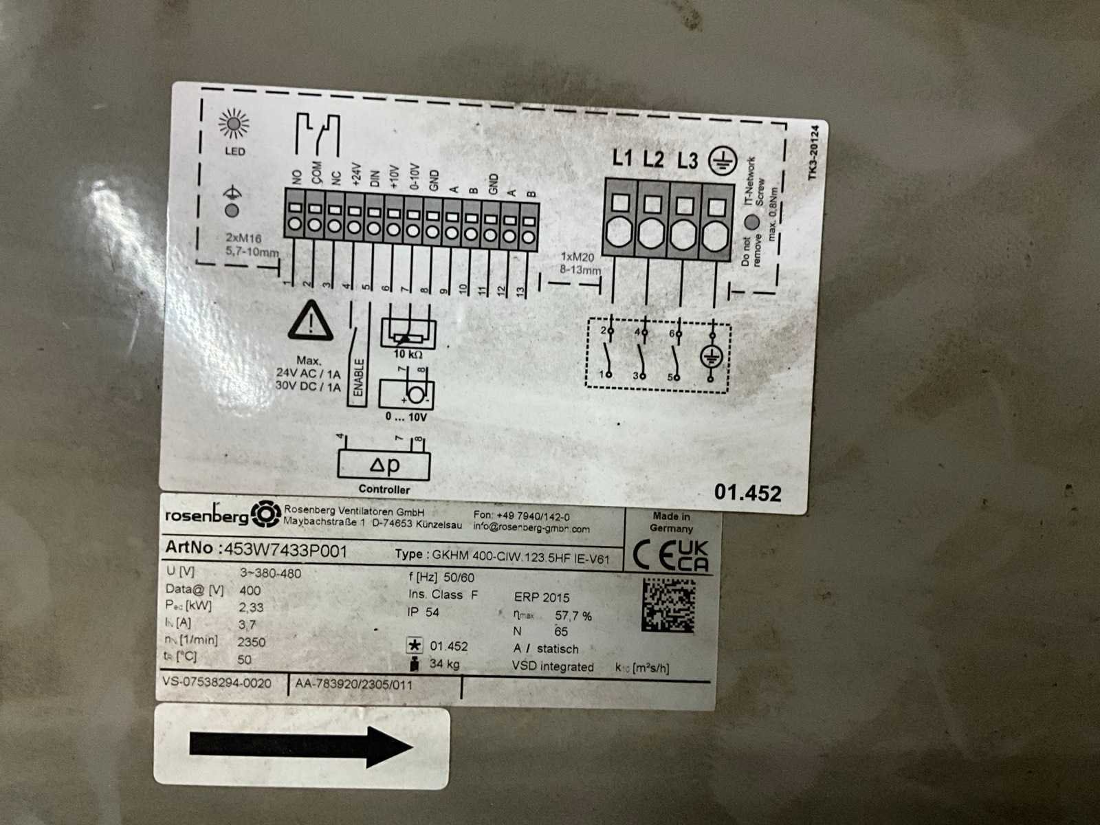 Diverse types, waaronder: “Rosenberg” type: GKH 400-CIW.123, Vermogen: 2,33 kW, Toerental: 2350 rpm, Gewicht: 34 kg, spanning: 400 V, “Ziehl-Abegg” type GR35I-ZID.DG.CR, vermogen: 3,3 kW, Gewicht: 44 kg, Toerental: 3410 rpm Merk: Rosenberg & Ziehl-Abegg