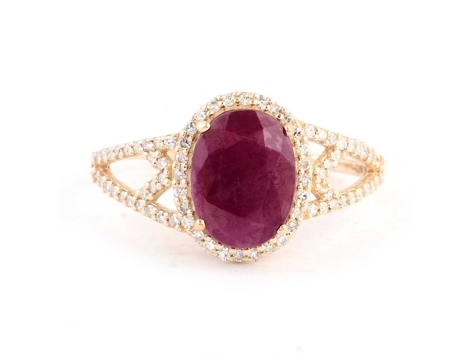 2,77 totale karaat natuurlijke robijnenring van saffier met 14 karaats goud Totaal gewicht 2.189 g - Midden edelsteen natuurlijke korund robijn Edelsteen karaatgewicht: 2,54 karaat Edelsteenafmetingen 9,20X7,10X3,90 mm - Extra edelstenen Natuurlijke diamant - Extra edelsteengewicht 0,23 karaat - Ringmaat (VS): 7/55 Bezichtiging op afspraak Materiaal: Geelgoud Ringmaat : 54 Certificaat: Ja