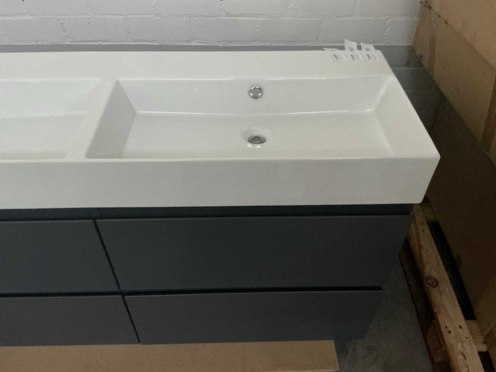 Bestaande uit wastafel met onderkast 4 lades Merk: Revital Model: Painted Matt Antracite Breedte: 140cm Spiegelkast: true Onderkast: 140x46x74cm Lades: 2 Softclose: true