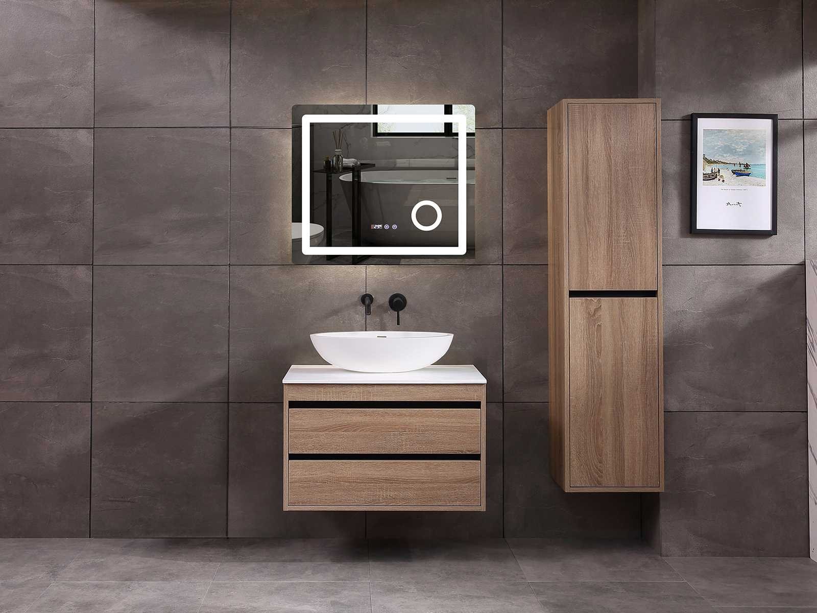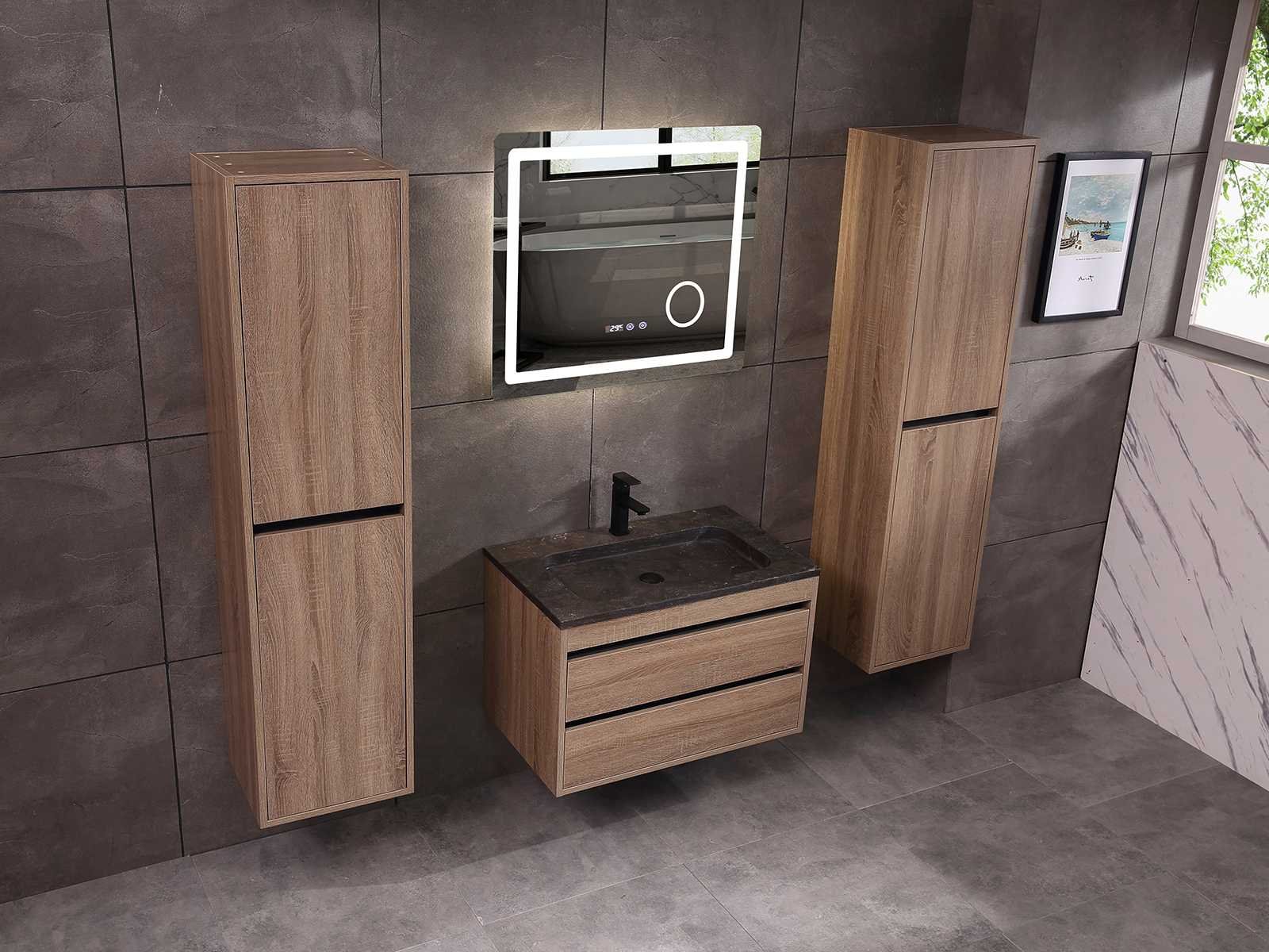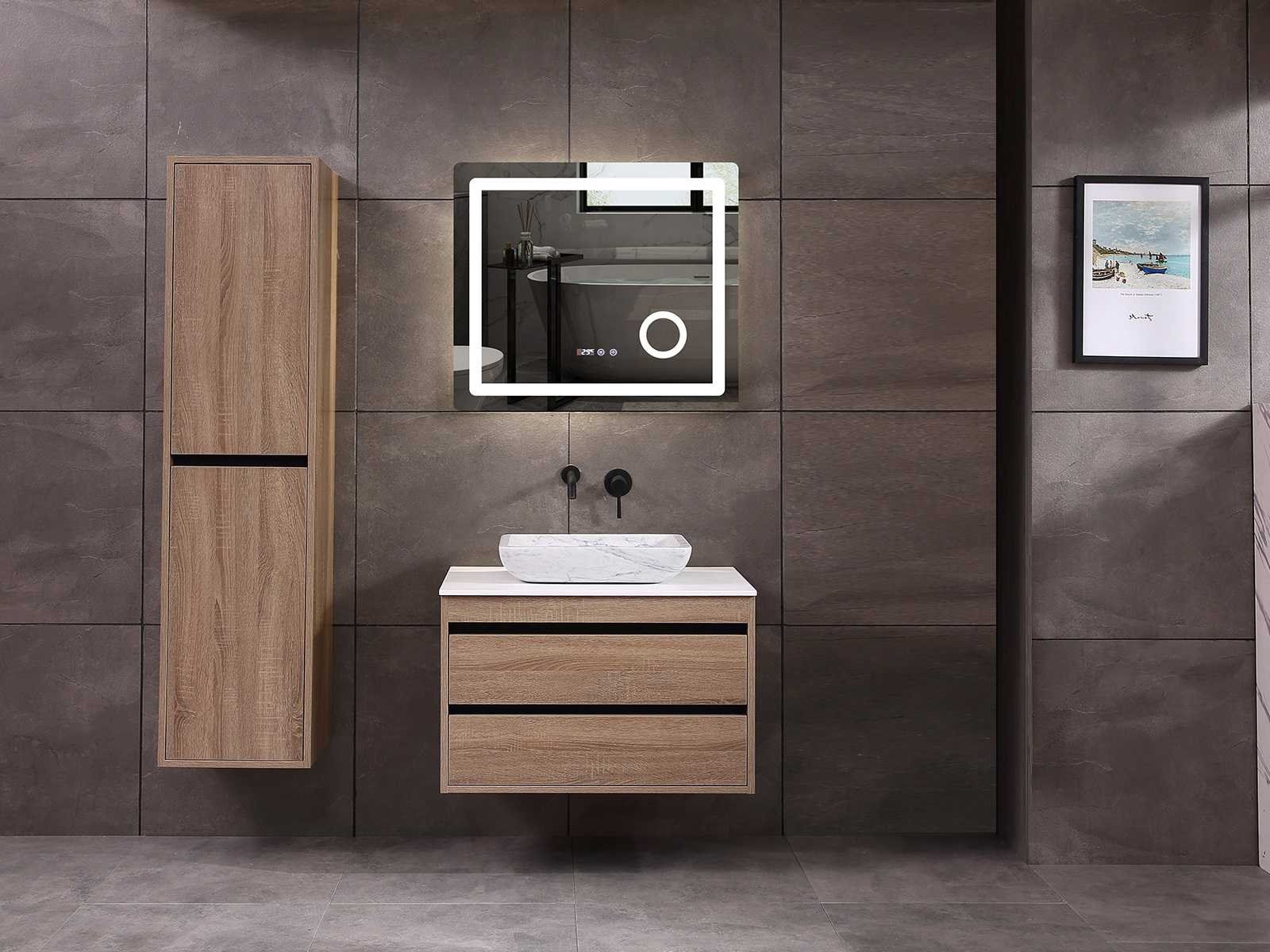 Afmeting meubel: bxdxh 80x49x50cm - hangkast 40x35x160cm, Kleur bruin eiken, Materiaal 2cm 5-laags multiplex(zeer sterk en vochtbestendig), Hangkast softclose deuren en extra planchets (hangkast is universeel en kan zowel links als rechts naast het meubel gehangen worden), Kranen exclusief, Lades 2 stuks met softclose, Wastafel natuursteen of solid surface (keuze uit diverse modellen van de laatste foto's vaste of losse wasbakken met een mat witte of mat zwarte solid surface top, vaste bakken zijn ook zonder kraangaten beschikbaar zodat u een muurkraan kunt gebruiken! Keuze graag aangeven op de afhaaldag), Spiegel ledspiegel met ledverlichting(6000K led-dioden)/vergrootglas/verwarming(anti condens)/klok met touchscreen (mag ook voor een ronde spiegel geruild worden indien gewenst of tegen een kleine meerprijs een luxure variant met display, bluetooth en speakers, neem daarvoor contact met ons op voor een passende aanbieding op info@mawialux.nl), Afvoeren exclusief , Conditie: Nieuw in doos, Bijzonderheden 2 jaar garantie, compleet met installatiekit, mat zwarte aluminium grepen achter de inkepingen van de lades en deuren, natuursteen wastafel is behandeld met coating, zeer hoge kwaliteit, Extra's de hangkast mag geruild worden voor een kraan en afvoerset naar keus(graag aangeven op de afhaaldag) of als u een extra hangkast nodig heeft kunt u ons ook mailen voor een passende aanbieding Merk: mawialux Hoogte: 50cm Lengte: 49cm Breedte: 80cm Materiaal: 2cm 5-laags multiplex(zeer sterk en vochtbestendig) Kleur: bruin eiken Spiegel met verlichting: ja Lades: 2