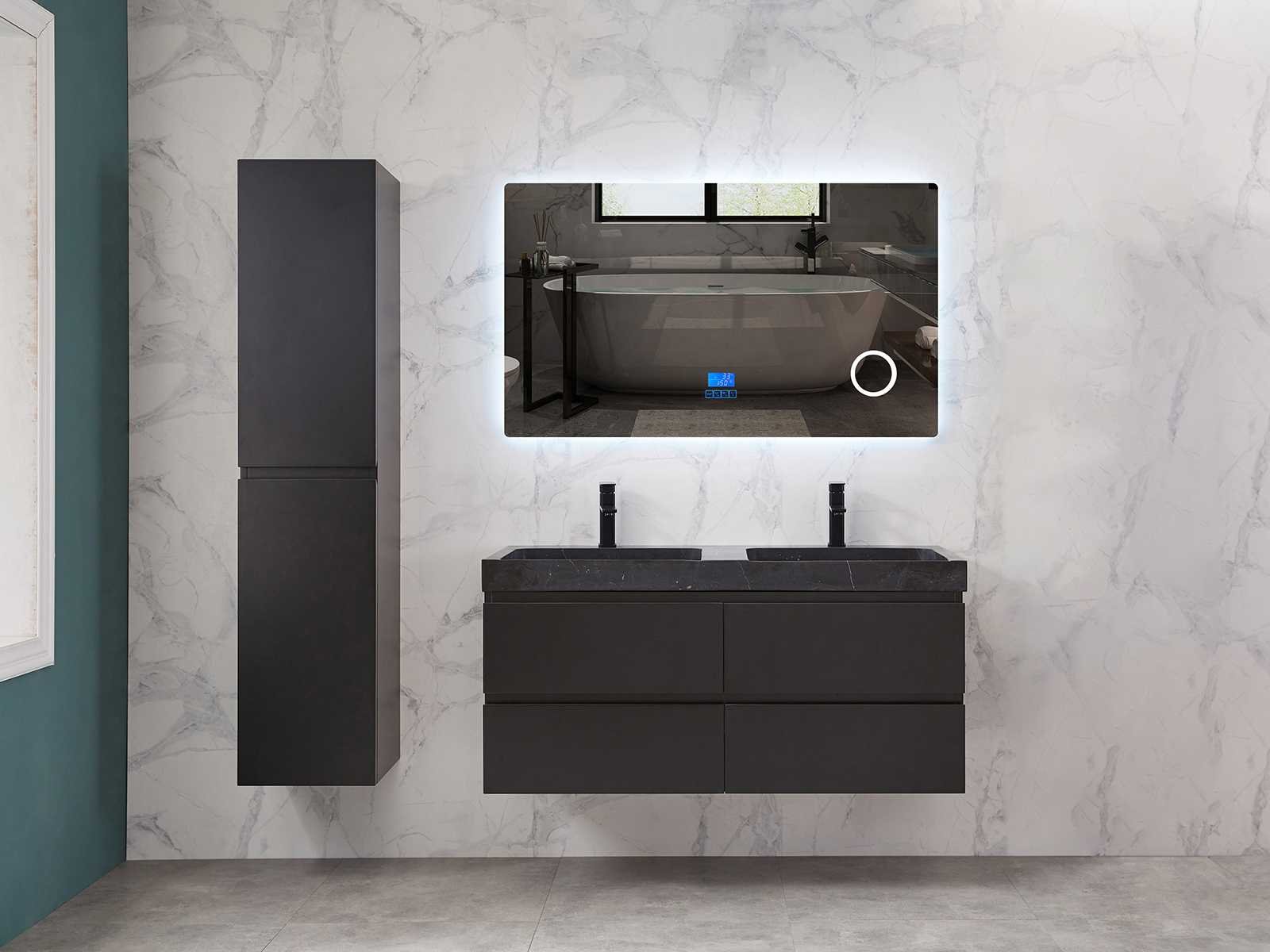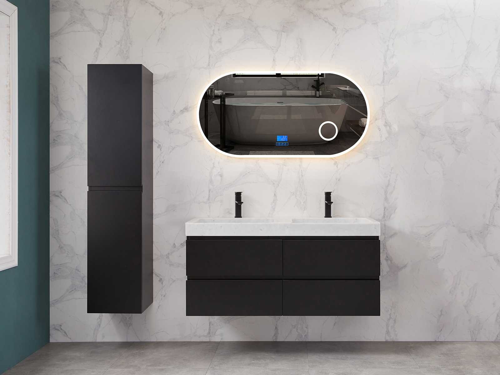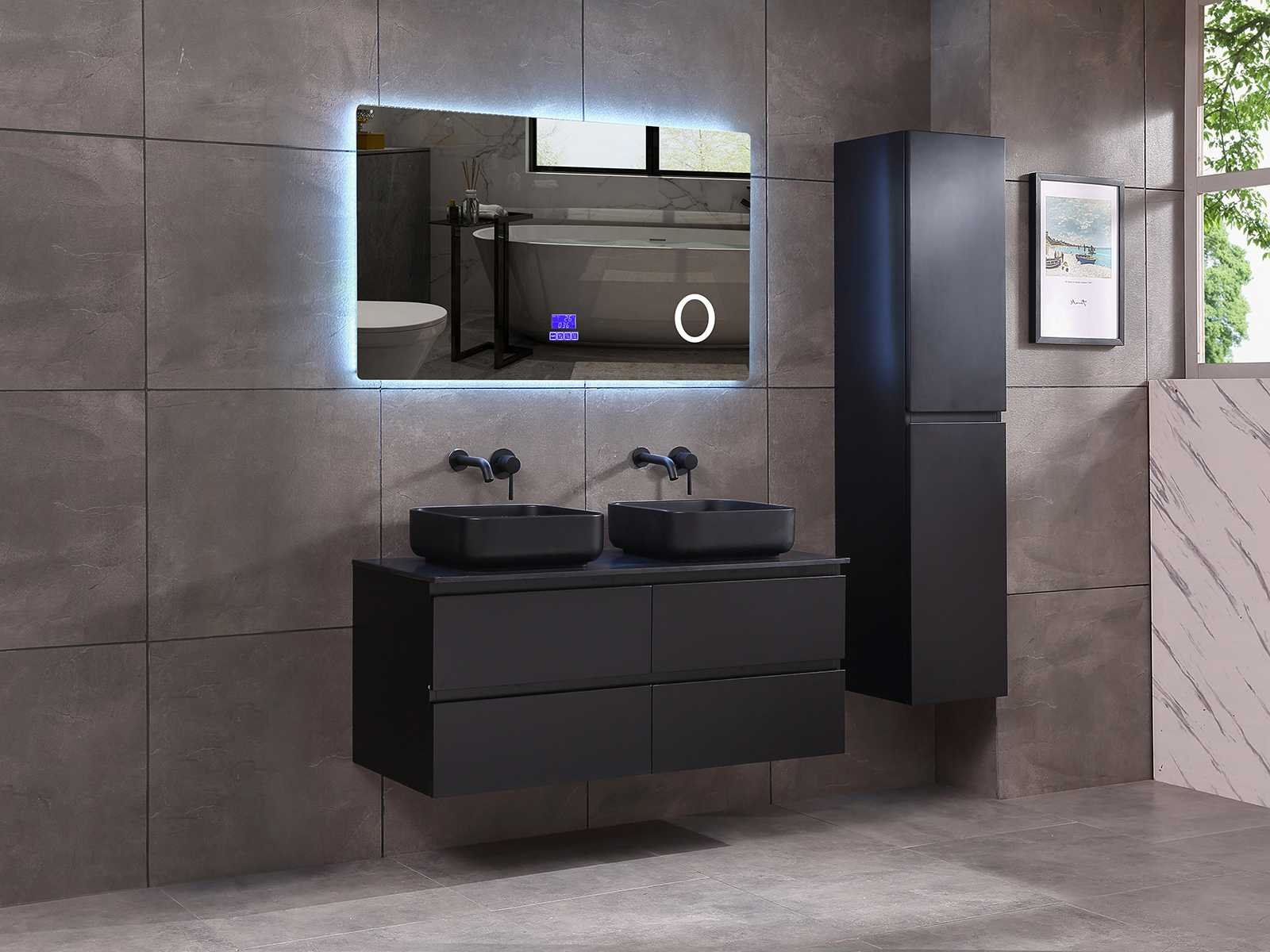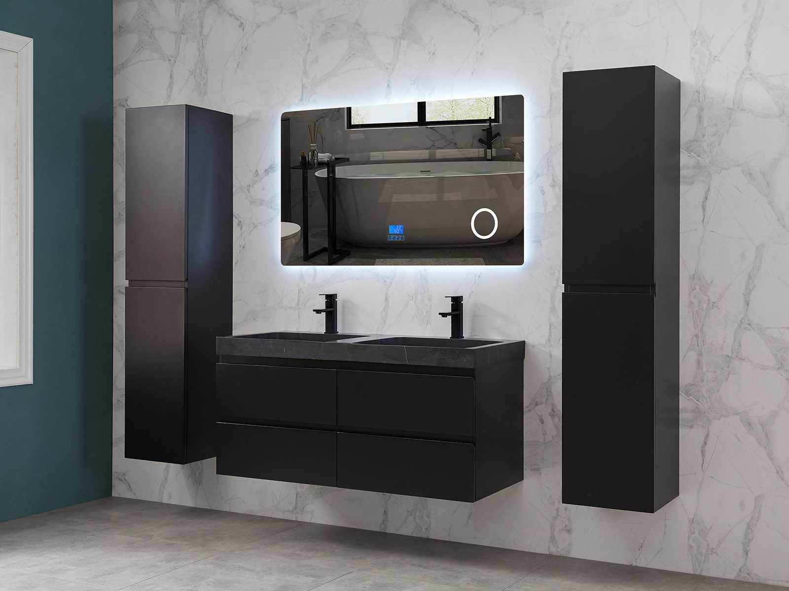 Afmeting meubel: bxdxh 120x49x50cm - hangkast 35x35x160cm, Materiaal 2cm 5-laags multiplex(zeer sterk en vochtbestendig), Hangkast softclose deuren en extra planchets (hangkast is universeel en kan zowel links als rechts naast het meubel gehangen worden), Kranen exclusief , Lades 4 stuks met softclose, Wastafel natuursteen of solid surface (keuze uit diverse modellen van de laatste foto's vaste of losse wasbakken met een mat witte of mat zwarte solid surface top, vaste bakken zijn ook zonder kraangaten beschikbaar zodat u muurkranen kunt gebruiken! Keuze graag aangeven op de afhaaldag), verwarming, bediening one-touch (voor heater, verlichting, bluetooth en instellingen), Verlichting aan de achterkant met met 3 verstelbare en dimbare kleuren LED 3000/4500/6000K LED-dioden (geel/blauw/wit licht), voorzien van digitaal display, geïntegreerde vergrotings spiegel van 10cm doorsnede met ledverlichting(vergroot 3x), bluetooth met speaker, digitale klok, digitale temperatuur aanduiding, 220volt stekker(plug and play), glas 1.5mm kopervrij met explosion-proof laag (mag uit diverse modellen gekozen worden welke in de afbeeldingen zijn afgebeeld, keuze graag aangeven op de afhaaldag), Afvoeren exclusief , Conditie: Nieuw in doos, Bijzonderheden 2 jaar garantie, compleet met installatiekit, mat zwarte aluminium grepen achter de inkepingen van de lades en deuren, natuursteen wastafel is behandeld met coating, zeer hoge kwaliteit, Extra's de hangkast mag geruild worden voor een set kranen en popup afvoeren naar keus(graag aangeven op de afhaaldag) Merk: Mawialux Breedte: 120cm Kleur: mat zwart Kraan: nee Wastafel: ja Waskom: ja Spiegel met verlichting: ja Onderkast: ja Lades: 4 Softclose: true Zijkast: ja Afmeting hangkast: 160x30x35