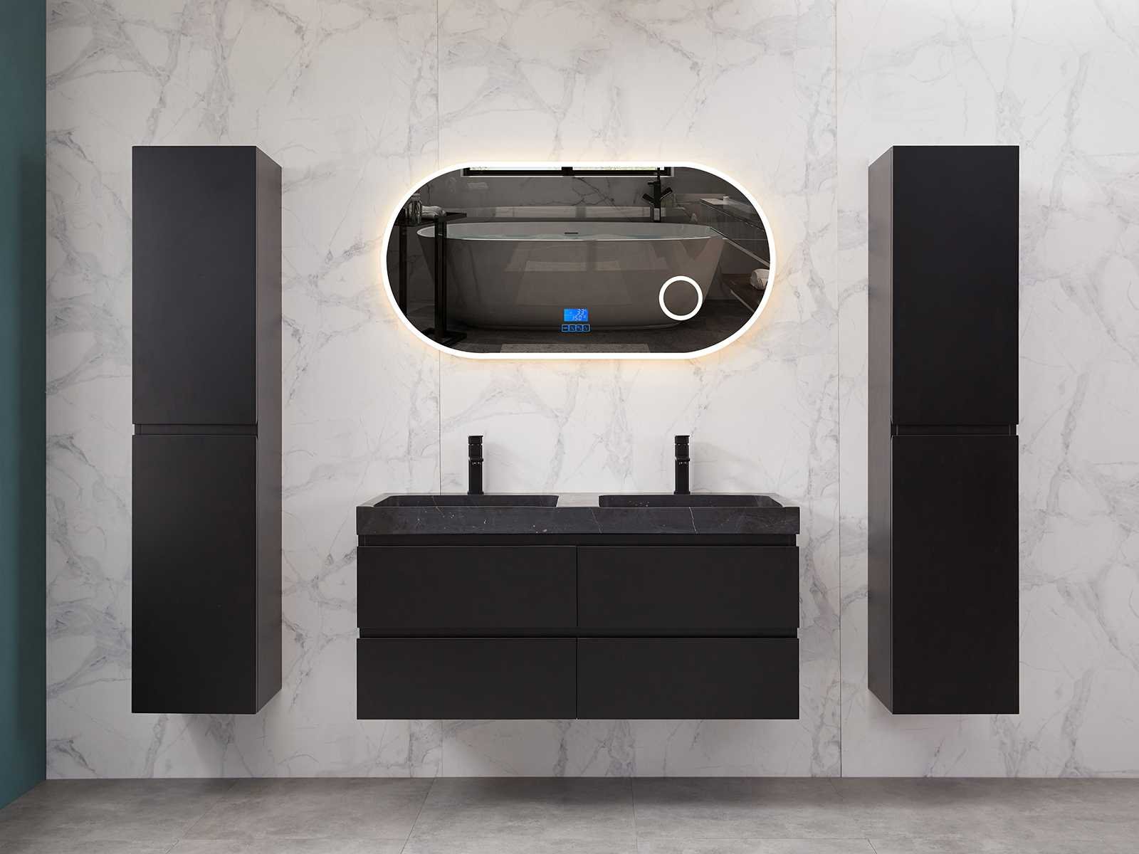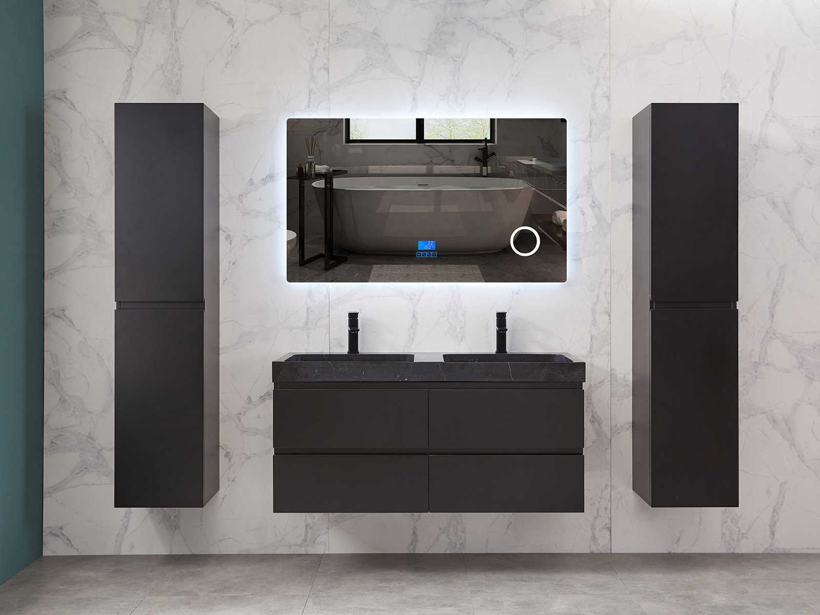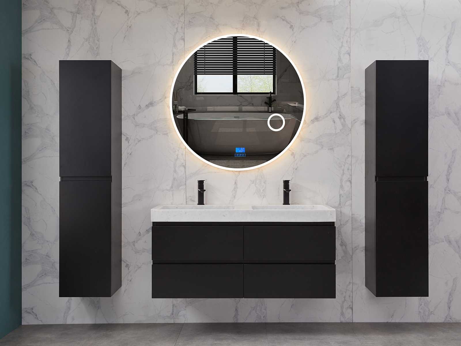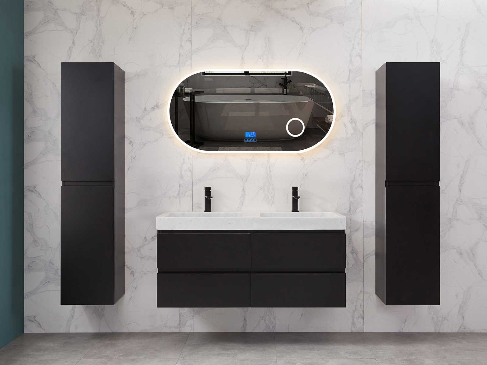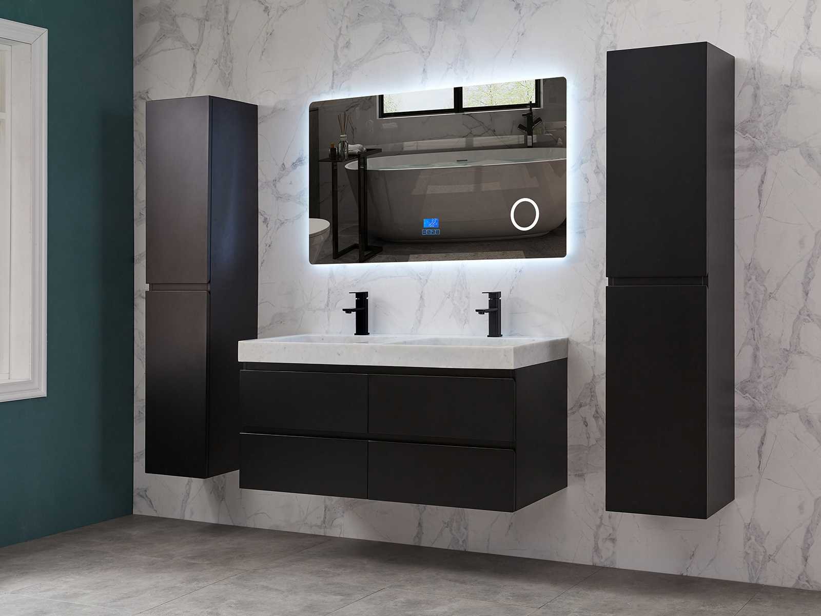 Afmeting meubel: bxdxh 120x49x50cm - hangkast 35x35x160cm, Materiaal 2cm 5-laags multiplex(zeer sterk en vochtbestendig), Hangkast softclose deuren en extra planchets (hangkast is universeel en kan zowel links als rechts naast het meubel gehangen worden), Kranen exclusief , Lades 4 stuks met softclose, Wastafel natuursteen of solid surface (keuze uit diverse modellen van de laatste foto's vaste of losse wasbakken met een mat witte of mat zwarte solid surface top, vaste bakken zijn ook zonder kraangaten beschikbaar zodat u muurkranen kunt gebruiken! Keuze graag aangeven op de afhaaldag), verwarming, bediening one-touch (voor heater, verlichting, bluetooth en instellingen), Verlichting aan de achterkant met met 3 verstelbare en dimbare kleuren LED 3000/4500/6000K LED-dioden (geel/blauw/wit licht), voorzien van digitaal display, geïntegreerde vergrotings spiegel van 10cm doorsnede met ledverlichting(vergroot 3x), bluetooth met speaker, digitale klok, digitale temperatuur aanduiding, 220volt stekker(plug and play), glas 1.5mm kopervrij met explosion-proof laag (mag uit diverse modellen gekozen worden welke in de afbeeldingen zijn afgebeeld, keuze graag aangeven op de afhaaldag), Afvoeren exclusief , Conditie: Nieuw in doos, Bijzonderheden 2 jaar garantie, compleet met installatiekit, mat zwarte aluminium grepen achter de inkepingen van de lades en deuren, natuursteen wastafel is behandeld met coating, zeer hoge kwaliteit, Extra's de hangkast mag geruild worden voor een set kranen en popup afvoeren naar keus(graag aangeven op de afhaaldag) Merk: Mawialux Breedte: 120cm Kleur: mat zwart Kraan: nee Wastafel: ja Waskom: ja Spiegel met verlichting: ja Onderkast: ja Lades: 4 Softclose: true Zijkast: ja Afmeting hangkast: 160x30x35