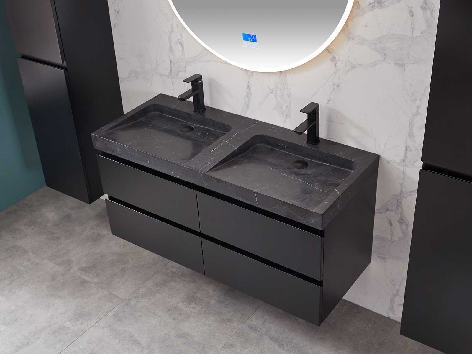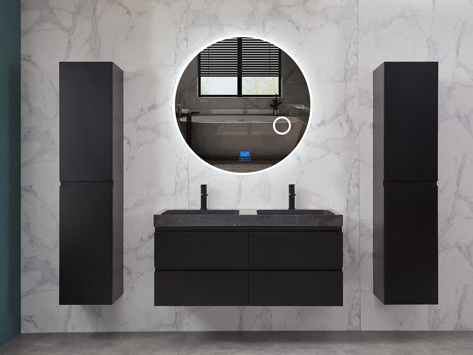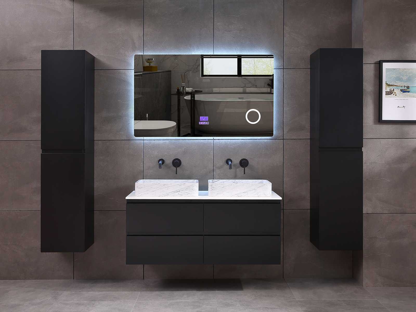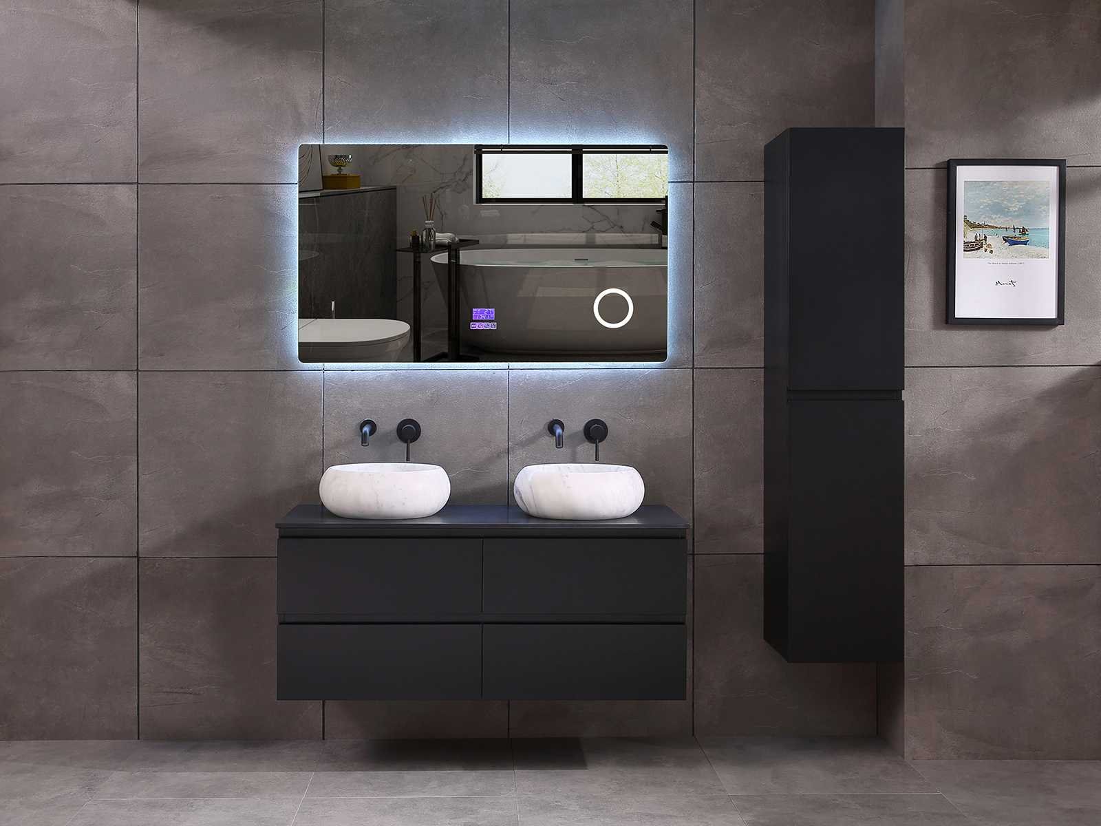 Afmeting meubel: bxdxh 120x49x50cm - hangkast 35x35x160cm, Materiaal 2cm 5-laags multiplex(zeer sterk en vochtbestendig), Hangkast softclose deuren en extra planchets (hangkast is universeel en kan zowel links als rechts naast het meubel gehangen worden), Kranen exclusief , Lades 4 stuks met softclose, Wastafel natuursteen of solid surface (keuze uit diverse modellen van de laatste foto's vaste of losse wasbakken met een mat witte of mat zwarte solid surface top, vaste bakken zijn ook zonder kraangaten beschikbaar zodat u muurkranen kunt gebruiken! Keuze graag aangeven op de afhaaldag), verwarming, bediening one-touch (voor heater, verlichting, bluetooth en instellingen), Verlichting aan de achterkant met met 3 verstelbare en dimbare kleuren LED 3000/4500/6000K LED-dioden (geel/blauw/wit licht), voorzien van digitaal display, geïntegreerde vergrotings spiegel van 10cm doorsnede met ledverlichting(vergroot 3x), bluetooth met speaker, digitale klok, digitale temperatuur aanduiding, 220volt stekker(plug and play), glas 1.5mm kopervrij met explosion-proof laag (mag uit diverse modellen gekozen worden welke in de afbeeldingen zijn afgebeeld, keuze graag aangeven op de afhaaldag), Afvoeren exclusief , Conditie: Nieuw in doos, Bijzonderheden 2 jaar garantie, compleet met installatiekit, mat zwarte aluminium grepen achter de inkepingen van de lades en deuren, natuursteen wastafel is behandeld met coating, zeer hoge kwaliteit, Extra's de hangkast mag geruild worden voor een set kranen en popup afvoeren naar keus(graag aangeven op de afhaaldag) Merk: Mawialux Breedte: 120cm Kleur: mat zwart Kraan: nee Wastafel: ja Waskom: ja Spiegel met verlichting: ja Onderkast: ja Lades: 4 Softclose: true Zijkast: ja Afmeting hangkast: 160x30x35