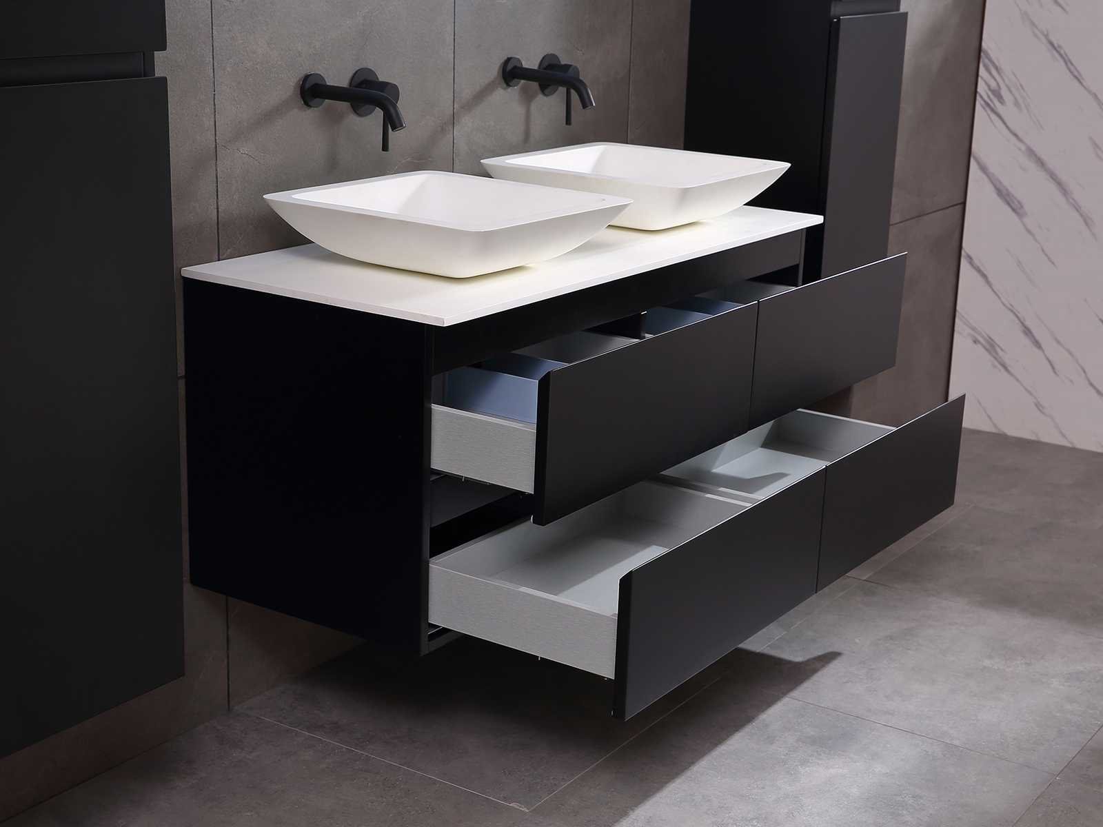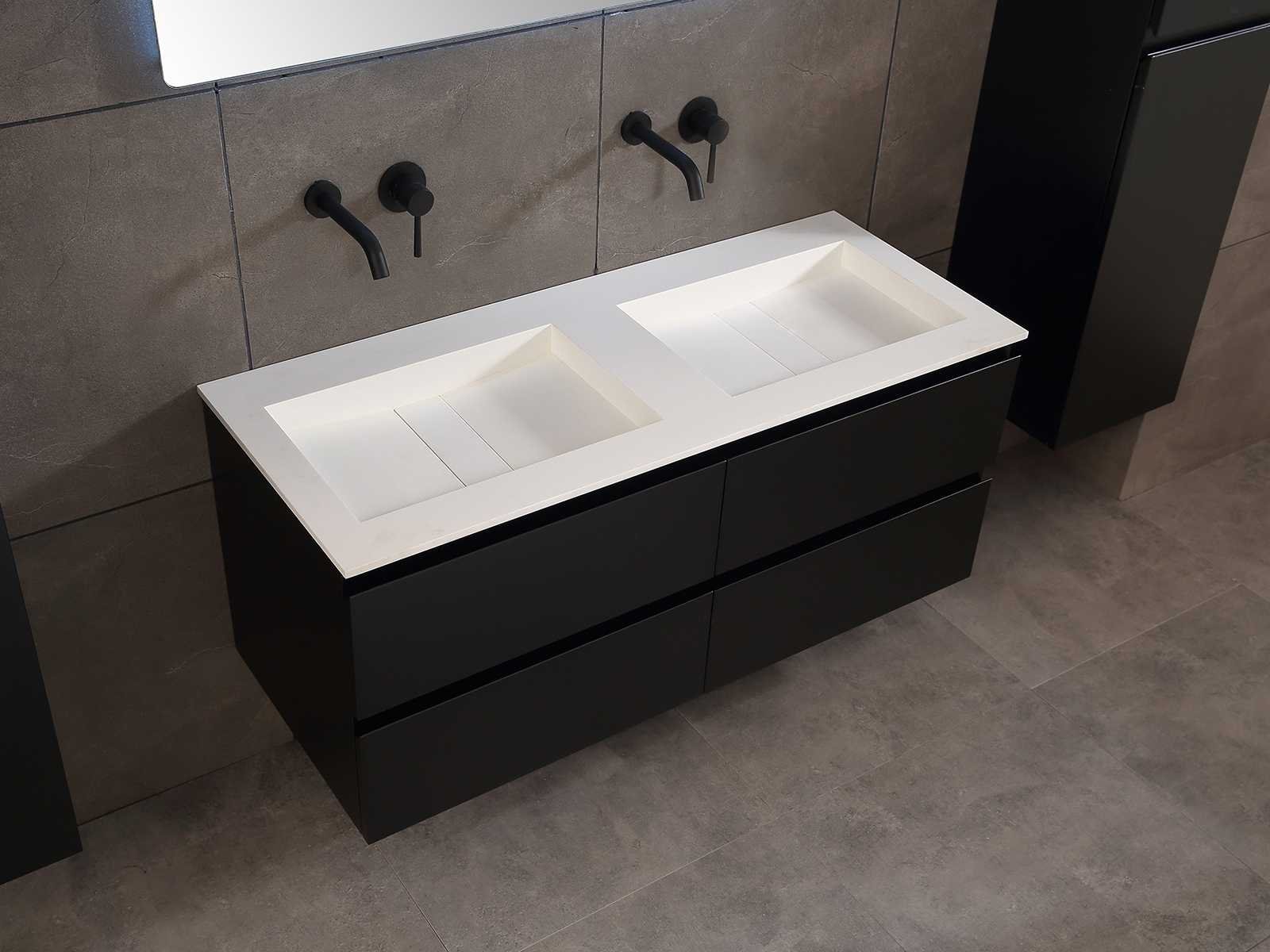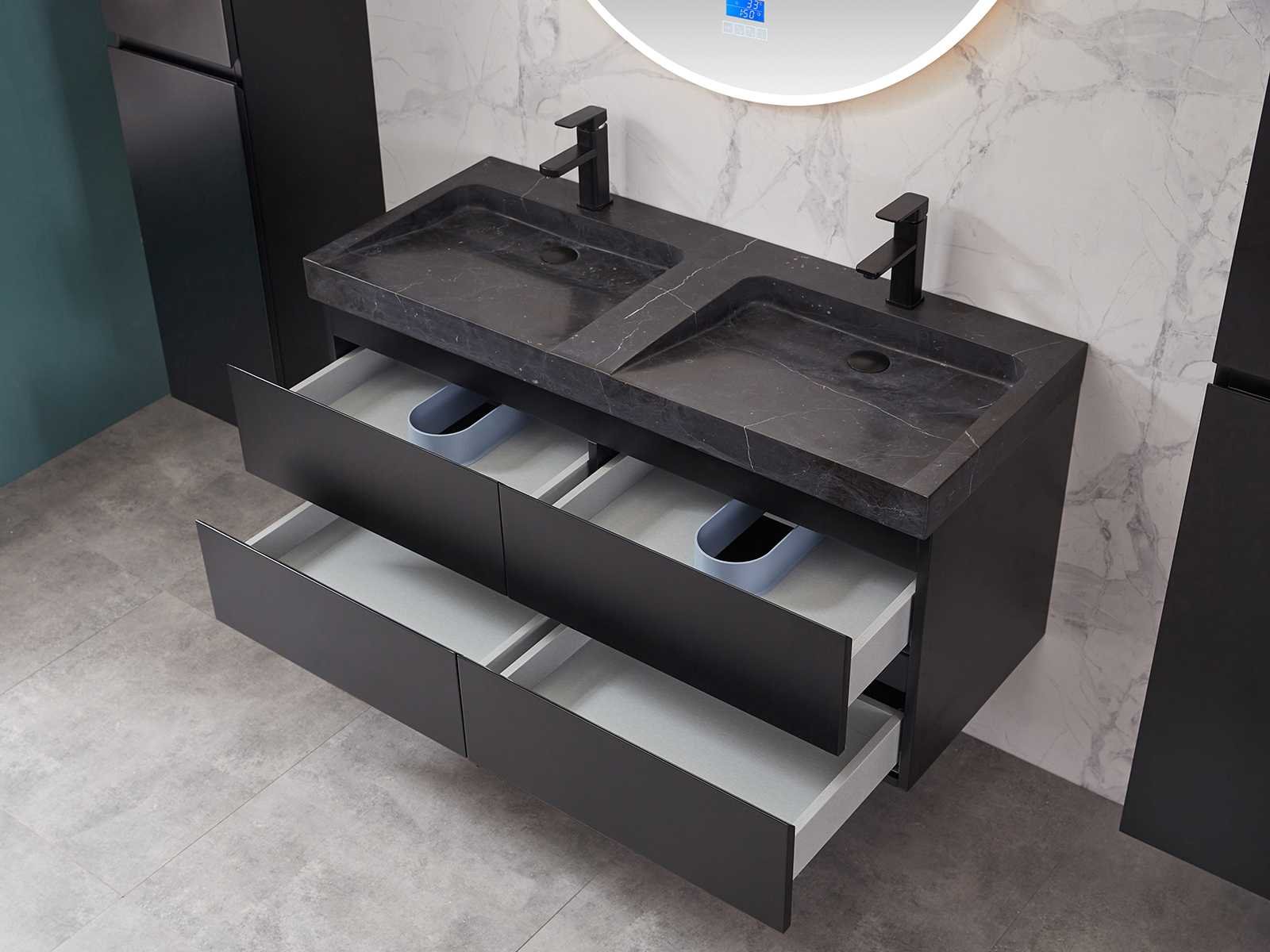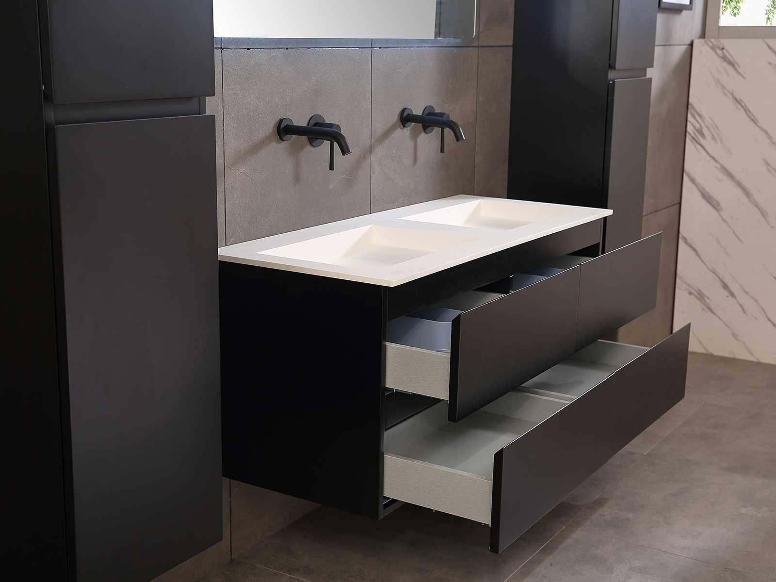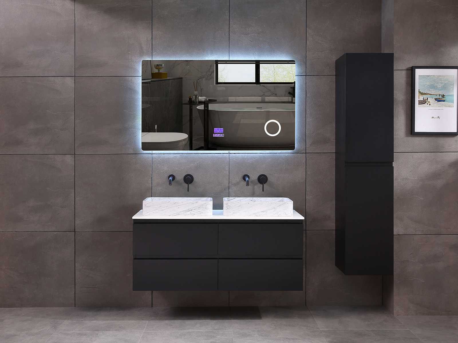 Afmeting meubel: bxdxh 120x49x50cm - hangkast 35x35x160cm, Materiaal 2cm 5-laags multiplex(zeer sterk en vochtbestendig), Hangkast softclose deuren en extra planchets (hangkast is universeel en kan zowel links als rechts naast het meubel gehangen worden), Kranen exclusief , Lades 4 stuks met softclose, Wastafel natuursteen of solid surface (keuze uit diverse modellen van de laatste foto's vaste of losse wasbakken met een mat witte of mat zwarte solid surface top, vaste bakken zijn ook zonder kraangaten beschikbaar zodat u muurkranen kunt gebruiken! Keuze graag aangeven op de afhaaldag), verwarming, bediening one-touch (voor heater, verlichting, bluetooth en instellingen), Verlichting aan de achterkant met met 3 verstelbare en dimbare kleuren LED 3000/4500/6000K LED-dioden (geel/blauw/wit licht), voorzien van digitaal display, geïntegreerde vergrotings spiegel van 10cm doorsnede met ledverlichting(vergroot 3x), bluetooth met speaker, digitale klok, digitale temperatuur aanduiding, 220volt stekker(plug and play), glas 1.5mm kopervrij met explosion-proof laag (mag uit diverse modellen gekozen worden welke in de afbeeldingen zijn afgebeeld, keuze graag aangeven op de afhaaldag), Afvoeren exclusief , Conditie: Nieuw in doos, Bijzonderheden 2 jaar garantie, compleet met installatiekit, mat zwarte aluminium grepen achter de inkepingen van de lades en deuren, natuursteen wastafel is behandeld met coating, zeer hoge kwaliteit, Extra's de hangkast mag geruild worden voor een set kranen en popup afvoeren naar keus(graag aangeven op de afhaaldag) Merk: Mawialux Breedte: 120cm Kleur: mat zwart Kraan: nee Wastafel: ja Waskom: ja Spiegel met verlichting: ja Onderkast: ja Lades: 4 Softclose: true Zijkast: ja Afmeting hangkast: 160x30x35
