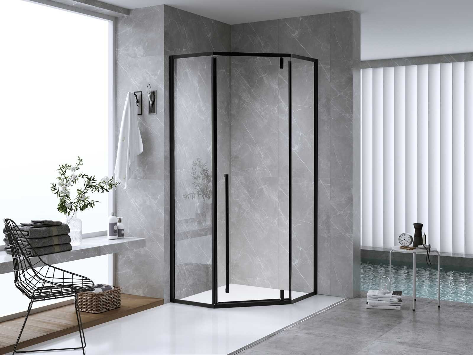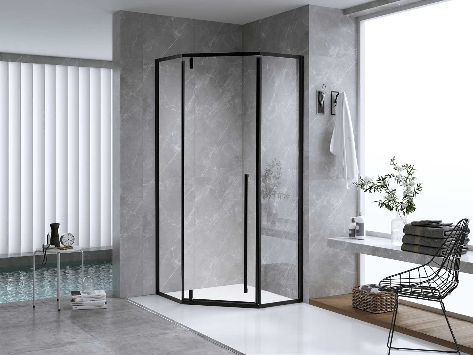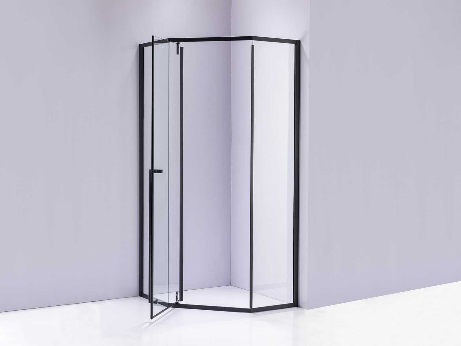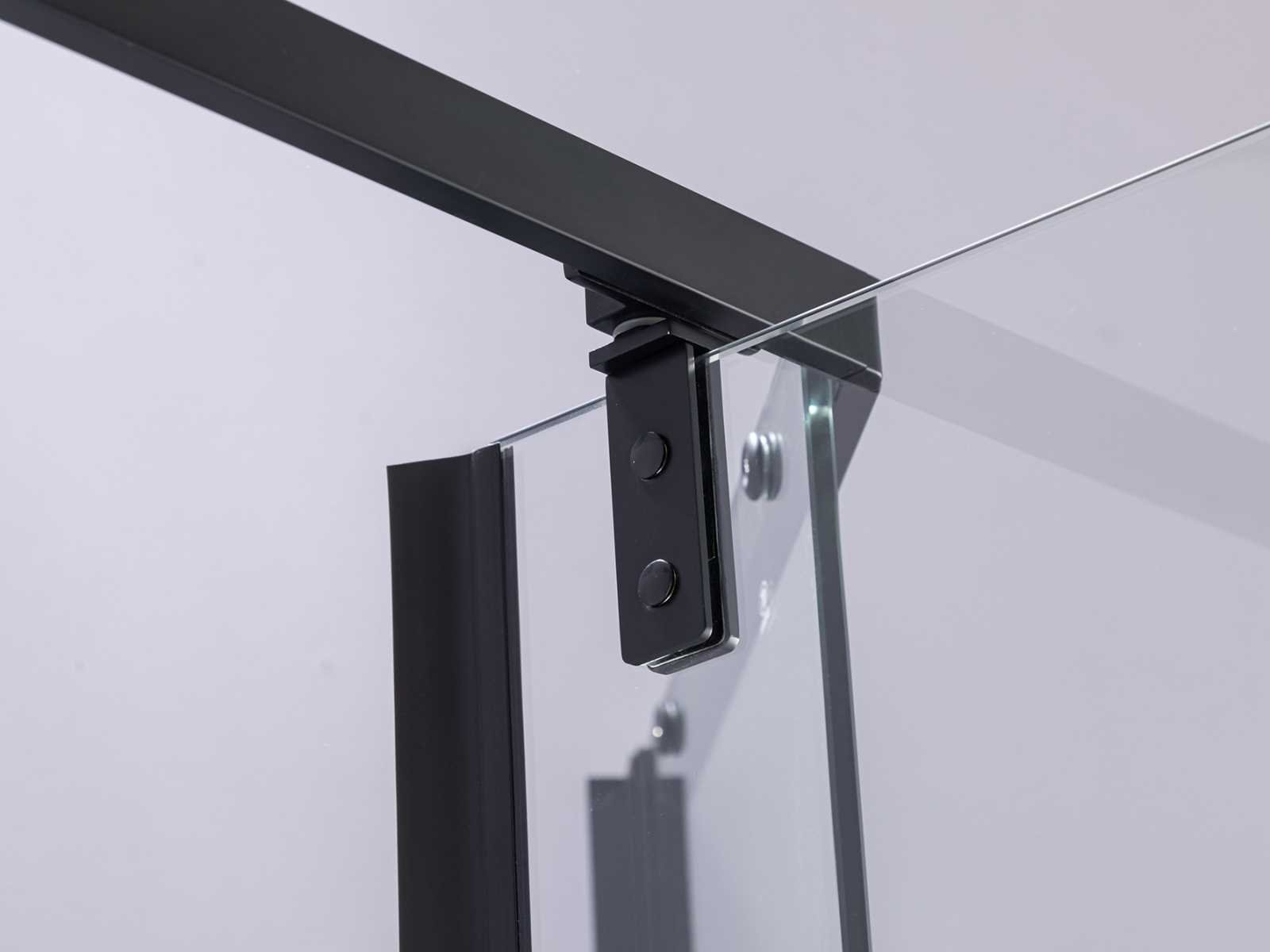 Materiaal aluminium profielen met messing ophanging en rollagers en rvs handgrepen, glas 6mm dik helder nano gecoat veiligheidsglas (vermindert kalkaanslag), draaideur, douchebak exclusief, voorzien van water afsluitstrip onder de deur - verstevigingsstang(messing) - rvs deurgrepen(mat zwart), aluminium magneetstrips aan uiteinde deur/wand - onzichtbare schroefbevestiging - bevestiging materiaal, zowel links als rechts in de hoek te monteren, wandprofiel 20 mm verstelbaar Merk: Mawialux Model: Iowa Kleur: mat zwart Lengte: 90cm Breedte: 90cm Hoogte: 200cm