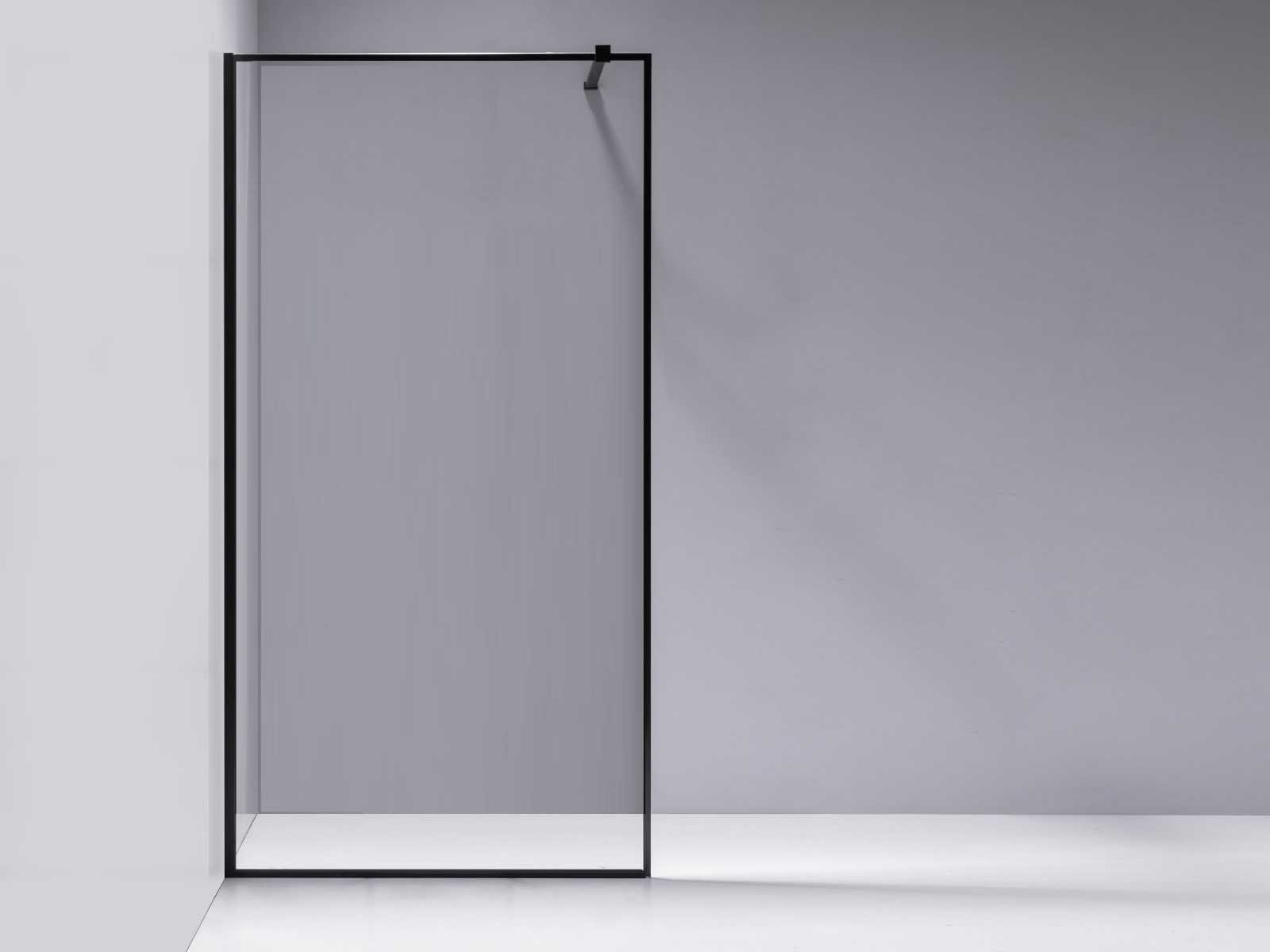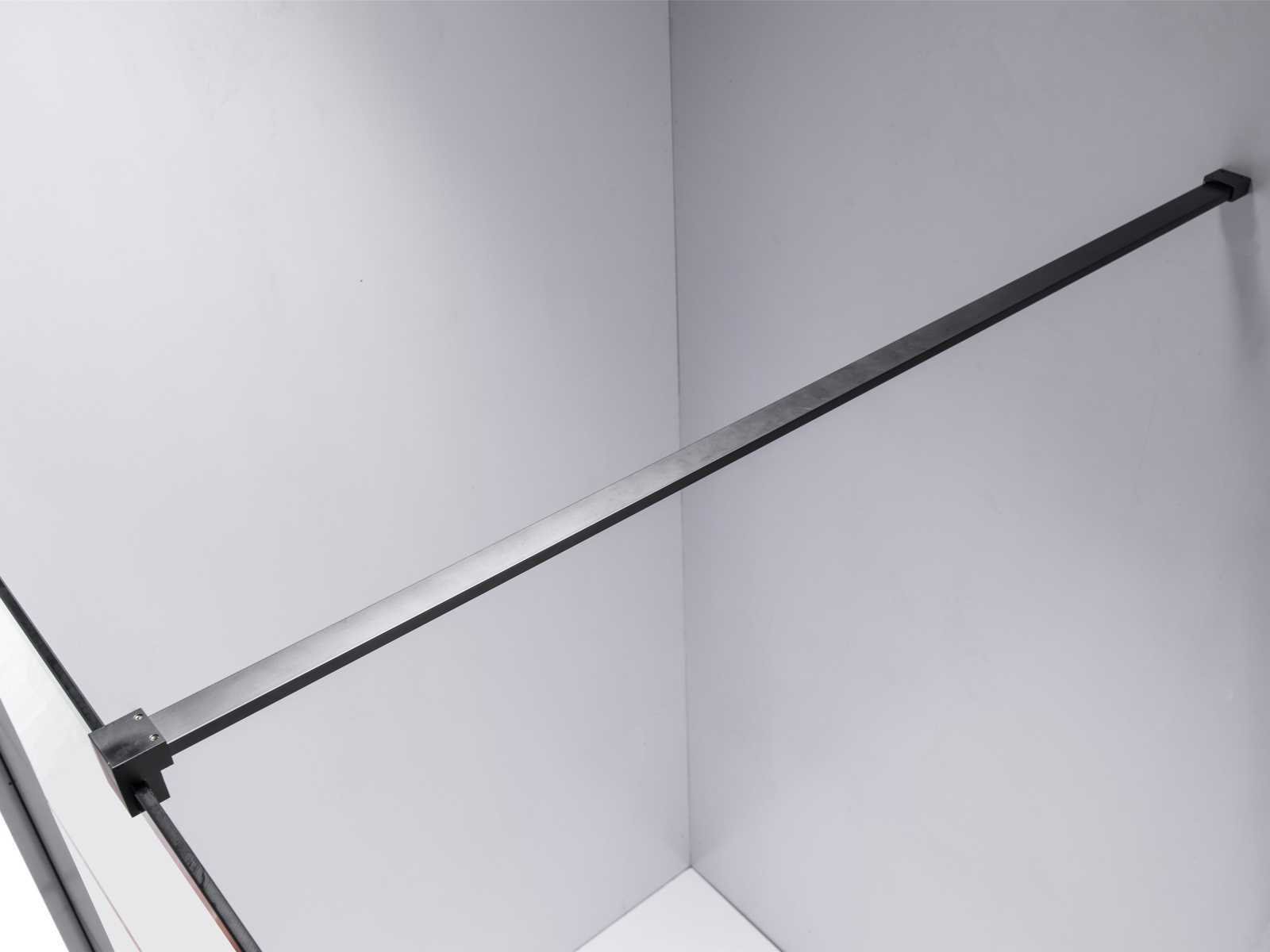 Kleur mat zwart met mat zwart frame rondom glas, materiaal aluminium profiel met messing ophanging (mat zwart), glas 8mm dik helder nano gecoat veiligheidsglas (vermindert kalkaanslag doordat het water niet op het opervlak kan hechten), voorzien van onzichtbare schroefbevestiging - extra hoek verstevigingsblok voor vloer (mat zwart, compleet met bevestiging materiaal - inclusief mat zwarte waterstrip voor vloer onder de wand - vierkante mat zwarte bevestiging stang van messing 120cm (in te korten naar gewenste maat), wandprofiel 20 mm verstelbaar Merk: Mawialux Model: Tampa Breedte: 80cm Hoogte: 195cm