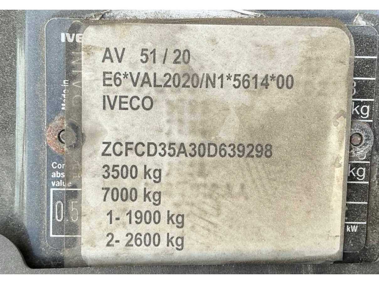 Staal koprek; aluminium neerklapbare schotten lange zijde; voorzien van DEL DL 500F aluminium tweedelige hydraulische laadklep afmeting 1950x1300 mm; capaciteit laadklep 500 kg; laadbak afmeting 4050x2050 mm; afneembare trekhaak; tachograaf (defect); radio & navigatie; 6 versnellingen; motor loopt; auto loopt; belettering zal worden verwijderd; Belgische kentekenpapieren; gelijkvormigheidsattest; (1-XVD-830) Merk: Iveco Type: Daily 35-140 Bouwjaar: 2019 Chassisnummer: ZCFCD35A30D639298 Afgelezen kilometerstand: 67652km Cilinderinhoud: 2287cc Vermogen (kW): 100kW Brandstof: diesel Aandrijving: Achterwiel Transmissie: Manueel Aantal zitplaatsen: 2 Kleur: niet van toepassing Stuurwiel: Links Aantal deuren: 2 Aantal sleutels: 2 Ledig gewicht: 2535kg Laadvermogen: 965kg Vermogen (pk): 136 Aantal cilinders: 4 Carrosserie: neerklapbare zijschotten Emissieklasse: 6 Startinformatie: Start en rijdt Maximaal trekgewicht ongeremd: 750