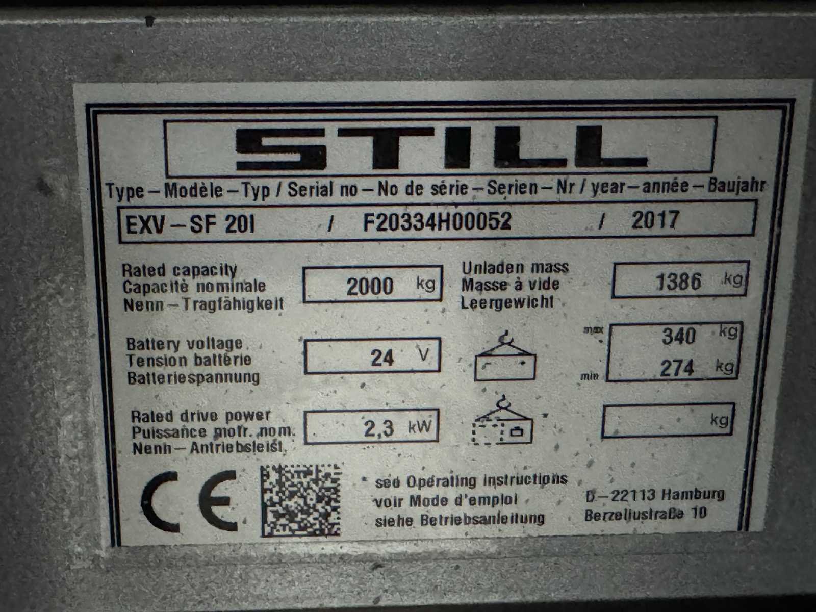 Merk: STILL Type: EXV-SF 20I Bouwjaar: 2017 Serienummer: F20334H00052 Hefvermogen: 2000kg Hefhoogte: 4112mm Lepellengte: 1150mm Afgelezen urenstand: 3424 Minimale doorrijhoogte: 1920mm Meerij stapelaar: true