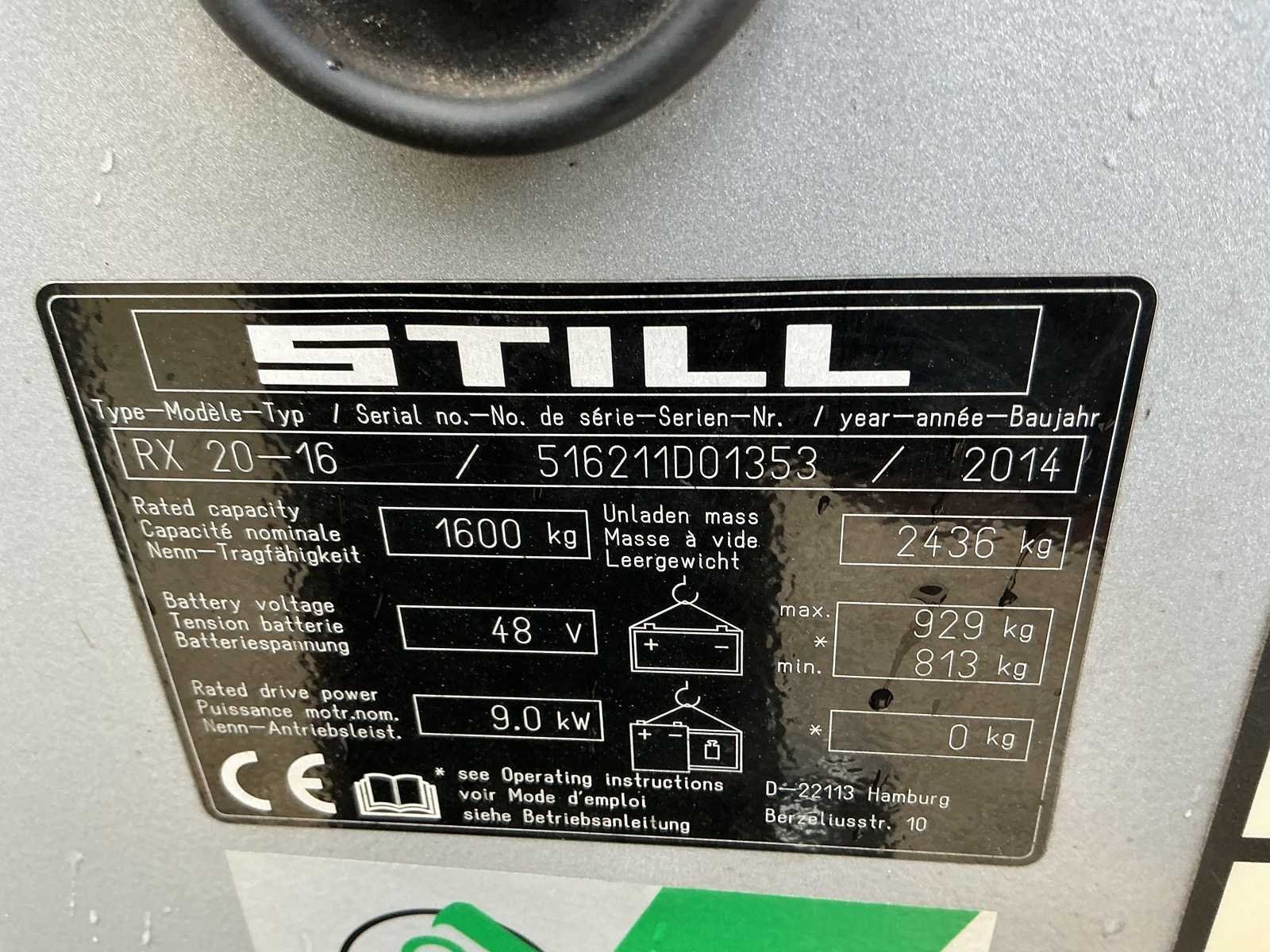 Merk: STILL Type: RX20-16 Bouwjaar: 2014 Serienummer: 516211D01353 Mast: Triplex Aantal wielen: 3 Afgelezen urenstand: 2820 Free-lift: true Side-shift: true Triple mast: true Hefvermogen: 1600kg Lepellengte: 1200mm Hefhoogte: 4920mm Minimale doorrijhoogte: 2160mm