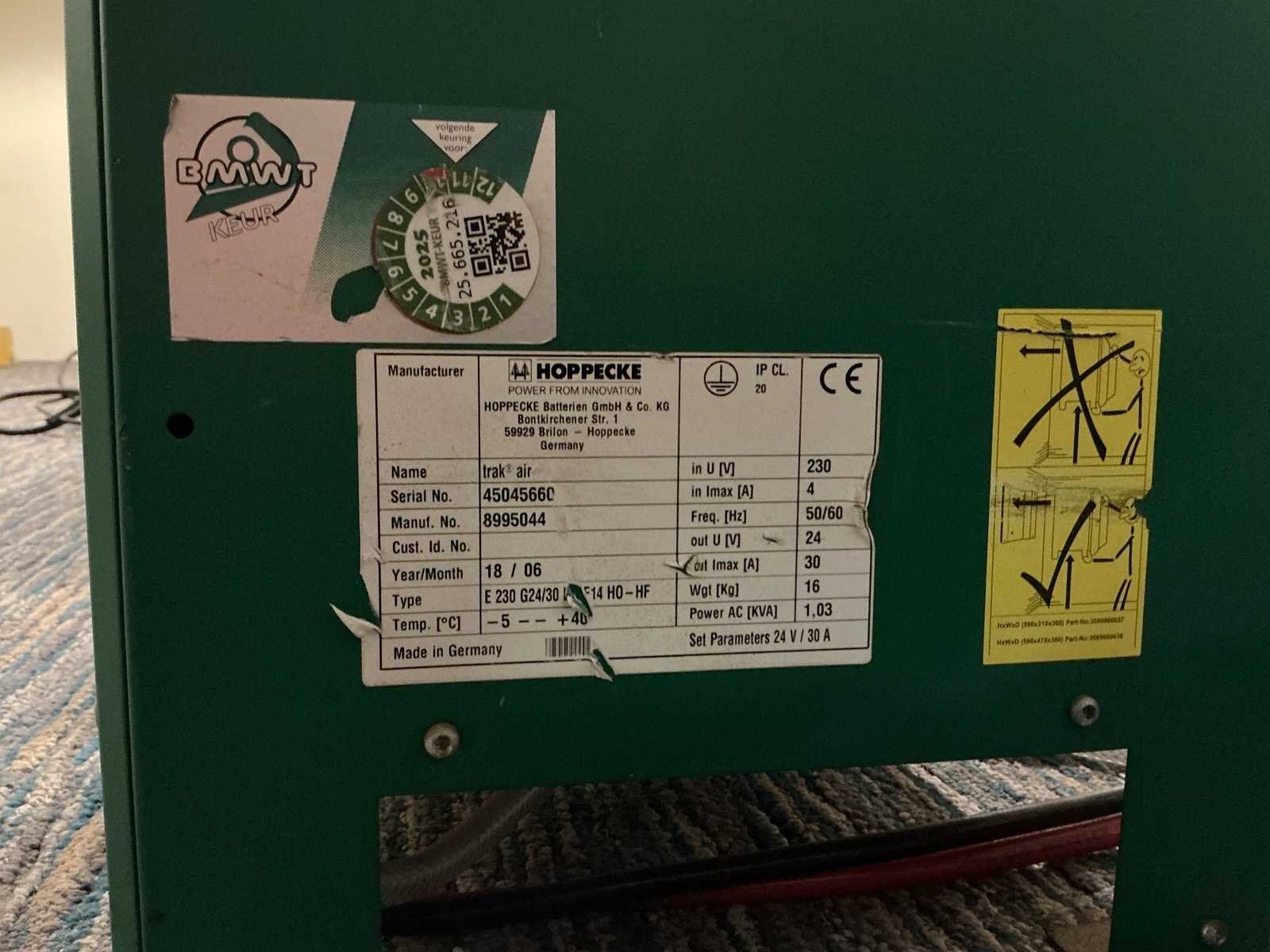 Merk: HOPPECKE Type: 24V 30A Bouwjaar: 2018 Spanning: 24V Laadstroom: 30A