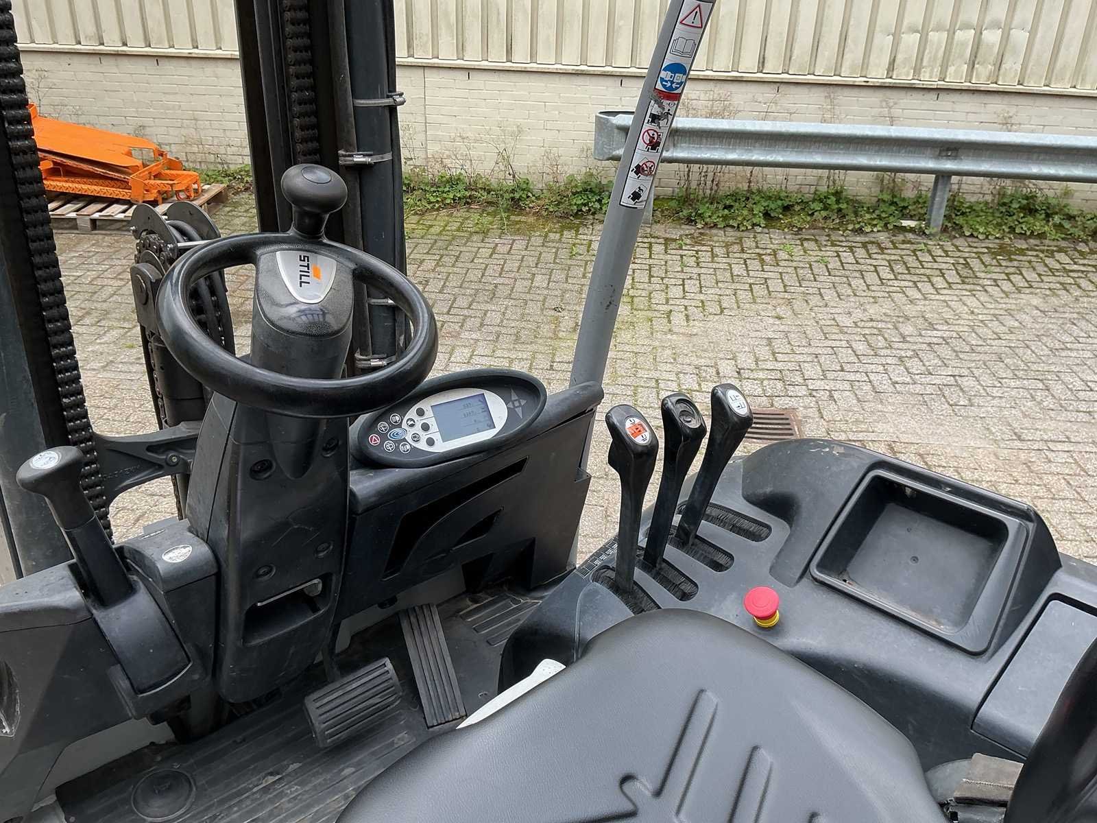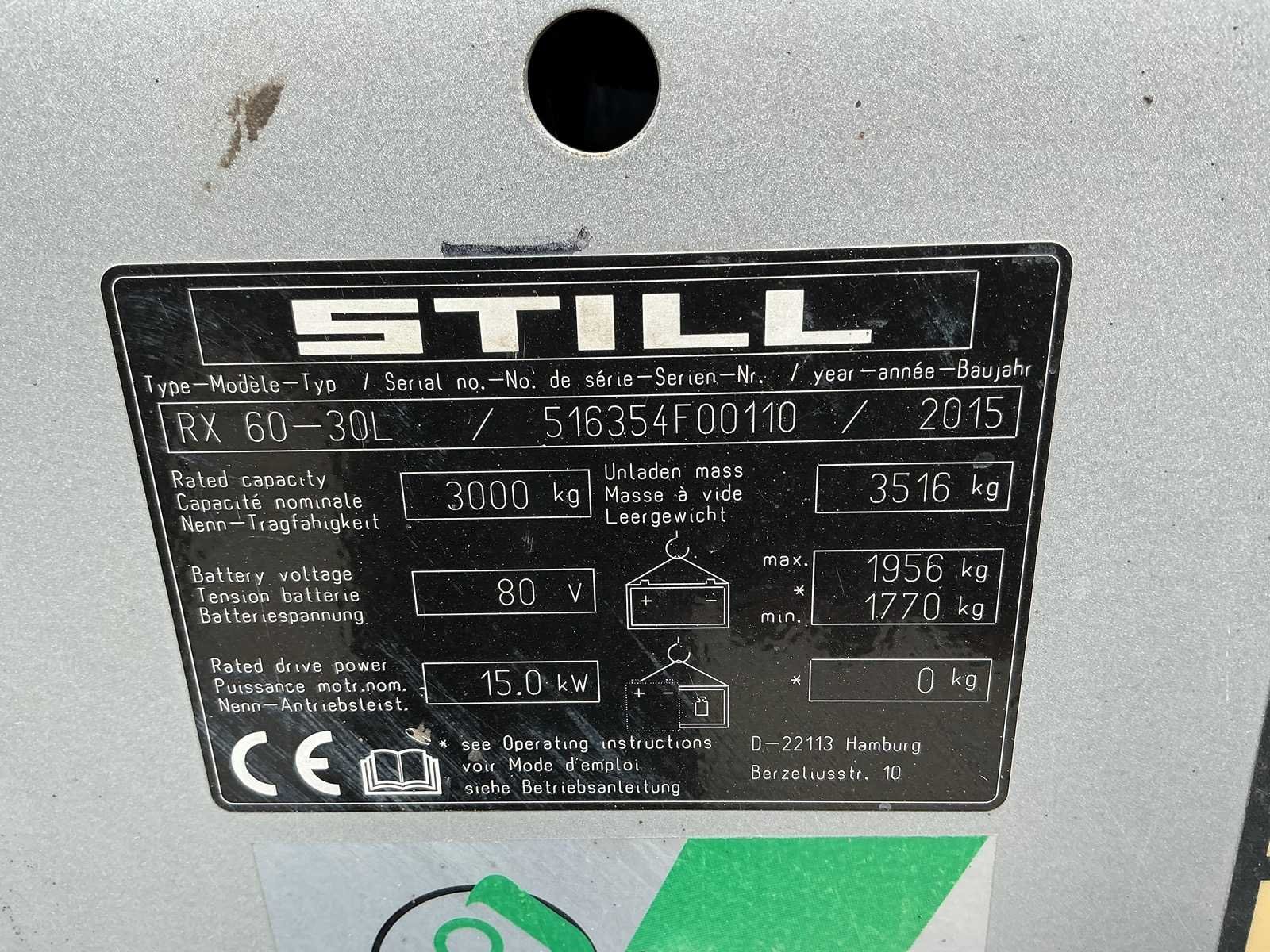 Merk: STILL Type: RX60-30 Bouwjaar: 2015 Serienummer: 51635400110 Mast: Triplex Aantal wielen: 4 Afgelezen urenstand: 9387 Free-lift: true Side-shift: true Triple mast: true Hefvermogen: 3000kg Lepellengte: 1190mm Hefhoogte: 5390mm Minimale doorrijhoogte: 2475mm