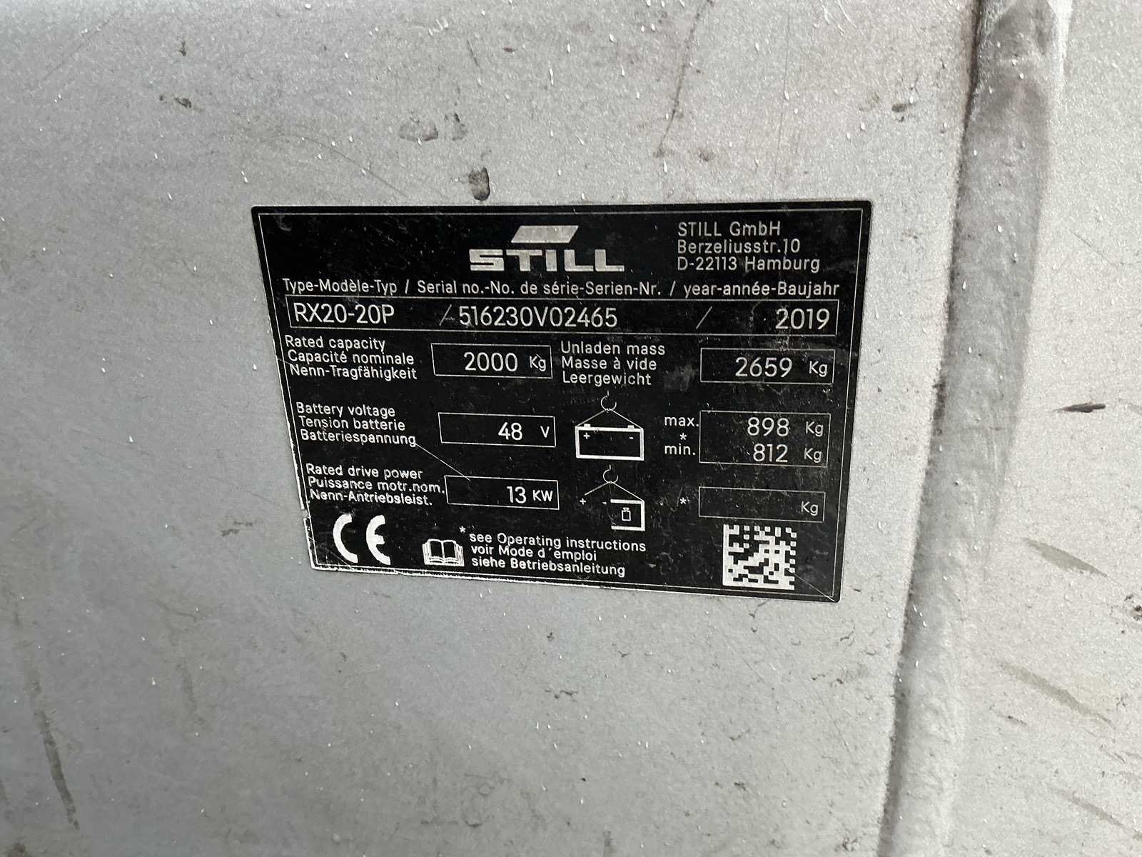 Merk: STILL Type: RX20-20 Bouwjaar: 2019 Serienummer: 516230V02465 Mast: Drieklank Aantal wielen: 4 Afgelezen urenstand: 7967 Free-lift: true Side-shift: true Duplex mast: false Triple mast: true Hefvermogen: 2000kg Lepellengte: 1000mm Hefhoogte: 4480mm Minimale doorrijhoogte: 2060mm