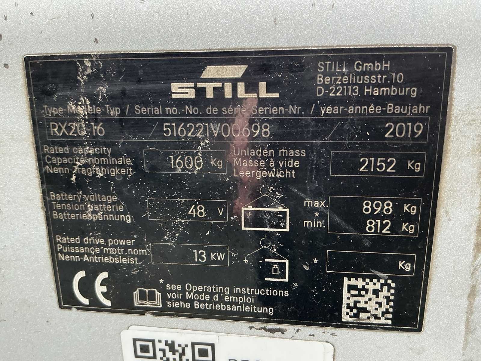 Merk: STILL Type: RX20-16 Bouwjaar: 2019 Serienummer: 516221V00698 Mast: Niho Aantal wielen: 3 Side-shift: true Duplex mast: true Hefvermogen: 1600kg Lepellengte: 900mm Hefhoogte: 3360mm Minimale doorrijhoogte: 2160mm