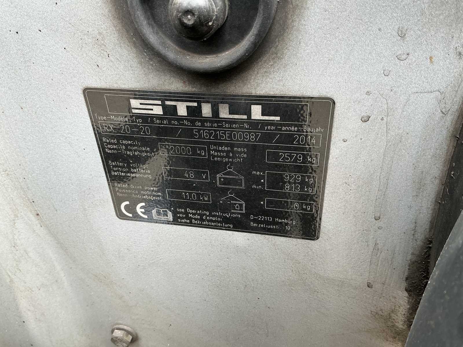 Telescopische Vorken Merk: STILL Type: RX20-20 Bouwjaar: 2014 Serienummer: 516215E00987 Mast: Niho Aantal wielen: 3 Afgelezen urenstand: 7938 Free-lift: true Duplex mast: true Hefvermogen: 2000kg Lepellengte: 1420mm Hefhoogte: 3270mm Minimale doorrijhoogte: 2160mm