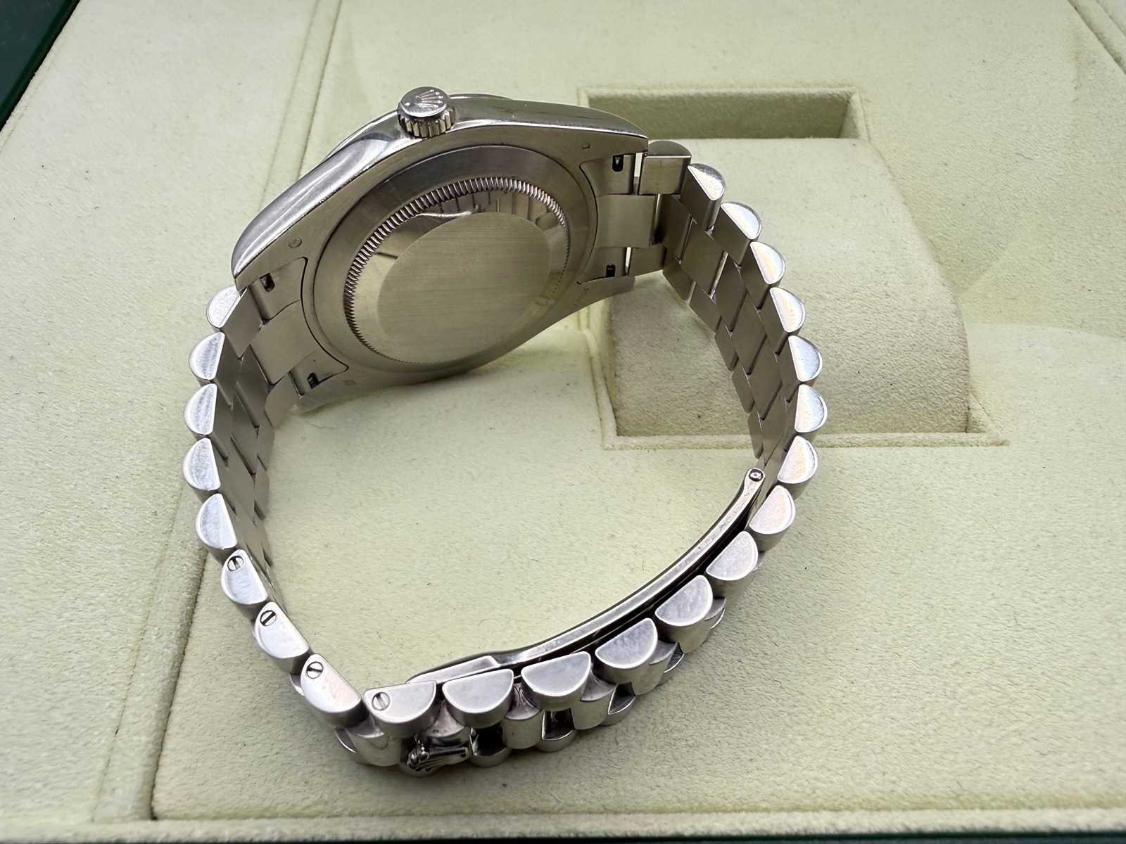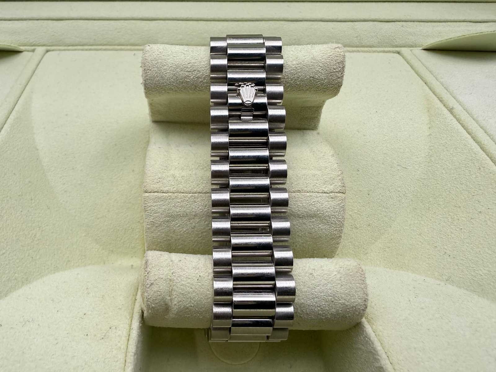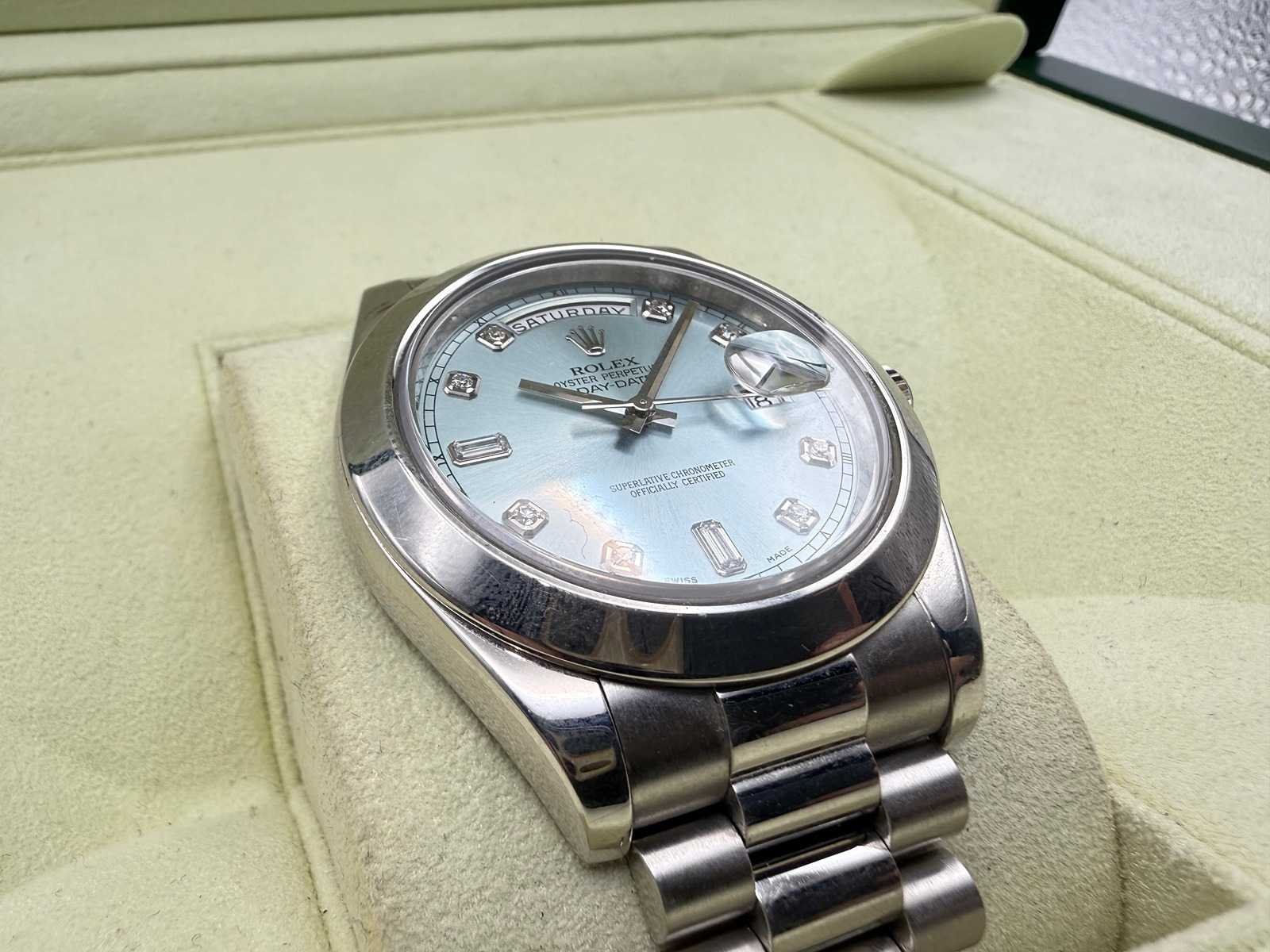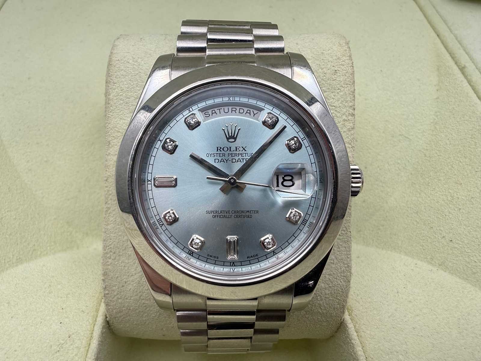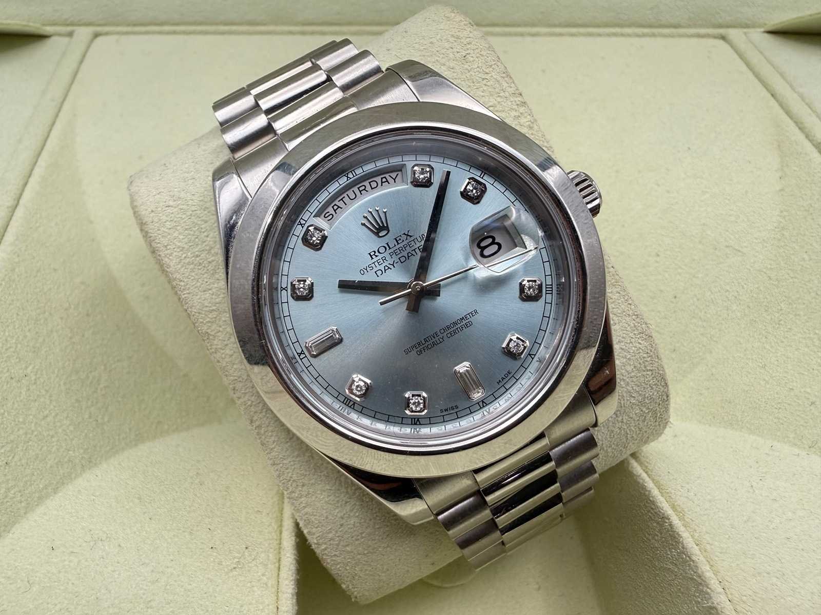 Offered here is a stunning Rolex Day-Date II 41mm, reference 218206, crafted entirely from 950 platinum and fitted with the iconic President bracelet. This exceptional model features the highly sought-after blue dial with factory diamond hour markers, giving the watch a refined yet powerful presence. The Day-Date II is known for its commanding 41mm case size, now discontinued, making this piece even more desirable among collectors. The watch comes as a full set, including the original Rolex box. Key Features: Model: Rolex Day-Date II Reference: 218206 Material: 950 Platinum Dial: Blue with factory diamond hour markers Bracelet: President (platinum) Case Size: 41 mm Condition: Excellent Set: Full set – Rolex presentation box A rare and prestigious platinum Day-Date II, combining exclusivity, elegance, and unmistakable Rolex presence. Perfect for collectors or those seeking one of Rolex’s most luxurious models. Merk: Rolex Model: Day-Date Bouwjaar: 12-2010 Referentienummer: 218206 Materiaal kast: Platina Materiaal horlogeband: Platina Materiaal sluiting: Platina Wijzerplaat: Diamond Dot Kastmaat: 41 mm