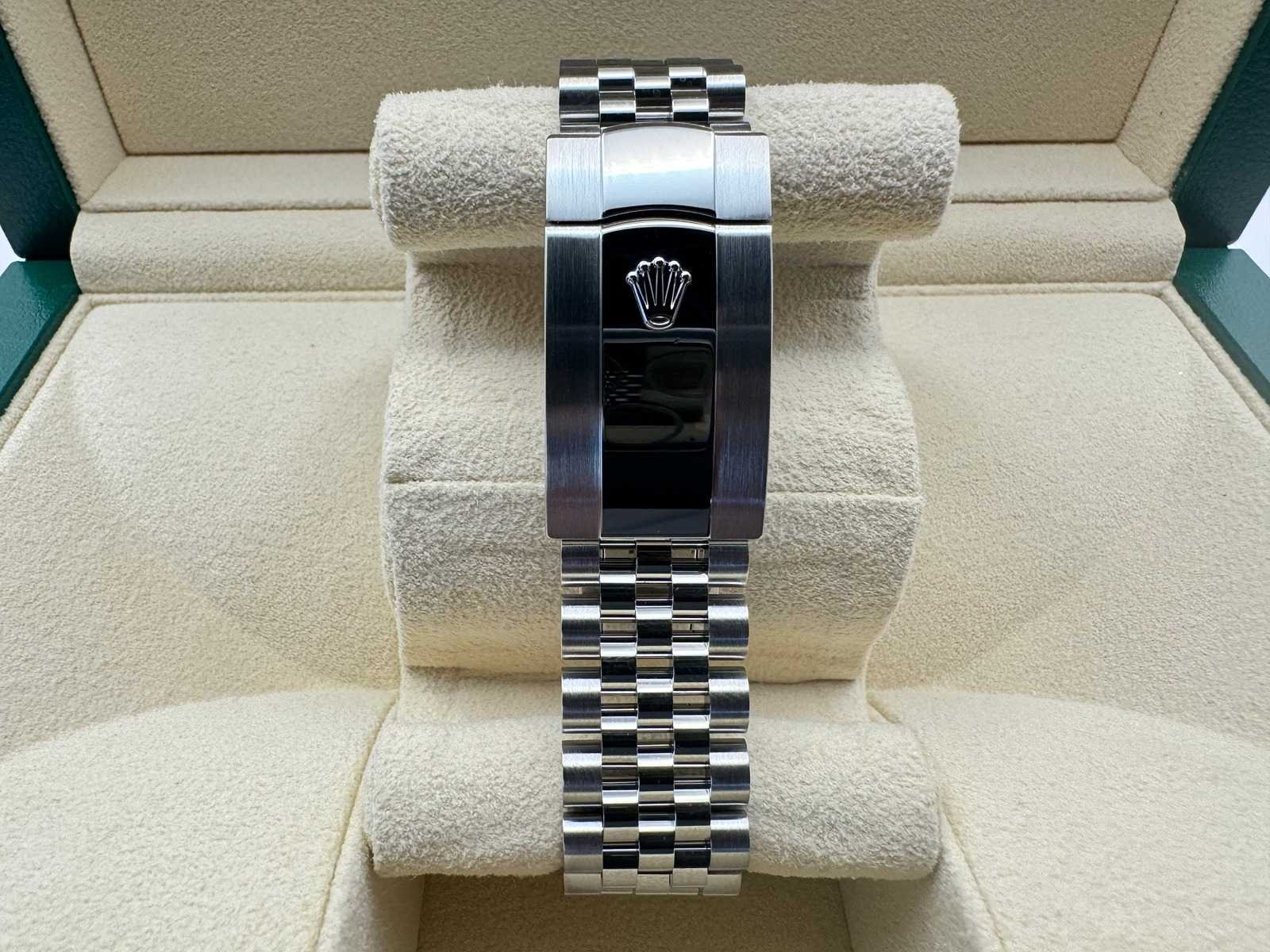 Brand new Rolex Datejust 41mm (Reference 126334), featuring a sleek black dial adorned with diamond hour markers. Paired with the iconic Jubilee bracelet, this timepiece combines luxury and elegance in a perfect balance. Delivered as a full set, it includes everything from Rolex and is backed by a full 5-year international warranty. Condition: Brand new, unworn Set: Full set – includes original box, papers, Rolex warranty card, booklets, leather pouch, and Rolex tag Model: Datejust 41 (126334), 41mm Oystersteel case with white gold fluted bezel Features: Black dial with diamond hour markers, Jubilee bracelet, automatic movement, 70-hour power reserve Warranty: Full 5-year international Rolex warranty This stunning Rolex Datejust 41 is a statement of refined luxury, perfect for those who appreciate the subtle brilliance of diamonds on a classic black dial. With its full set and 5-year Rolex international warranty, this watch is ready to be worn or added to any discerning collection. Merk: Rolex Model: Datejust 41 Bouwjaar: 2025 Referentienummer: 126334 Materiaal kast: Steel Materiaal horlogeband: Steel Jubilee Fluted Materiaal sluiting: Steel Wijzerplaat: Black Diamond Dot Kastmaat: 41 mm
