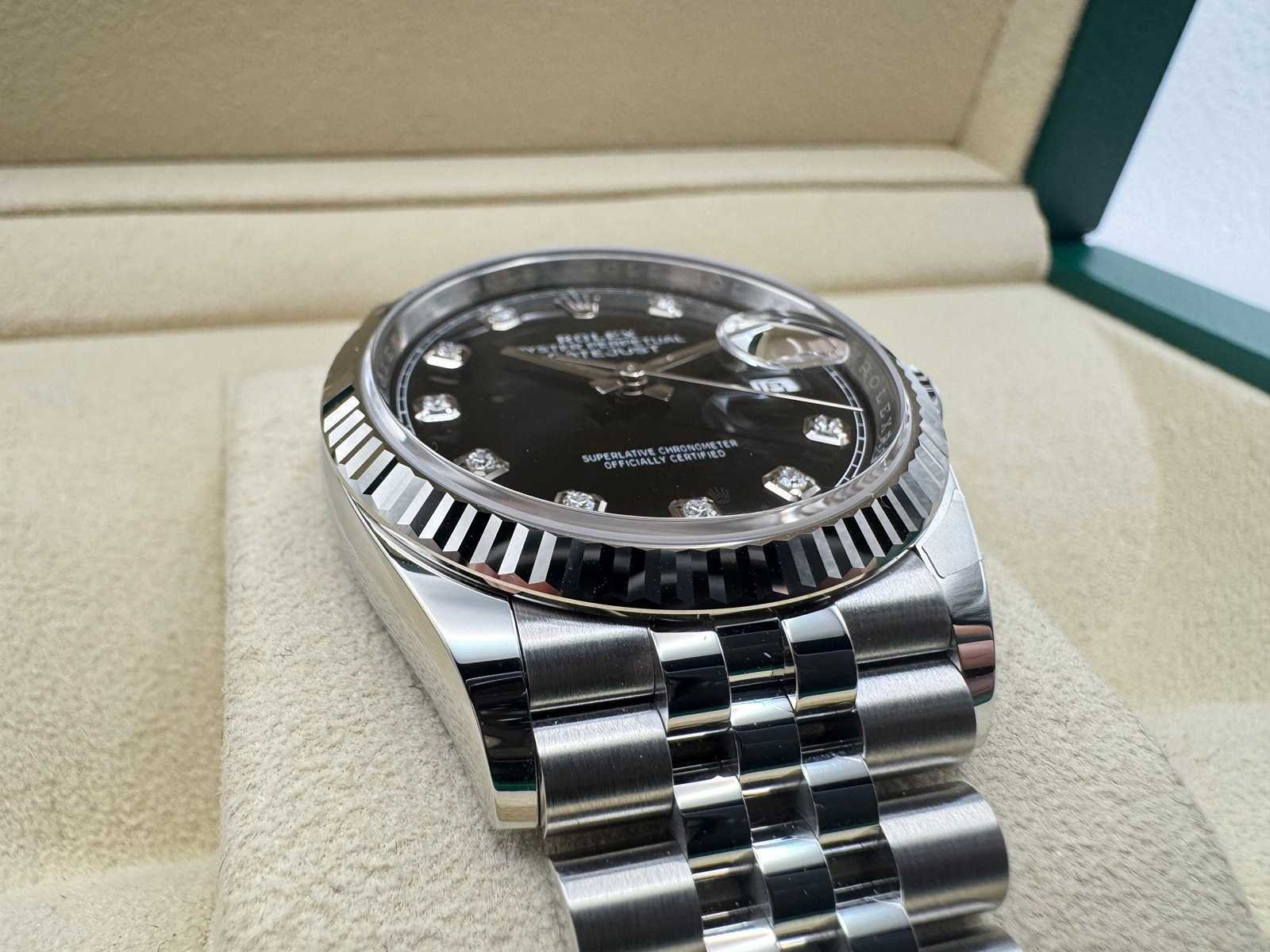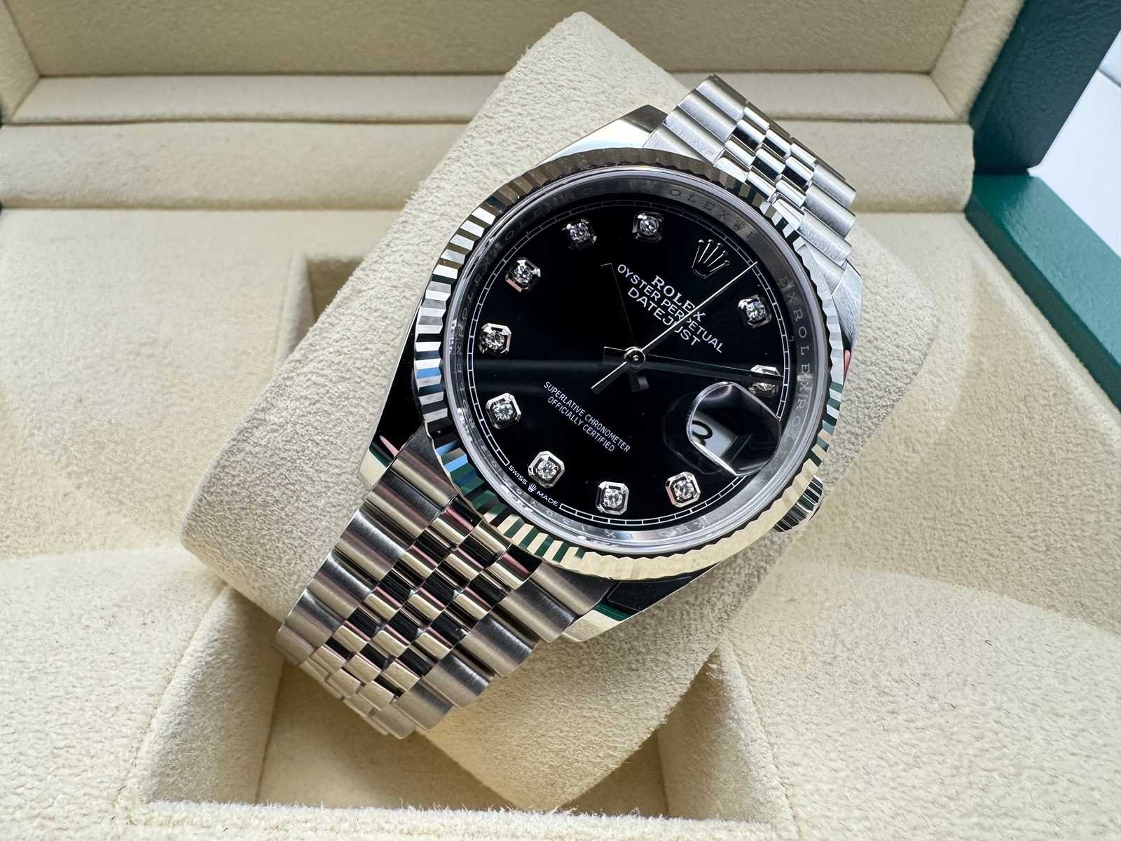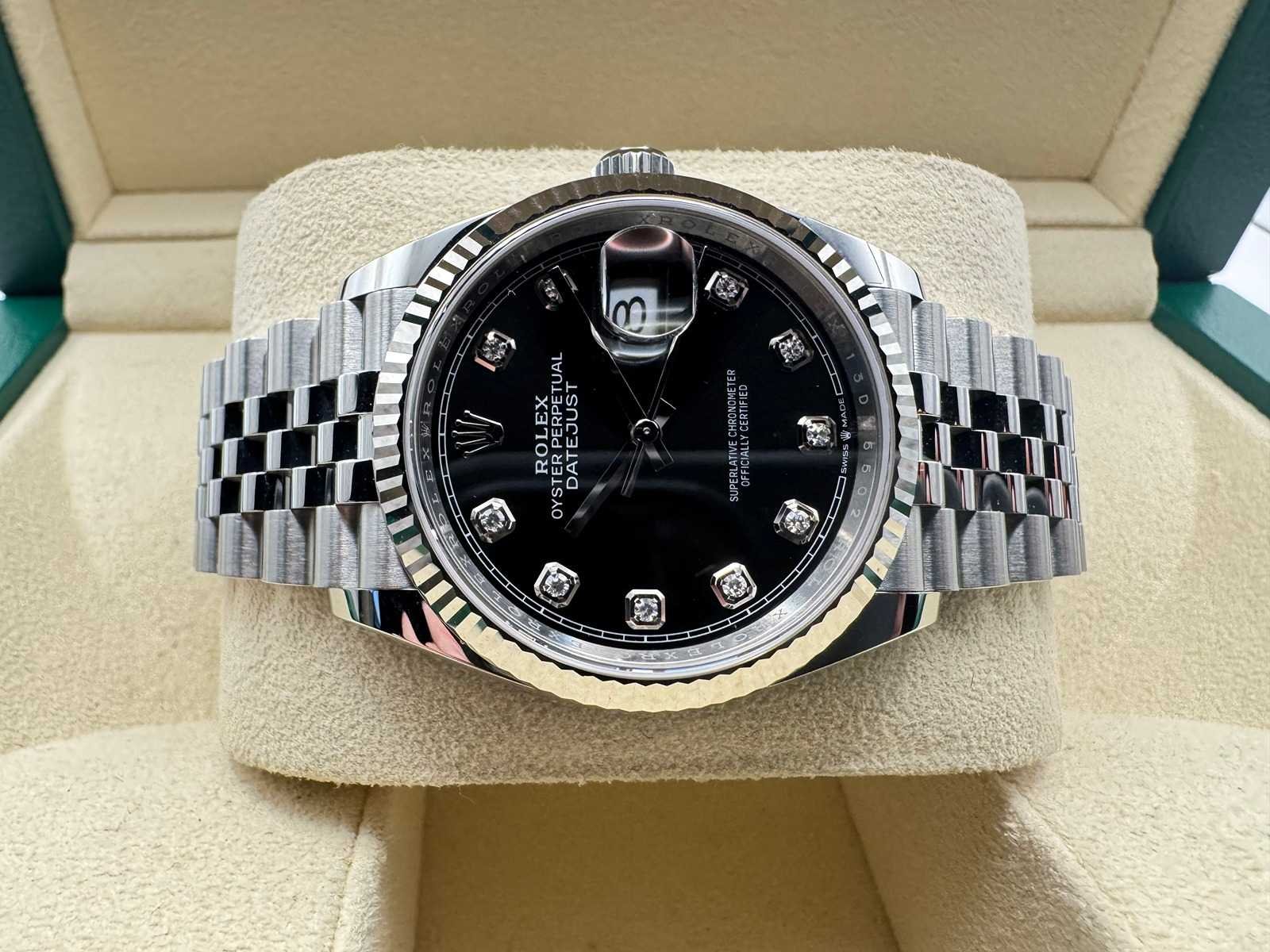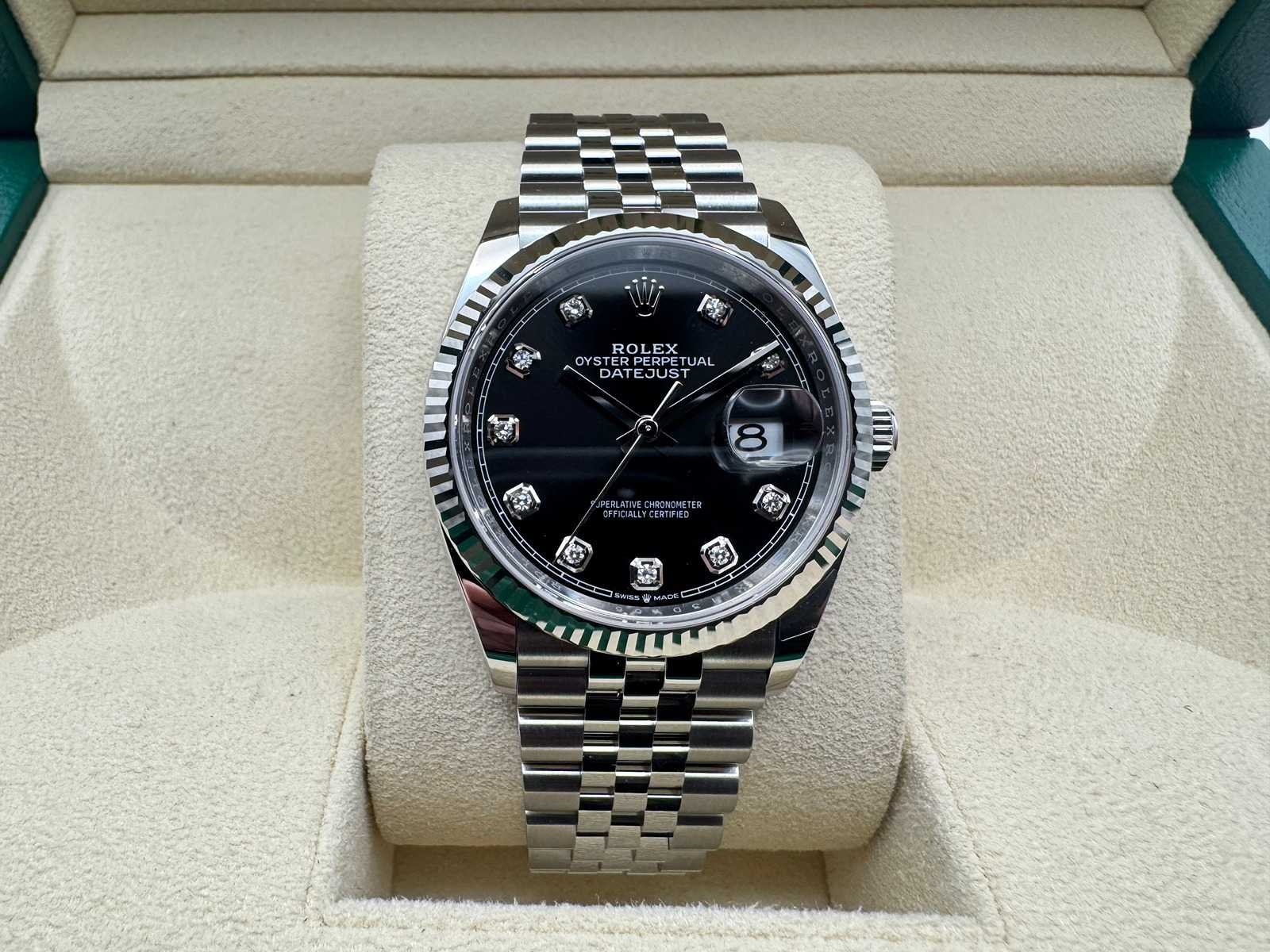 Rolex Datejust 36 Ref. 126224 – Steel, Jubilee Bracelet, Black Diamond Dial This brand-new, unworn Rolex Datejust 36 Ref. 126224 is crafted in stainless steel and features the timeless Jubilee bracelet. Its standout feature is the factory-set black dial with diamond hour markers, adding a touch of luxury to this classic design. The watch comes as a full set, including the original Rolex box, booklets, warranty card holder, and Rolex guarantee card. It is covered by the 5-year international Rolex warranty, ensuring complete peace of mind. Key Features: Model: Rolex Datejust 36 Ref. 126224 Condition: Brand new, unworn Material: Stainless steel Bracelet: Jubilee Dial: Black with factory-set diamond hour markers International warranty: 5 years remaining Full set: Includes box, papers, warranty card, and Rolex tag This stunning timepiece is perfect for those who appreciate understated elegance and Rolex craftsmanship. A classic with a luxurious twist, offered in new unworn condition. Merk: Rolex Model: Datejust 41 Bouwjaar: 2025 Referentienummer: 126300 Materiaal kast: Steel Materiaal horlogeband: Steel Jubilee Fluted Materiaal sluiting: Steel Wijzerplaat: Black Diamond Dot Kastmaat: 36 mm
