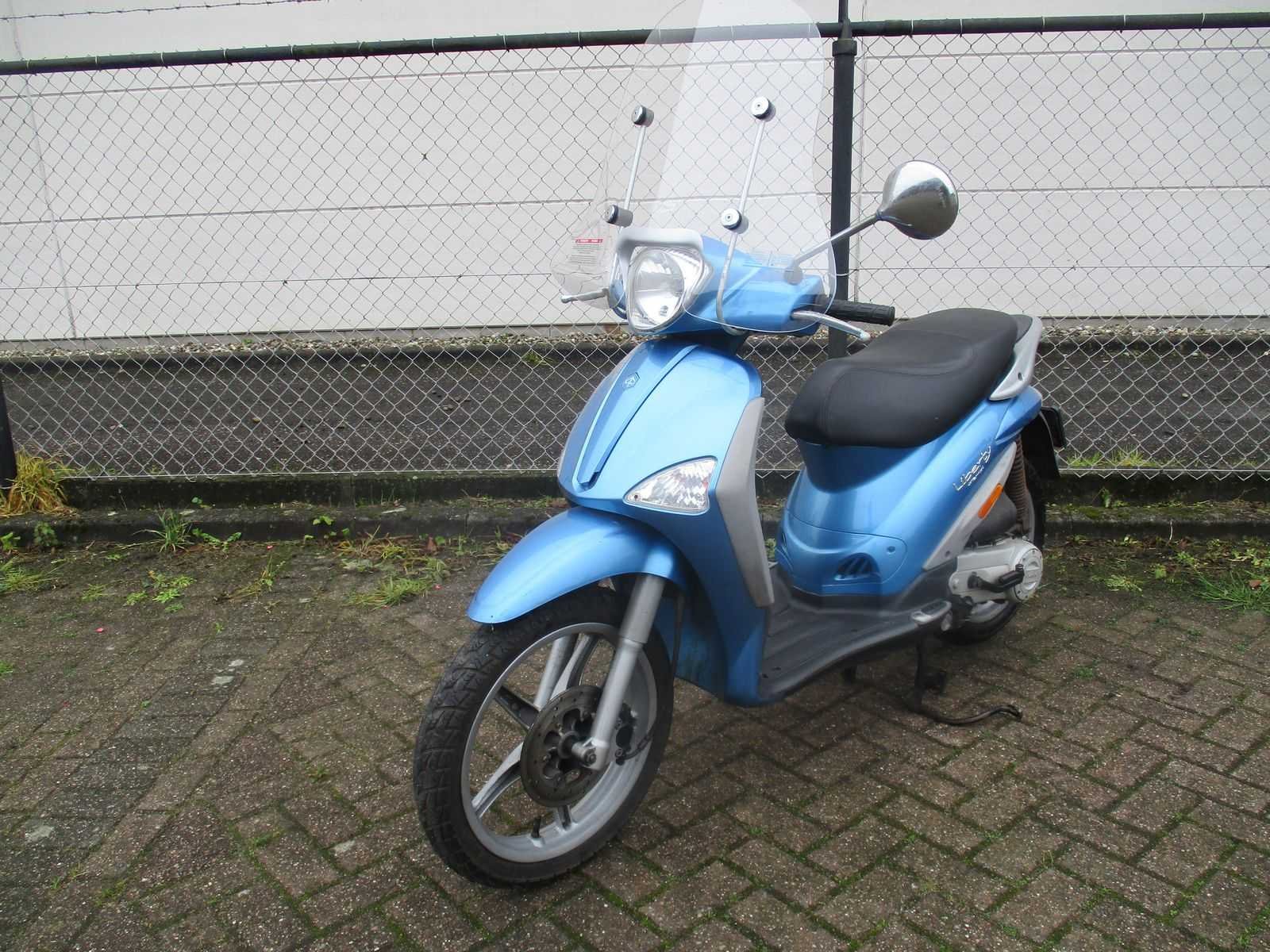 Bromscooter met 1 sleutel inclusief original windscherm. Scooter van 1 ste eigenaar, Piaggio dealer onderhouden, motor loopt. Accu leeg/defect. Merk: Piaggio Model: Bromscooter Type: Liberty 4 tempi Handelsbenaming: Liberty Snelheid: 45km/h Kenteken: FZ-197-S Datum eerste toelating: 29-11-2008 Bouwjaar: 2008 Transmissie: automaat Brandstof: benzine Kleur: blauw Afgelezen kilometerstand: 43198km