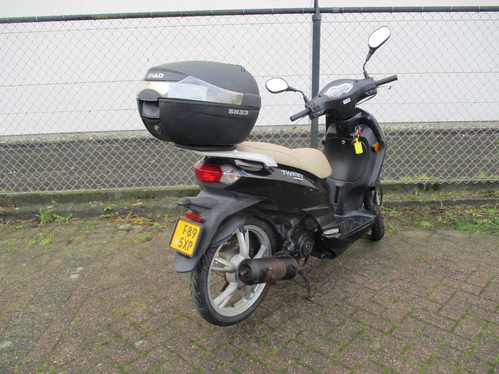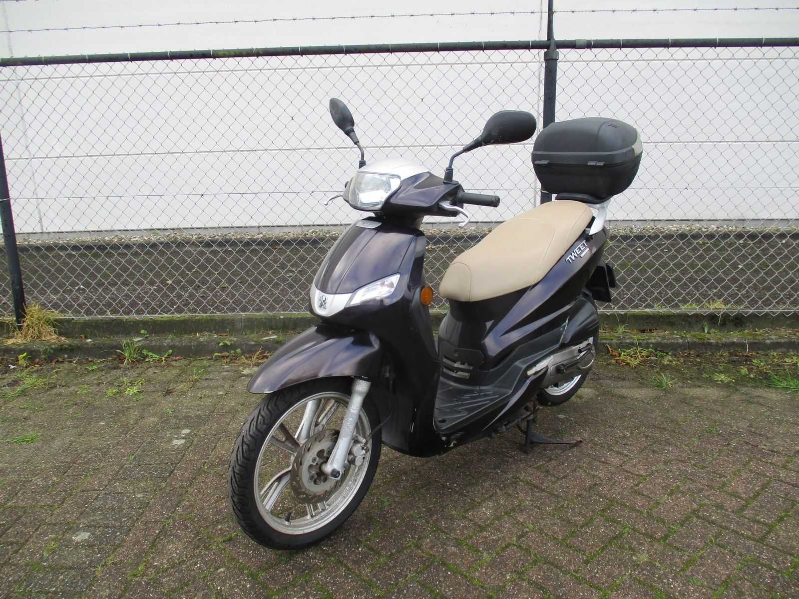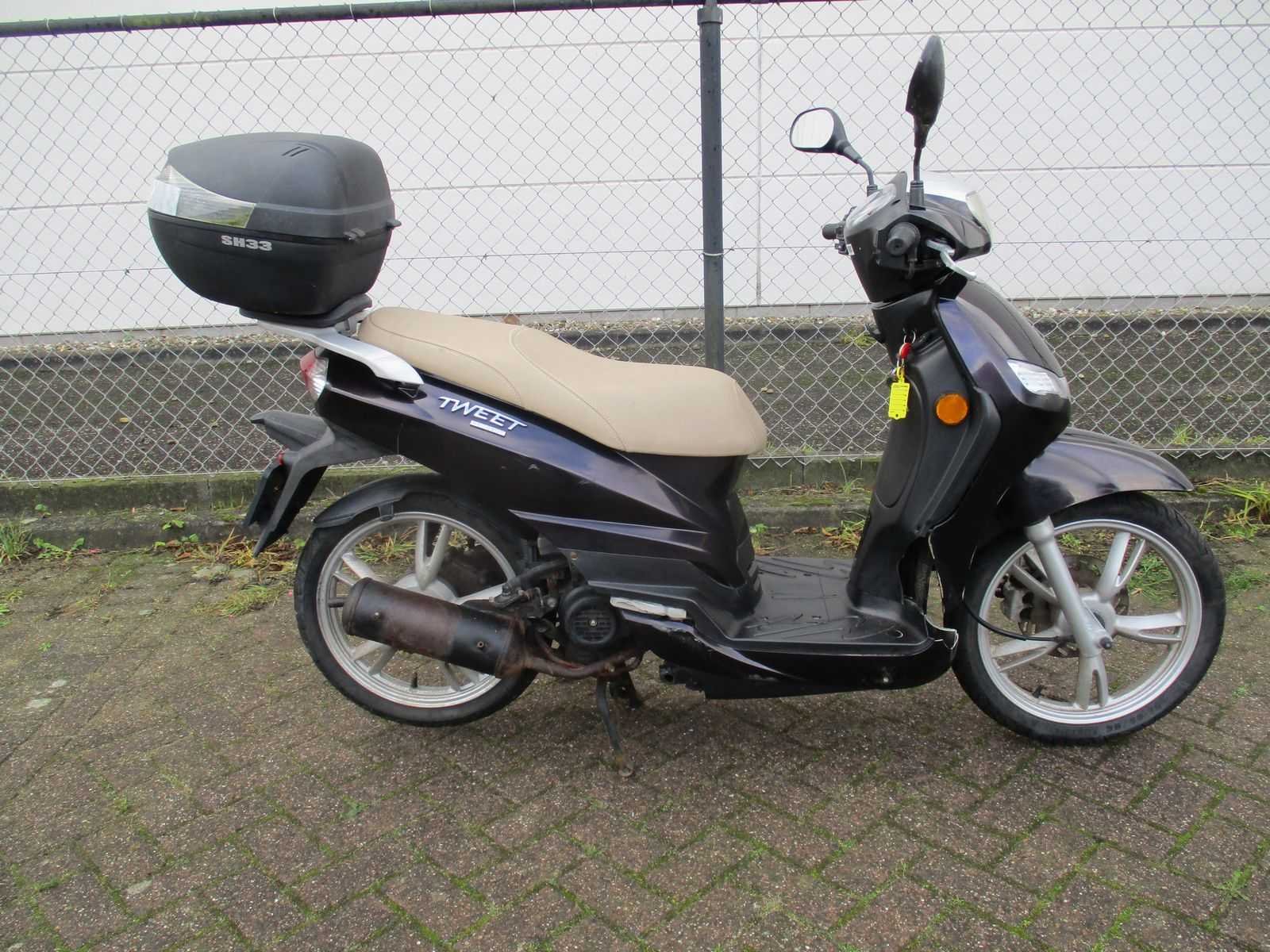 Bromscooter met 2 sleutels inclusief Top koffer. Scooter met rondom gebruikers sporen, motor loopt. Staat van onderhoud onbekend. Merk: Peugeot Tweet Model: Bromscooter Snelheid: 45km/h Kenteken: F-895-XP Datum eerste toelating: 17-10-2014 Bouwjaar: 2014 Transmissie: automaat Brandstof: benzine Kleur: n.v.t. Afgelezen kilometerstand: 30455km