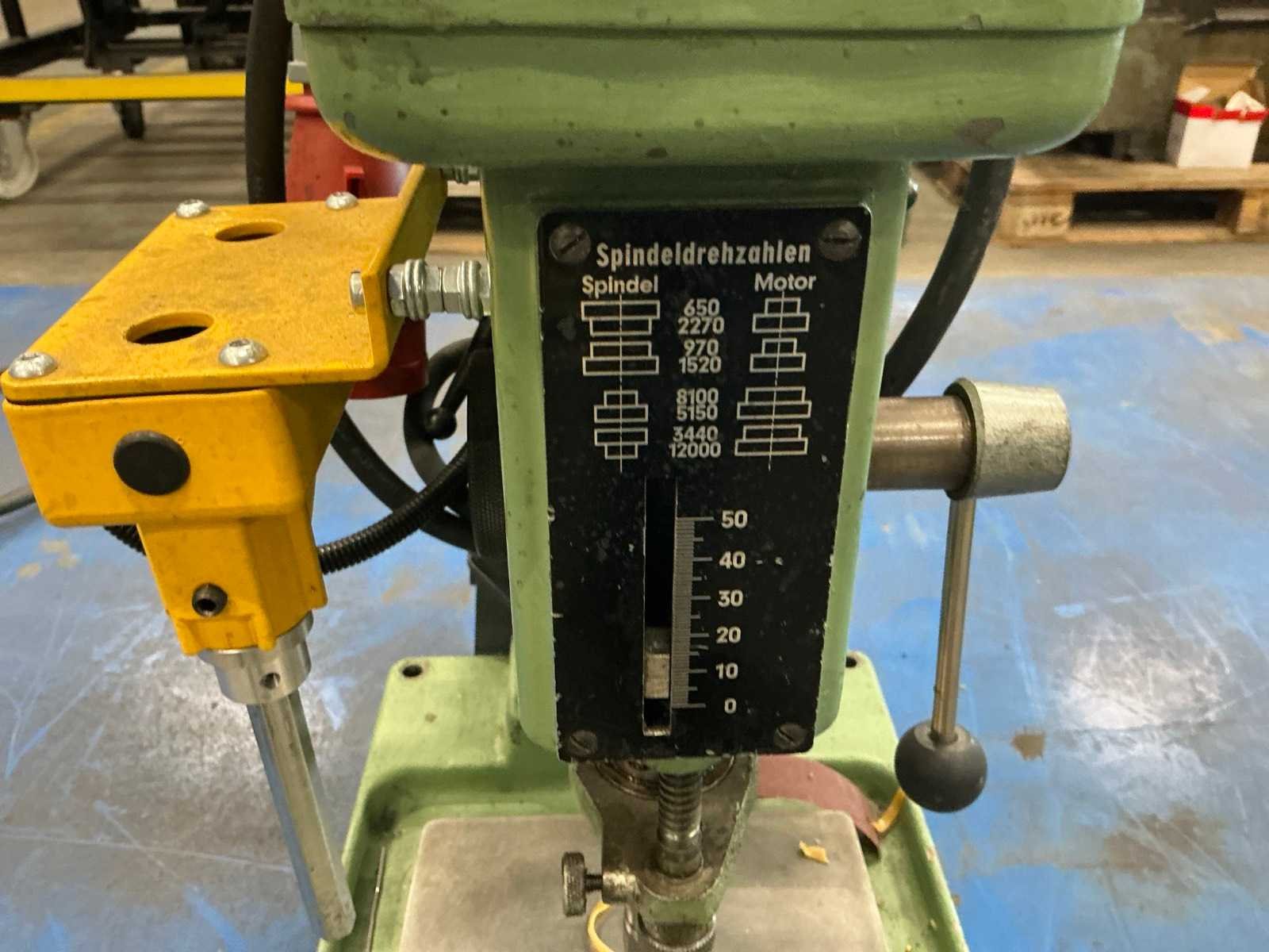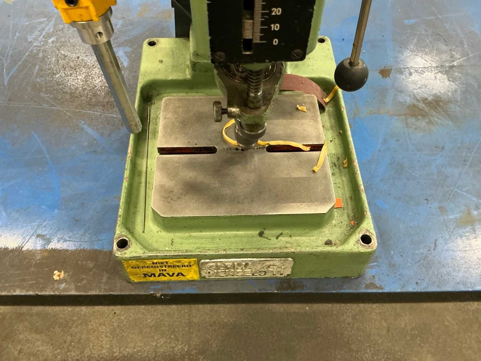 Merk: Germa Type: B4 Aantal snelheden: 8 Spindelsnelheid van n =: 650rpm Spindelsnelheid tot n =: 12000rpm Boordiepte: 50mm Uitlading: 130mm Tafel afmeting l: 160mm Tafel afmeting b: 180mm Aansluiting: 400V Afmeting l: 550mm Afmeting b: 250mm Afmeting h: 500mm