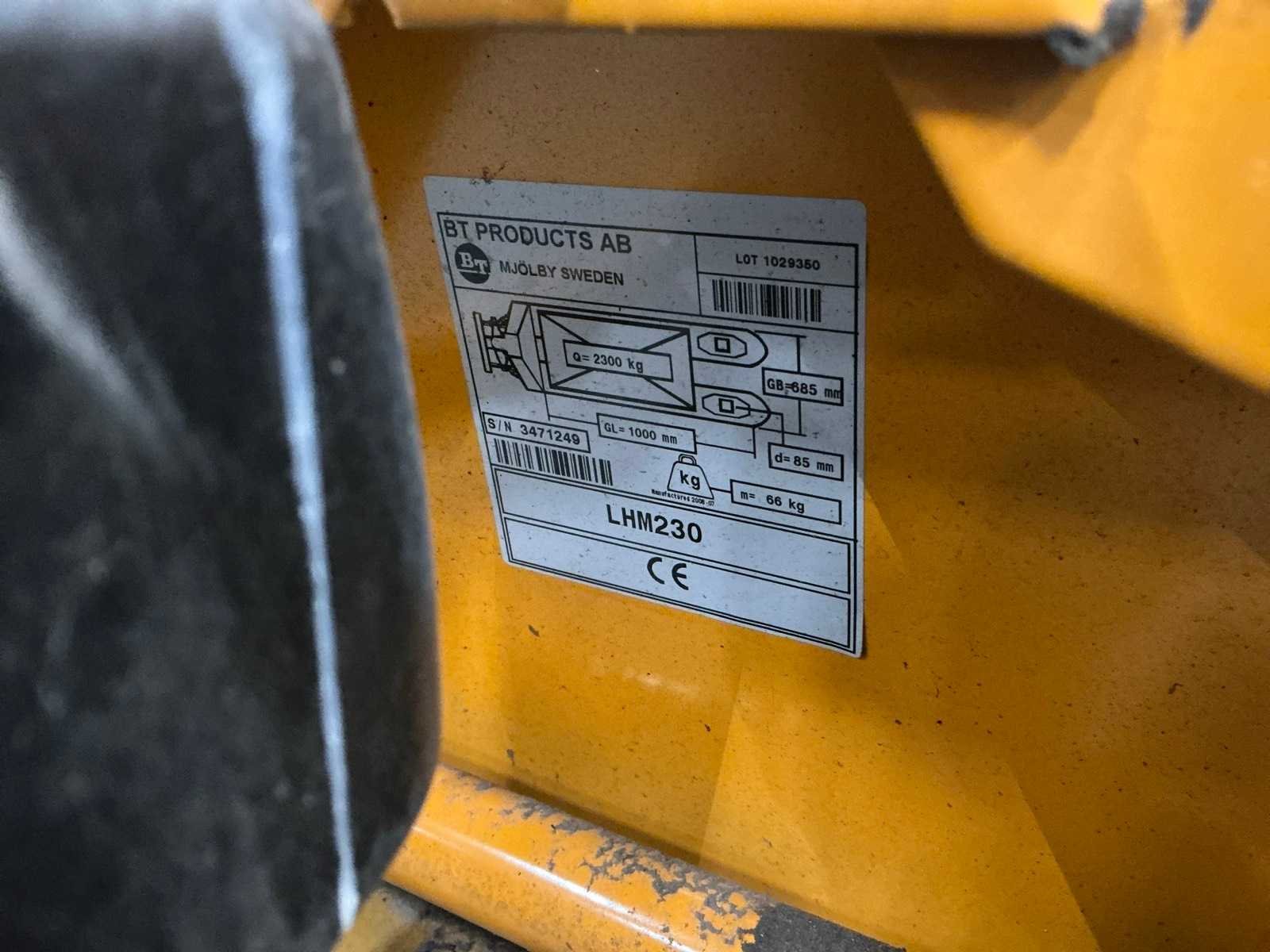 Merk: BT Lifter Type: LHM250 Hefvermogen: 2300kg Lepellengte: 1000mm Eigen gewicht: 66kg Totale afmeting L: 1400mm Totale afmeting Breedte: 670mm Totale afmeting Hoogte: 1230mm