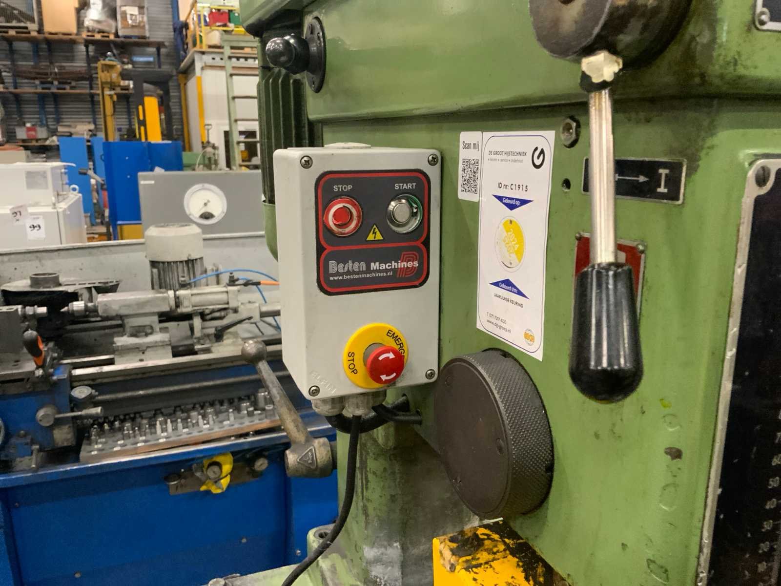 Met boorklem op onderstel Merk: Wörner Boorcapaciteit: 13mm Snelheid van n =: 75rpm Snelheid tot n =: 3500rpm Boordiepte: 120mm Uitlading: 260mm Opname mc: 2 Tafel afmeting l: 435mm Tafel afmeting b: 330mm Aansluiting: 380V Afmeting l: 860mm Afmeting b: 610mm Afmeting h: 1680mm