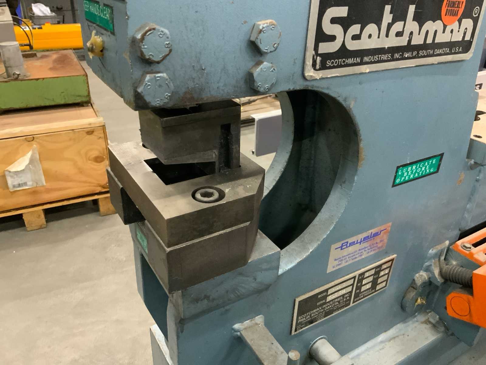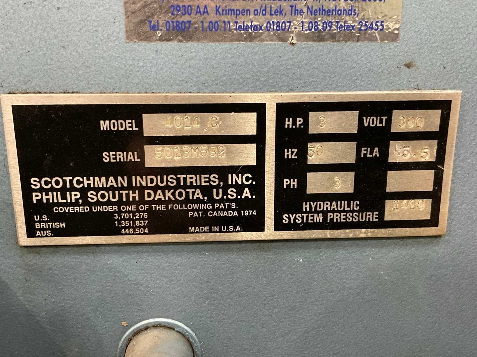 Capaciteit: 40 ton, voorzien van uitkap inrichtin: 50 x 45 mm Merk: Schotchman Type: 4014 C Serienummer: 5013X592 Afmeting l: 1300mm Afmeting b: 700mm Afmeting h: 1360mm