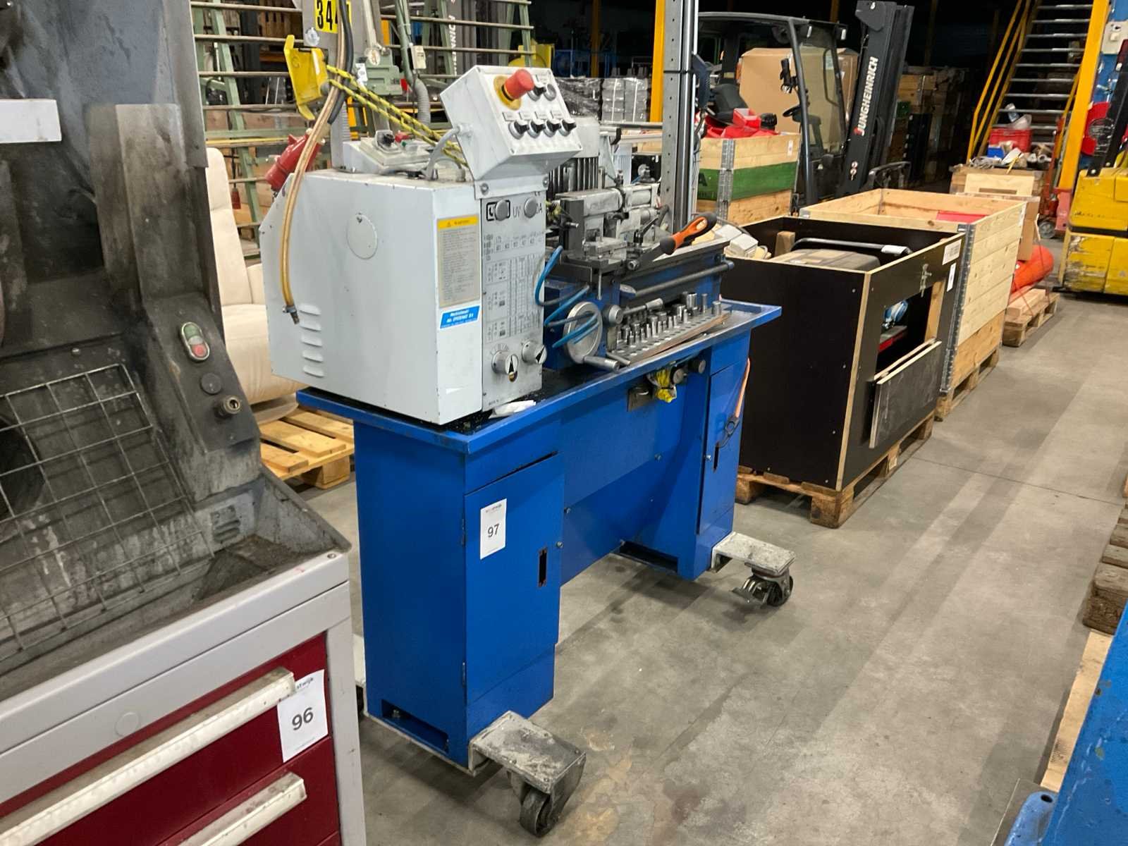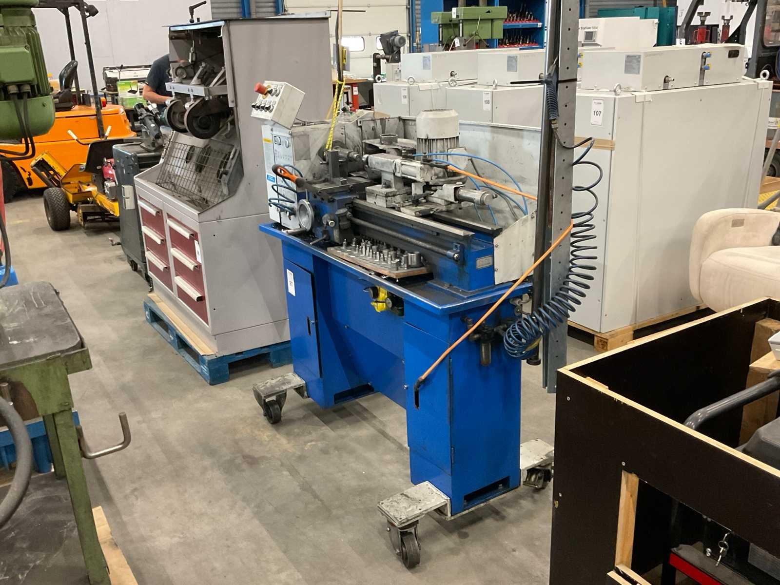 Voorzien van pneumatische gevoede staalborstel inrichting en tegencenter, op verrijdbaar onderstel. inclusief toebehoren Bouwjaar: 2002 Serienummer: 0260725 Draailengte: 500mm Draai: 260mm Holle spil Ø: 28mm Aantal snelheden: 6 Snelheid van n =: 125rpm Snelheid tot n =: 2000rpm Aansluiting: 380V Afmeting l: 1460mm Afmeting b: 820mm Afmeting h: 3270mm