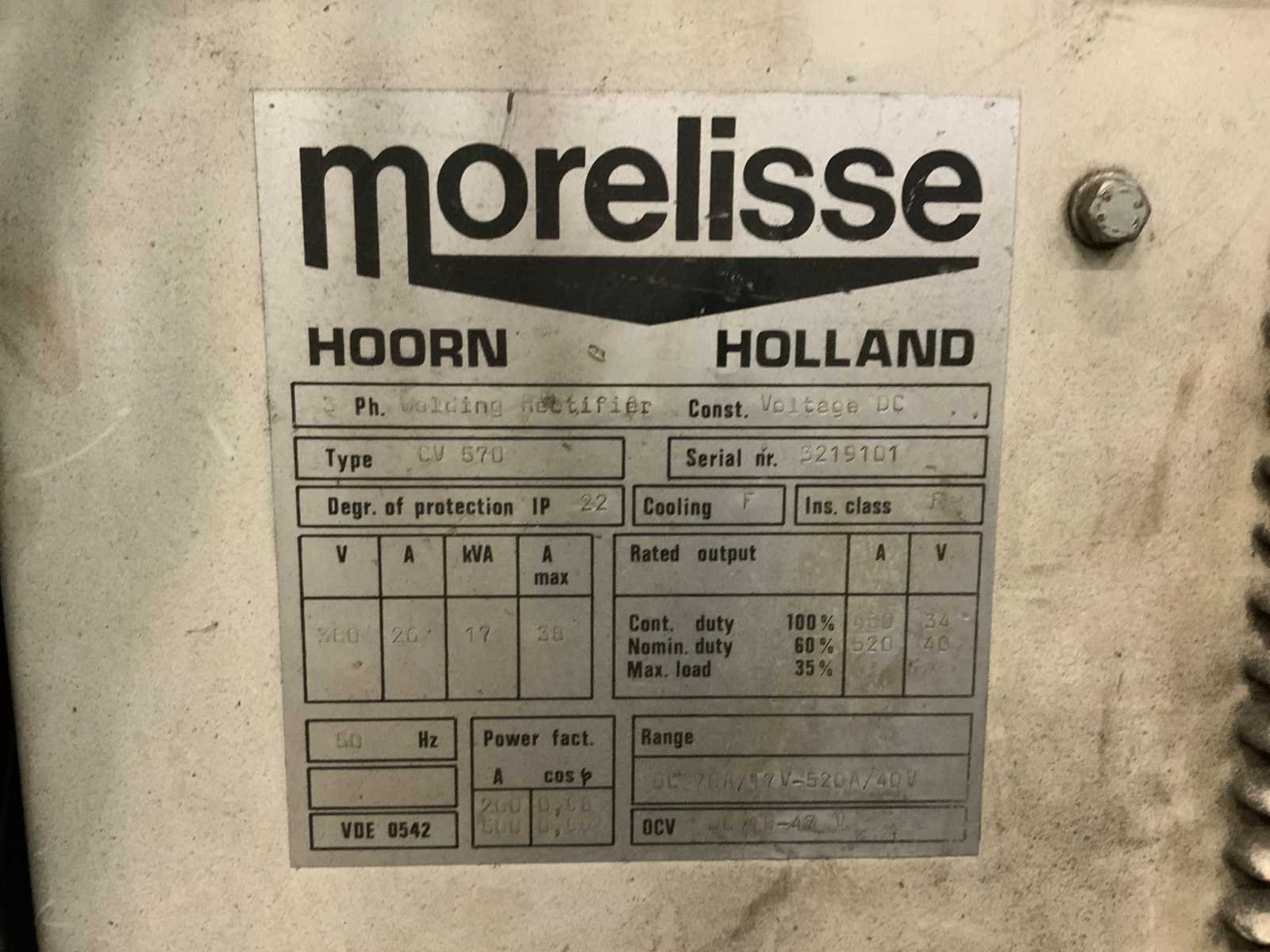 Watergekoeld. Merk: Morelisse Type: CV 570 Serienummer: 3219101 Mig type: true Ampère belasting: 520A Draadaanvoerunit: true Aansluiting: 380V Handboek aanwezig: true Afmeting l: 1200mm Afmeting b: 800mm Afmeting h: 1250mm