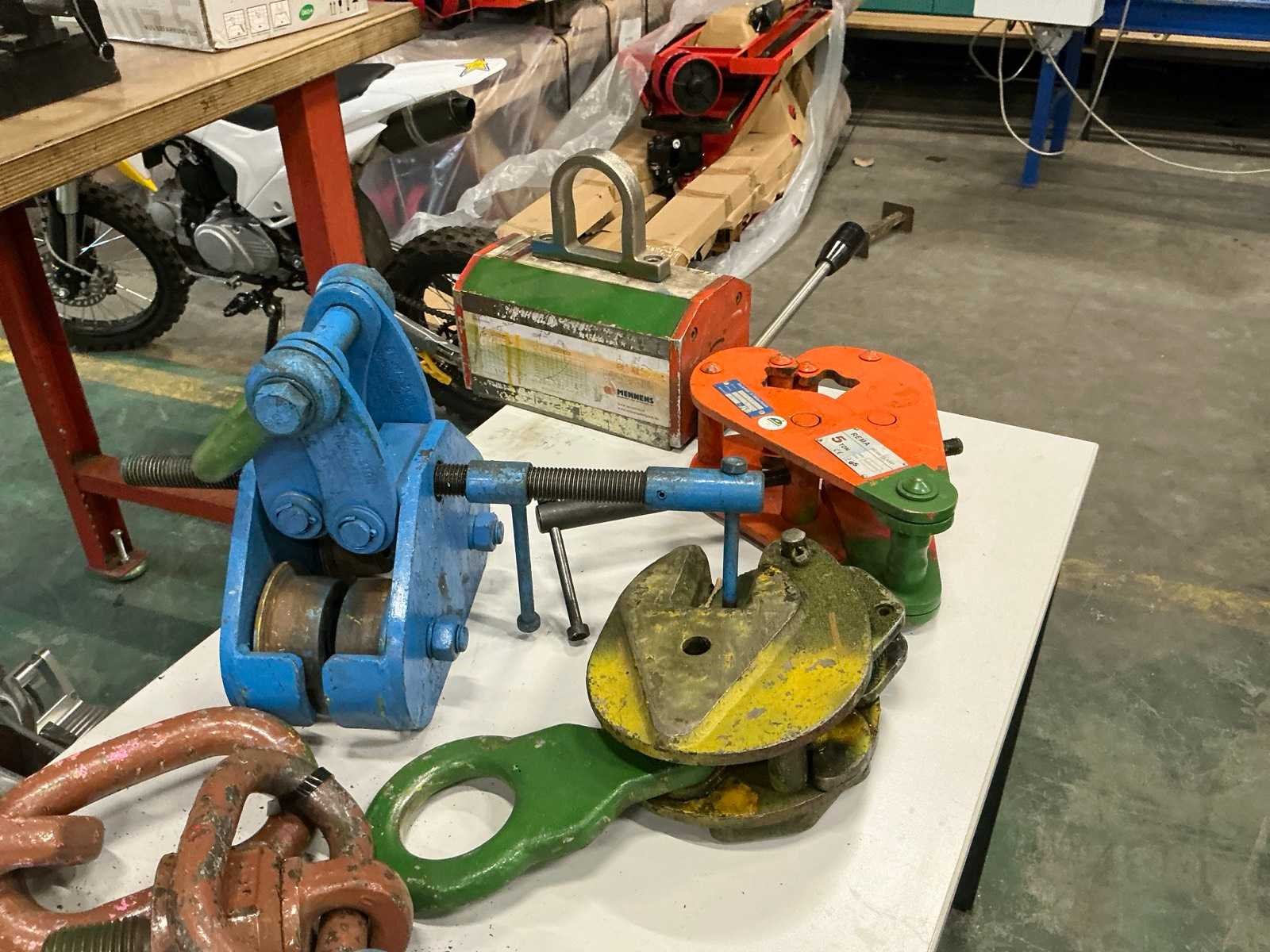 Bestaande uit onder andere: hijsmagneet, hijsogen, harpsluitingen, balkklem, loopkat, platenklem
