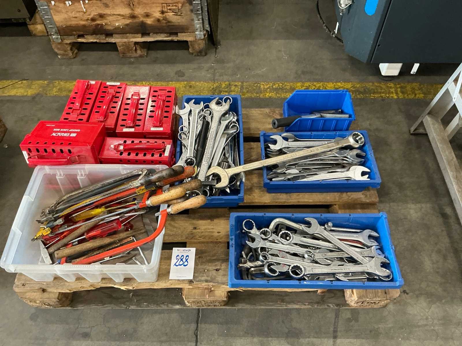 Diverse sleutels, schroevendraaiers, hamers, ijzerzagen; 7x Brady stalen opslagbox; Zonder pallet