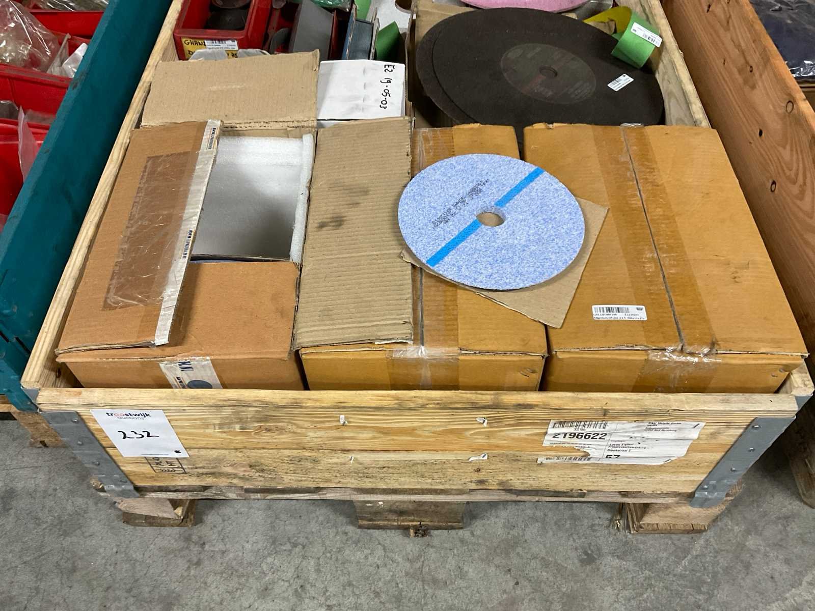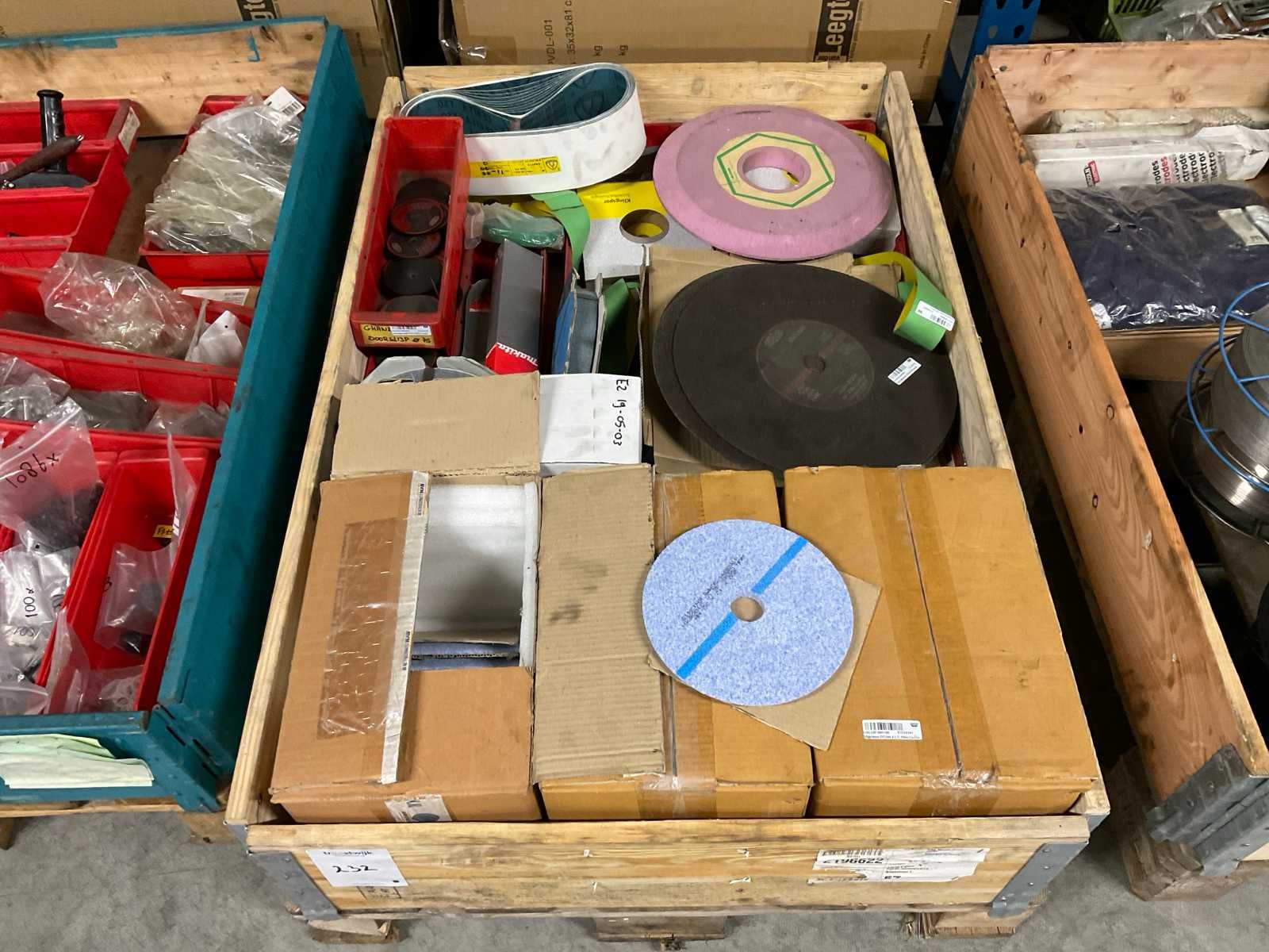 Bestaande uit diverse slijpschijven, slijpstenen, kettingen, schuurband, kunststof afdopmaterialen en kunststof ton ø ca. 50 cm hoogte ca. 70 cm Pallet en palletrand niet inbegrepen
