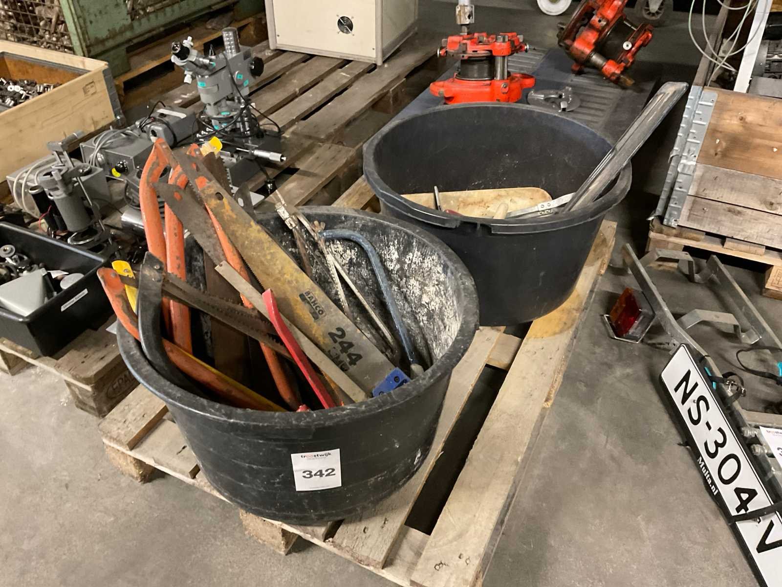 Bestaande uit: Takkenzagen, metaalbeugelzagen, tegel en stucadoorsgereedschap in 2 speciekuipen