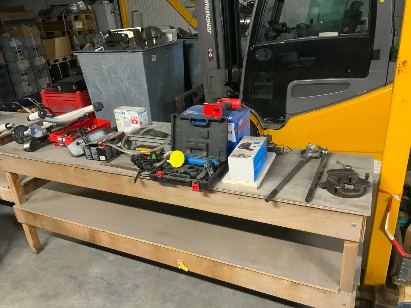 Waaronder: 1 Ferm verfspuit, 1 HBM polijstmachine, 1 diascanner, 1 power booster, 1 fiets home trainer, 1 haakse slijptol