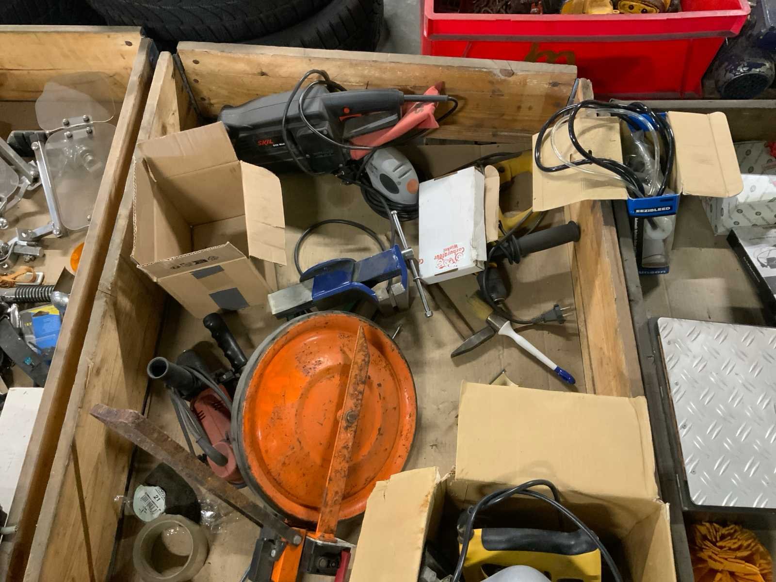 Waaronder: 1 Mannesmann invalzaag, 1 meetwiel, 1 bankschroef, 1 Skill bandschuurmachine