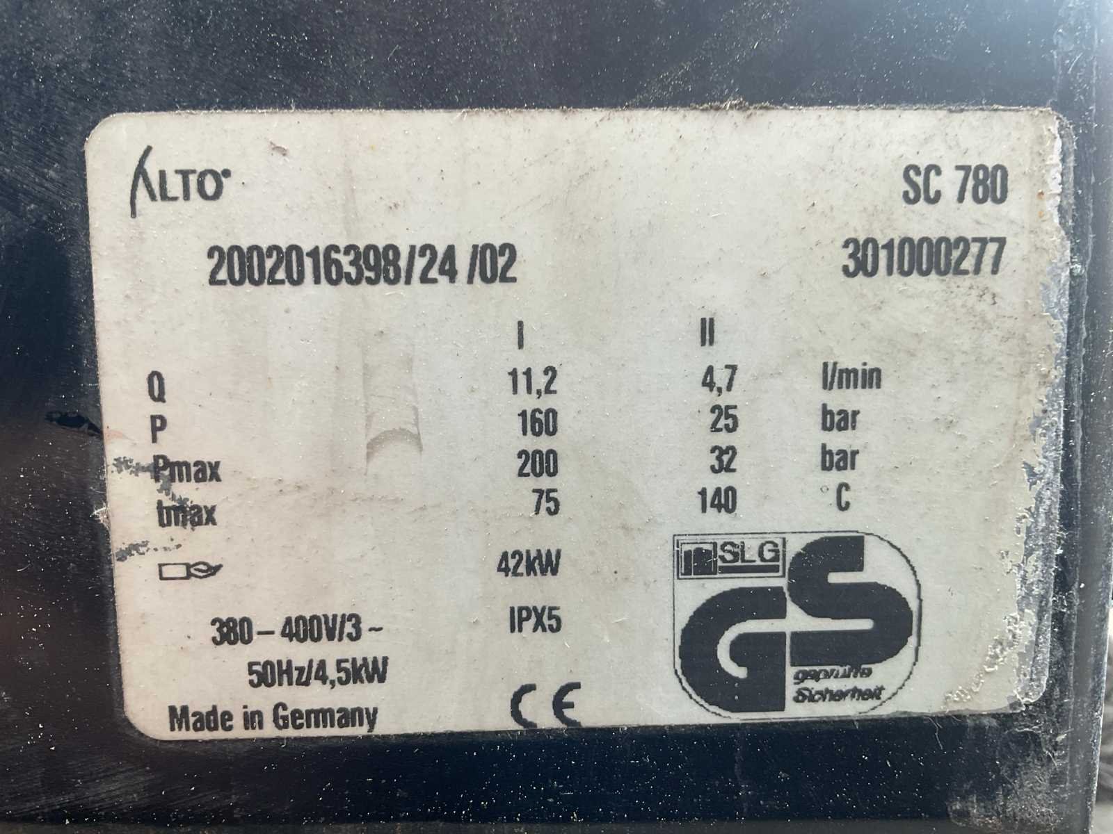 Merk: Alto Type: SC780 Serienummer: 301000277 Maximale werkdruk: 200bar Temperatuurbereik min.: 140°c Capaciteit.: 2500l/hr Dieselgestookt: true Mobiel: true Aansluiting: 400V