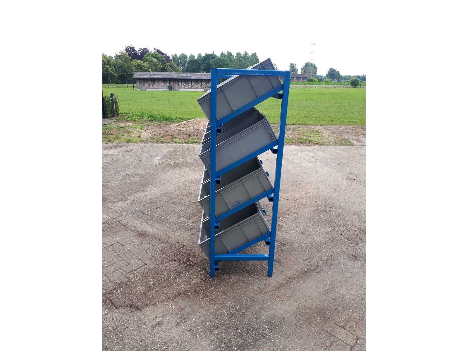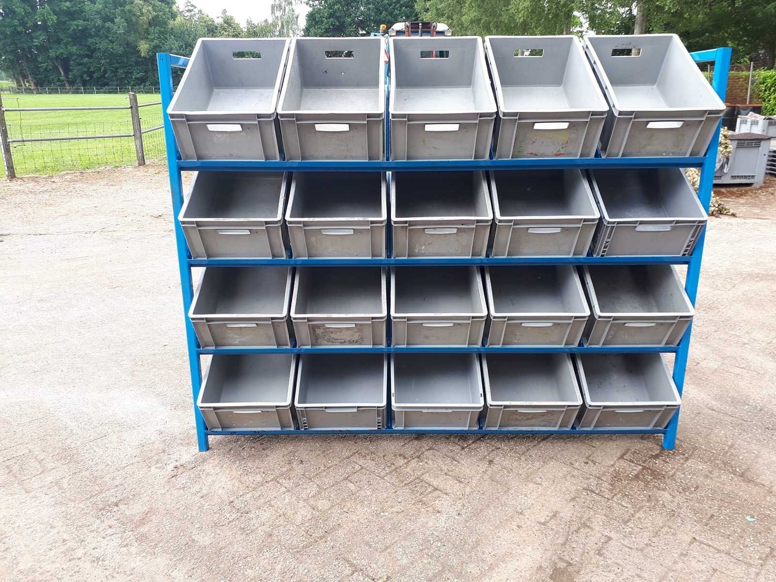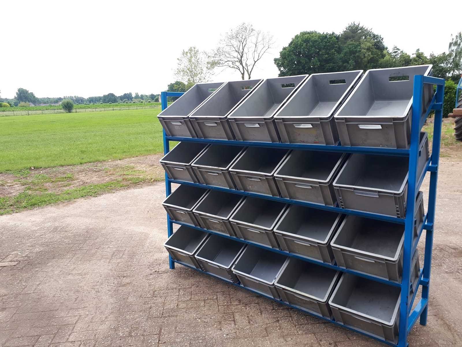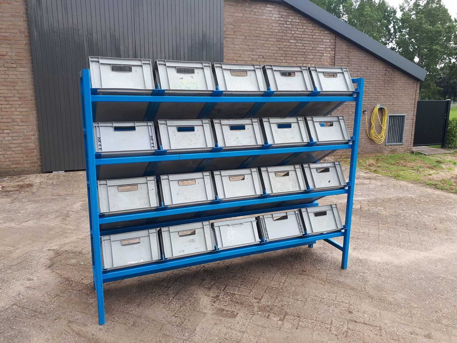 Stalen rek met 20x kunststof bak 60x40cm bakken zijn niet gereinigd als op foto Afmeting l: 55mm Afmeting b: 2150mm Afmeting h: 1700mm Staal: true Eigen gewicht: 200kg