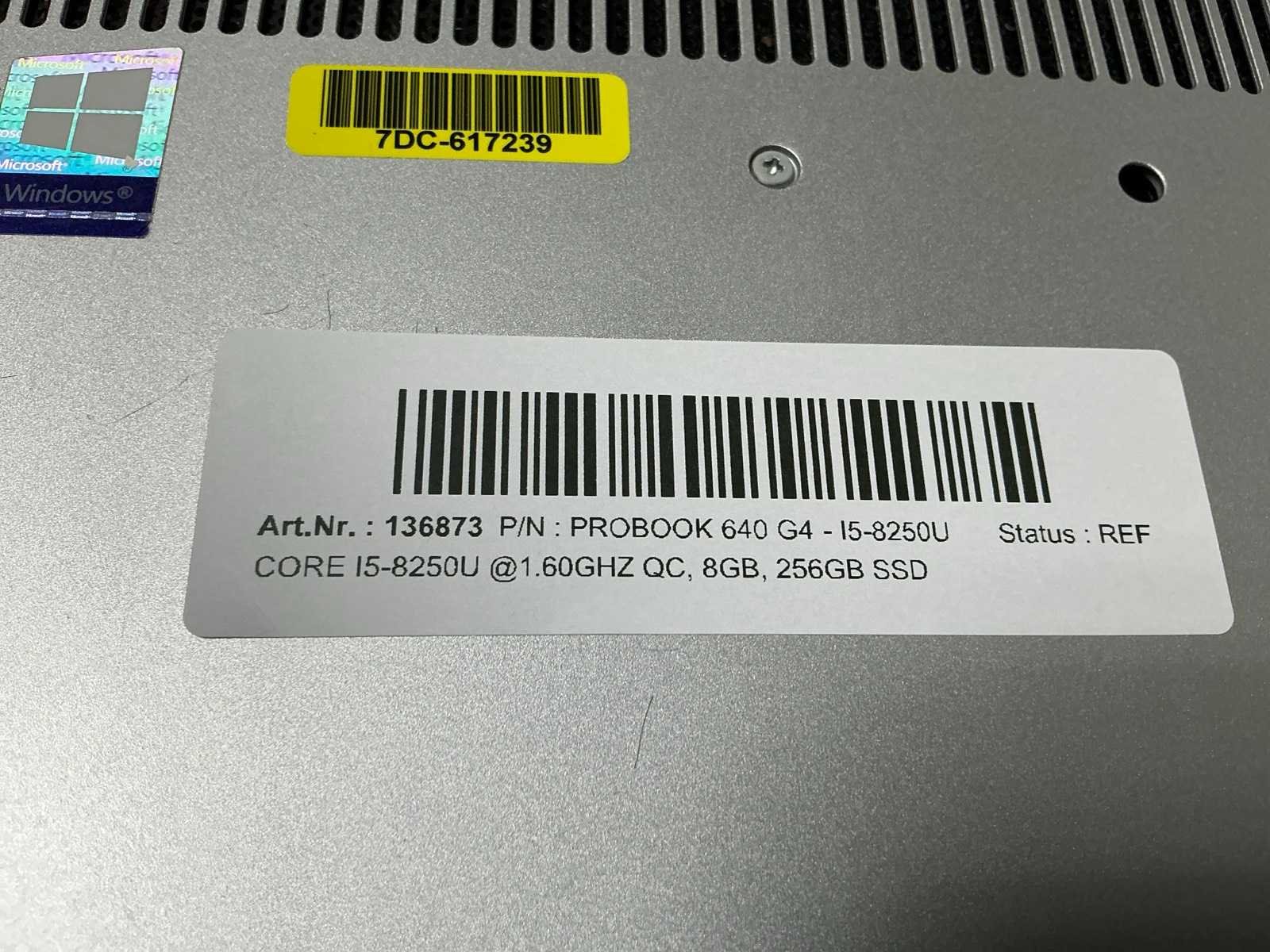Laptops, ProBook 640 G4, CPU : Intel Core I5-8250U @1.60GHz QC, MEM: 8GB, SSD :256GB, no adapter, damage bottem cover ( cleaned and tested ) [ID: 136873] Merk: HP